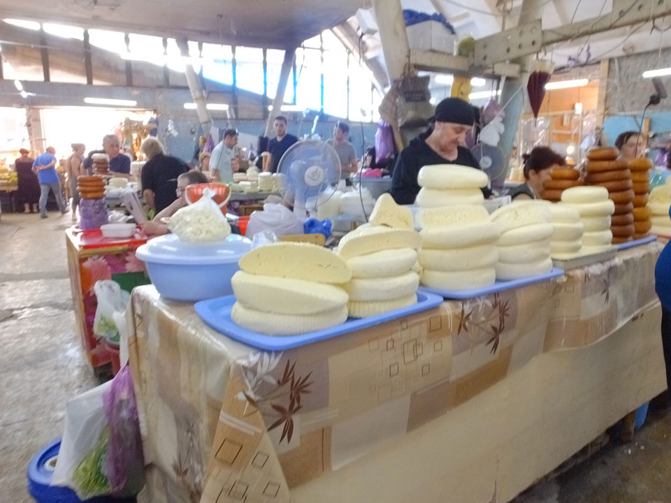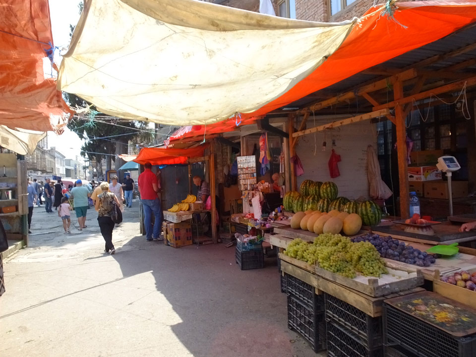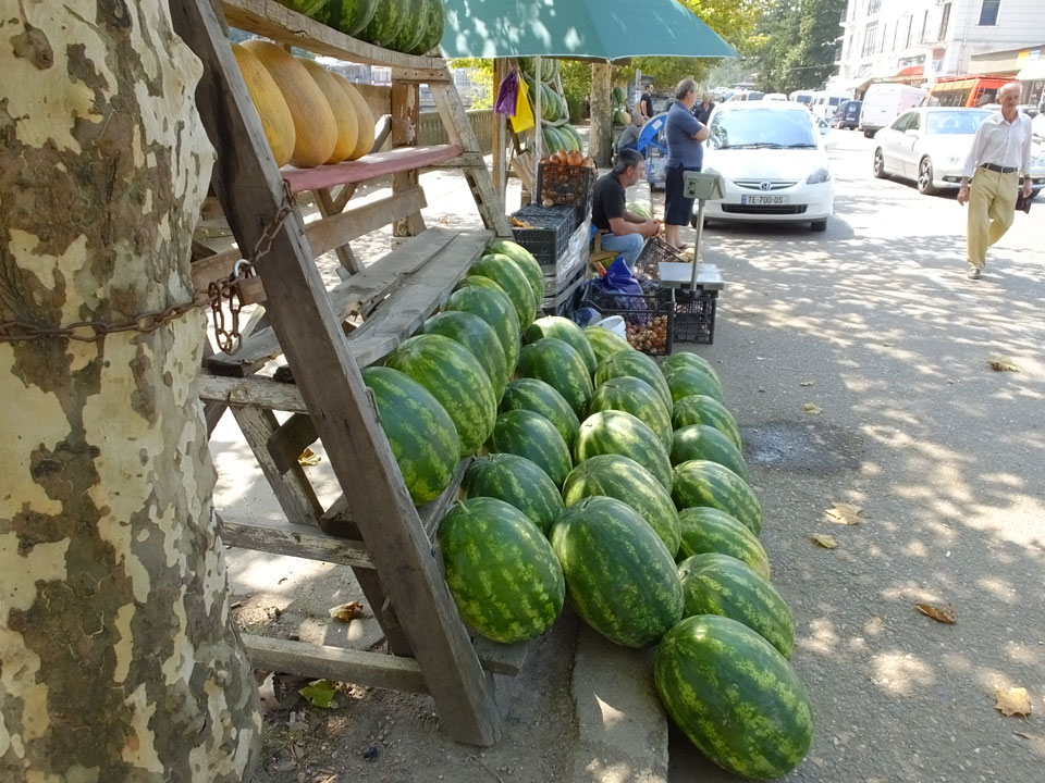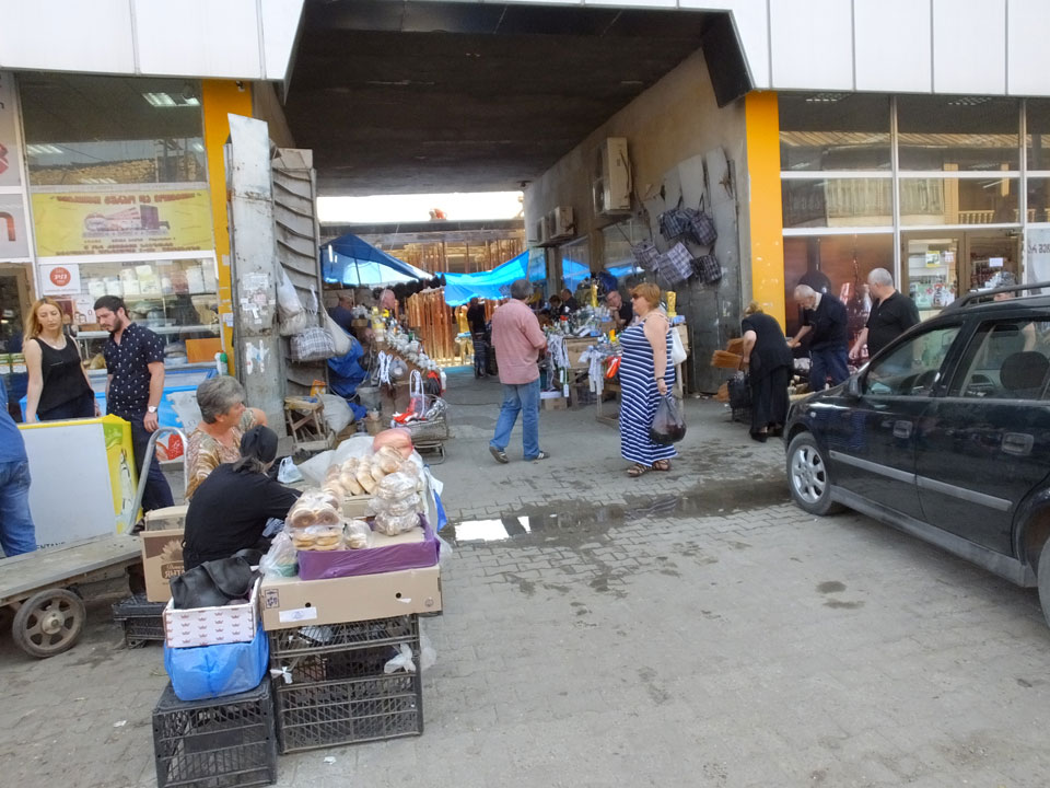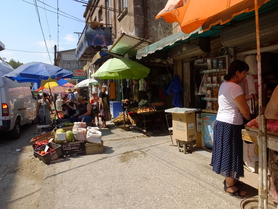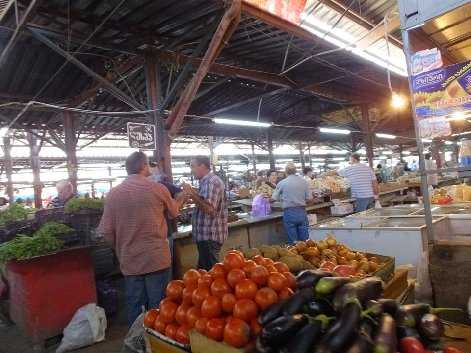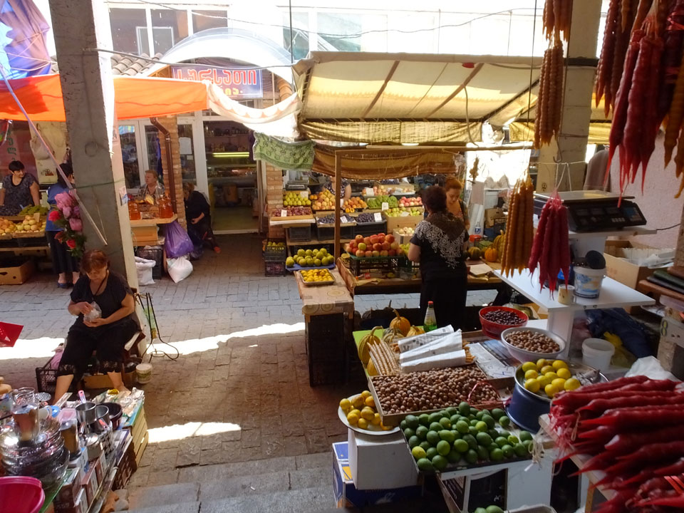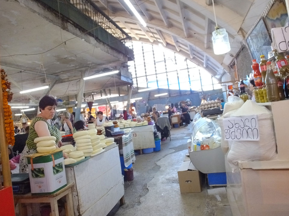 Runter dann wieer Richtung Stadt kam ich in belebte Teile Kutaisis. Eine Minibus-Bahnhof war da mit Markt und dann ein richtig großer Markt noch weiter wieder über der Brücke. Viel Käse, Gemüse und Fleisch. Ganz lokal, wobei hier kaum Leute mit großer Camera durch die Gegend stiefeln. Ich knipste locker aus der Hüfte und machte eher schnell. Die SD Karte voll und ich schließlich nach Hause.