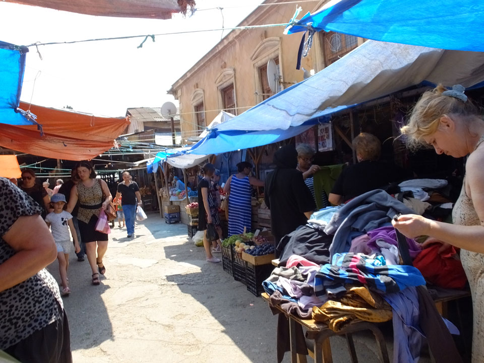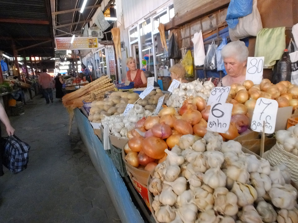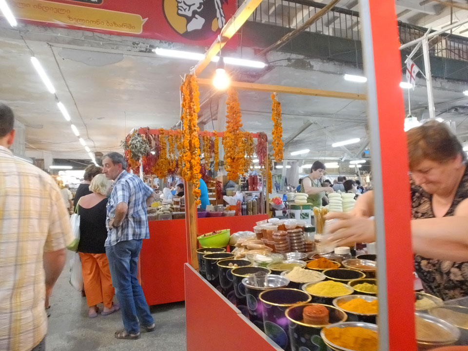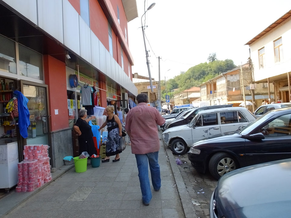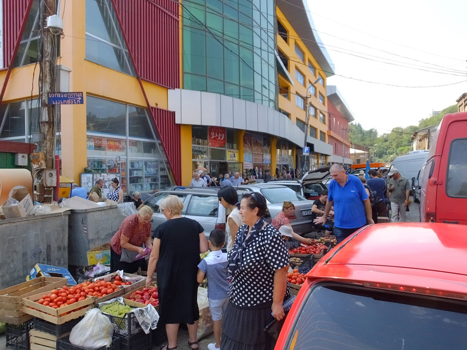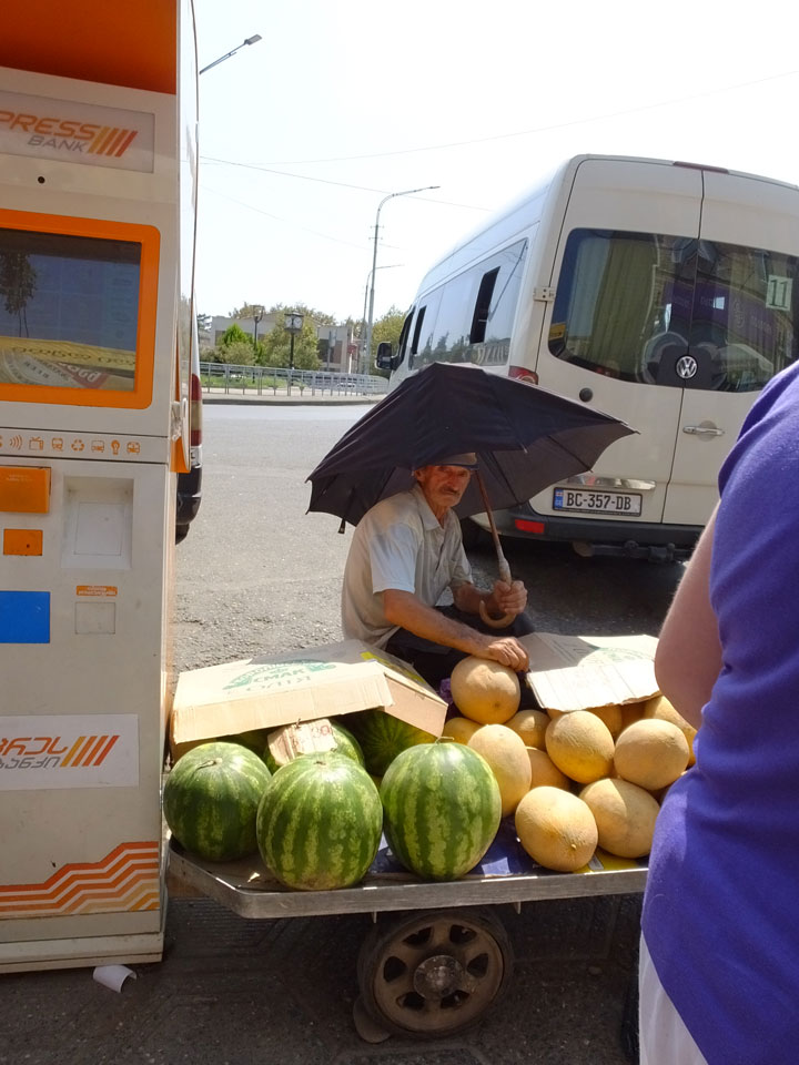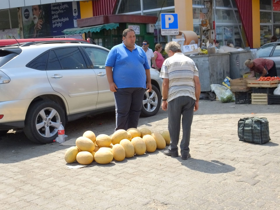 Runter dann wieer Richtung Stadt kam ich in belebte Teile Kutaisis. Eine Minibus-Bahnhof war da mit Markt und dann ein richtig großer Markt noch weiter wieder über der Brücke. Viel Käse, Gemüse und Fleisch. Ganz lokal, wobei hier kaum Leute mit großer Camera durch die Gegend stiefeln. Ich knipste locker aus der Hüfte und machte eher schnell. Die SD Karte voll und ich schließlich nach Hause.
