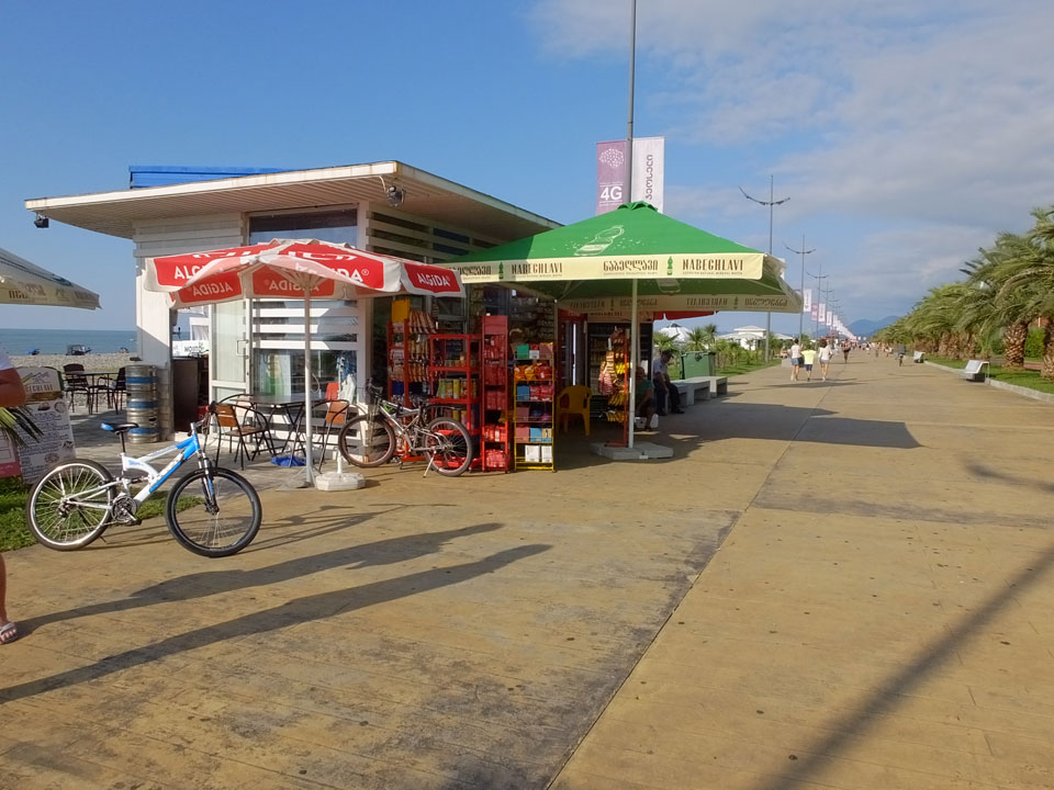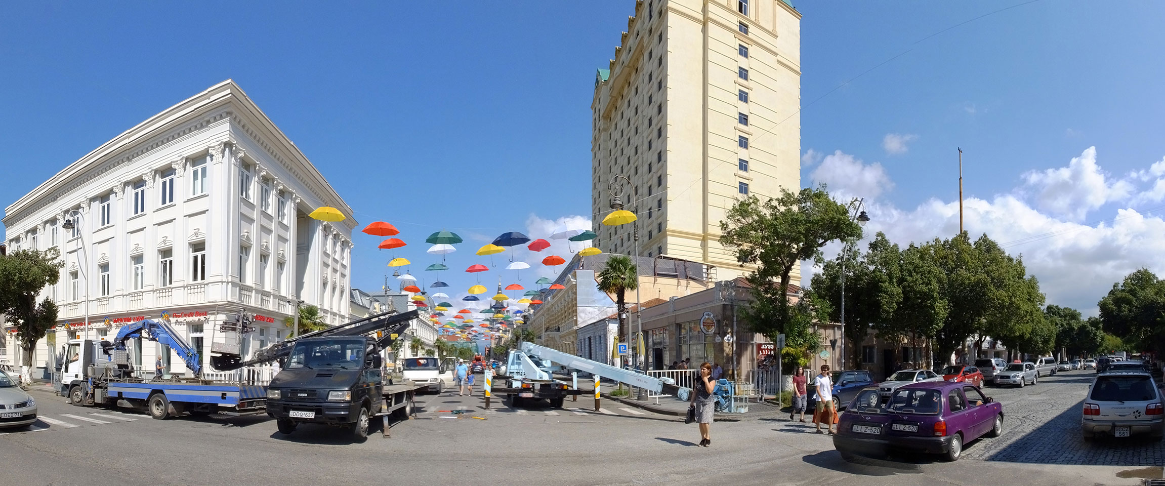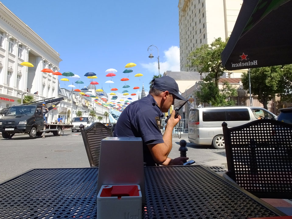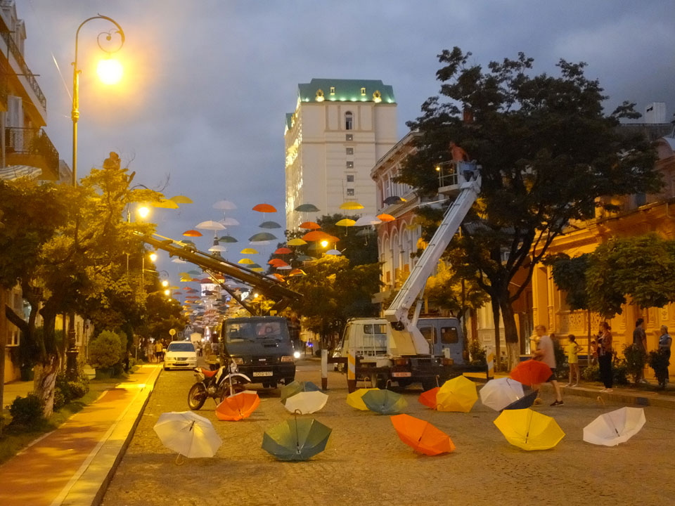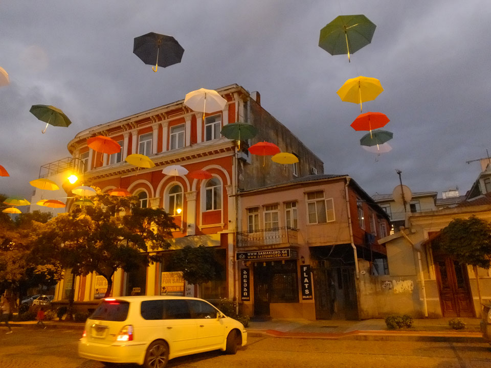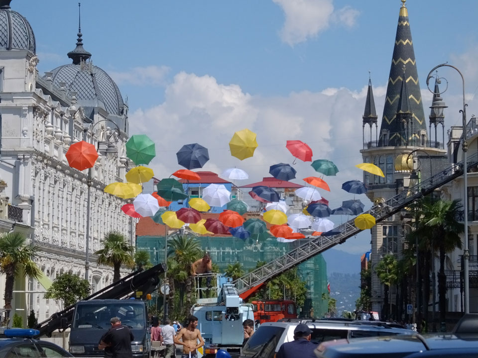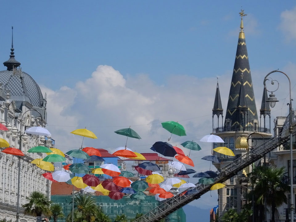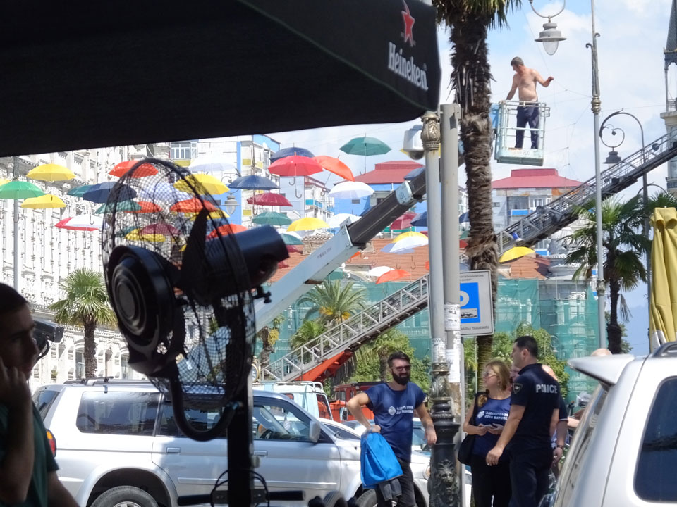 Heute ließ ich’s mir wieder gut gehen. Genug vom Sparfrühstück, ging ich mal im „Privet Iz Batumi“ essen. Omelett, Club Sandwich und Cappuccino für 20 (+10%) – also 22 Lari = €8,60. Auf der Straße wurden Schirme aufgehängt, sieht immer nett aus.