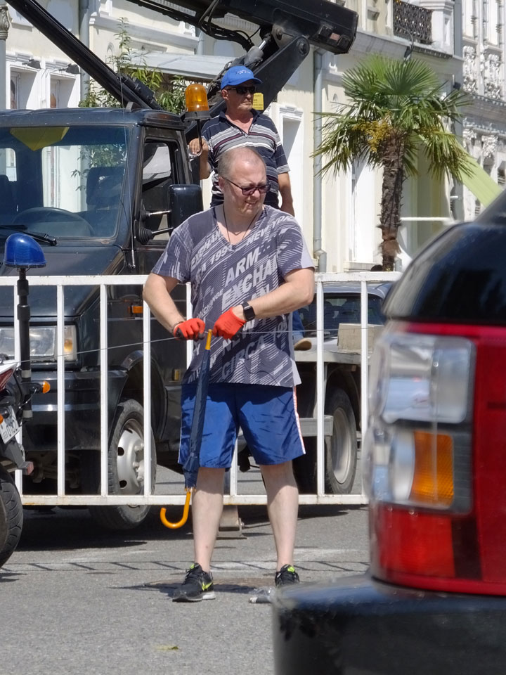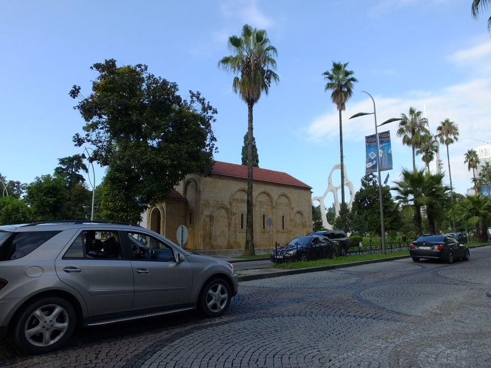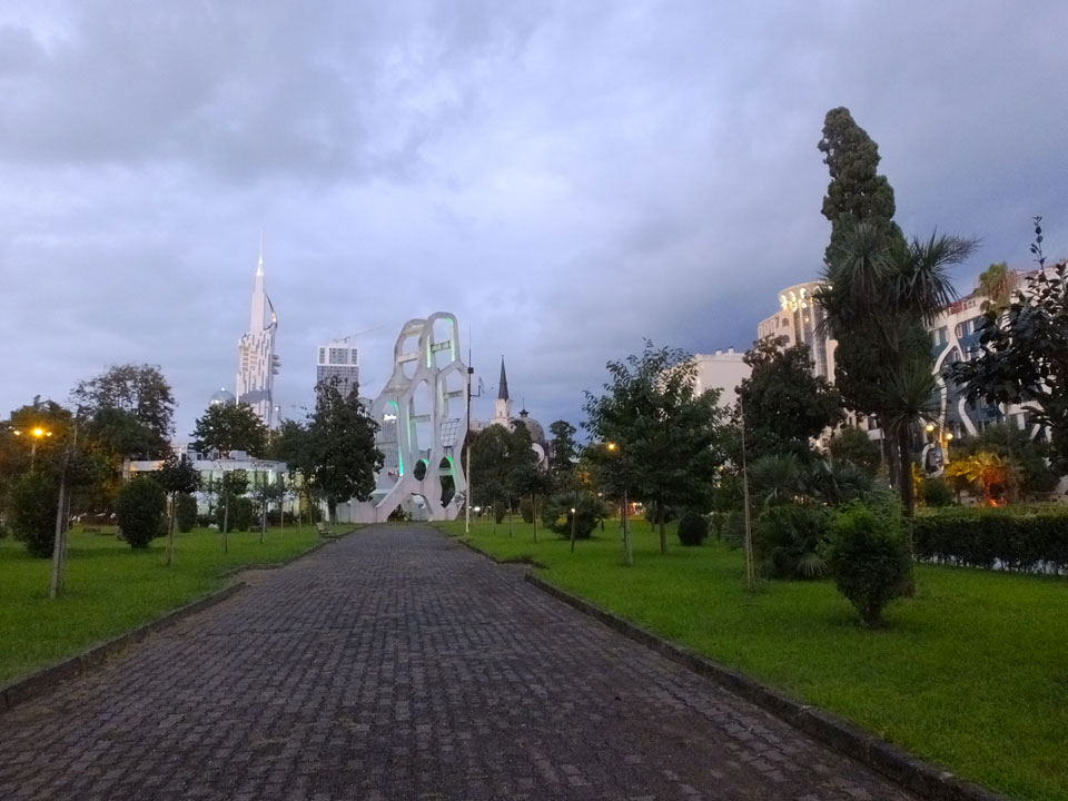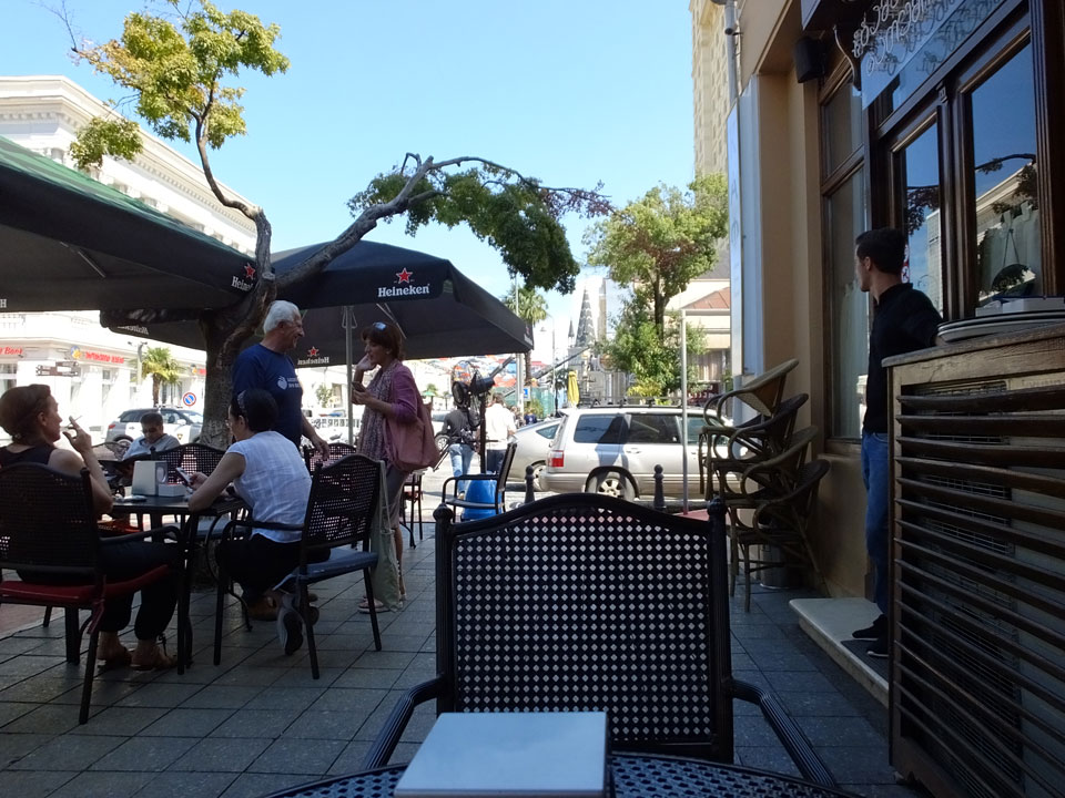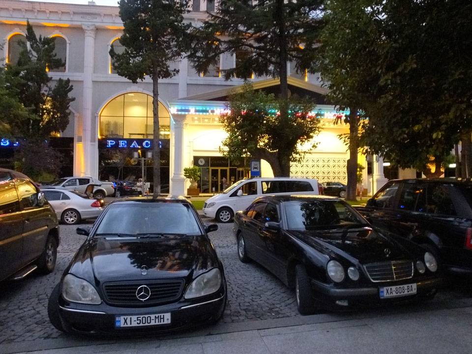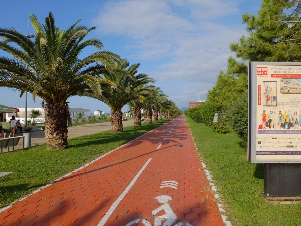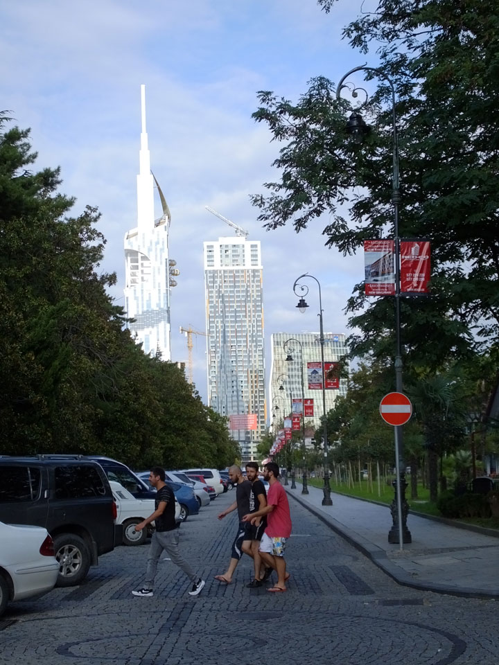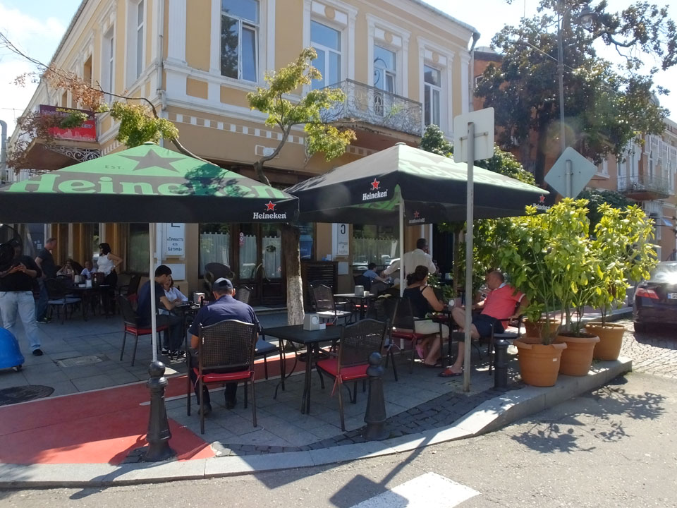 Heute ließ ich’s mir wieder gut gehen. Genug vom Sparfrühstück, ging ich mal im „Privet Iz Batumi“ essen. Omelett, Club Sandwich und Cappuccino für 20 (+10%) – also 22 Lari = €8,60. Auf der Straße wurden Schirme aufgehängt, sieht immer nett aus.