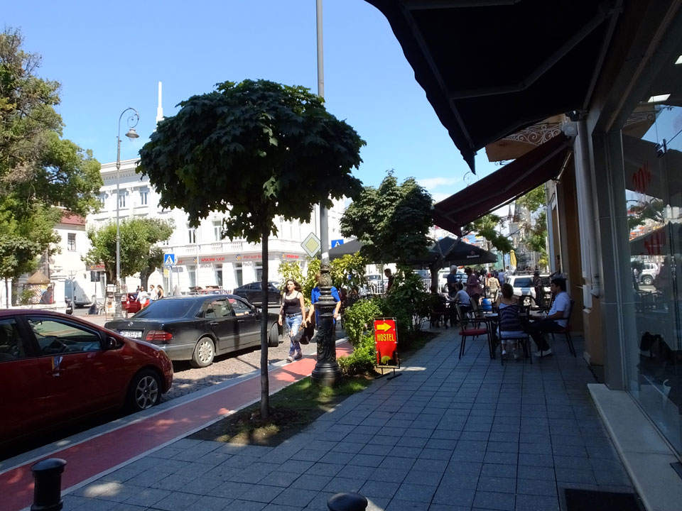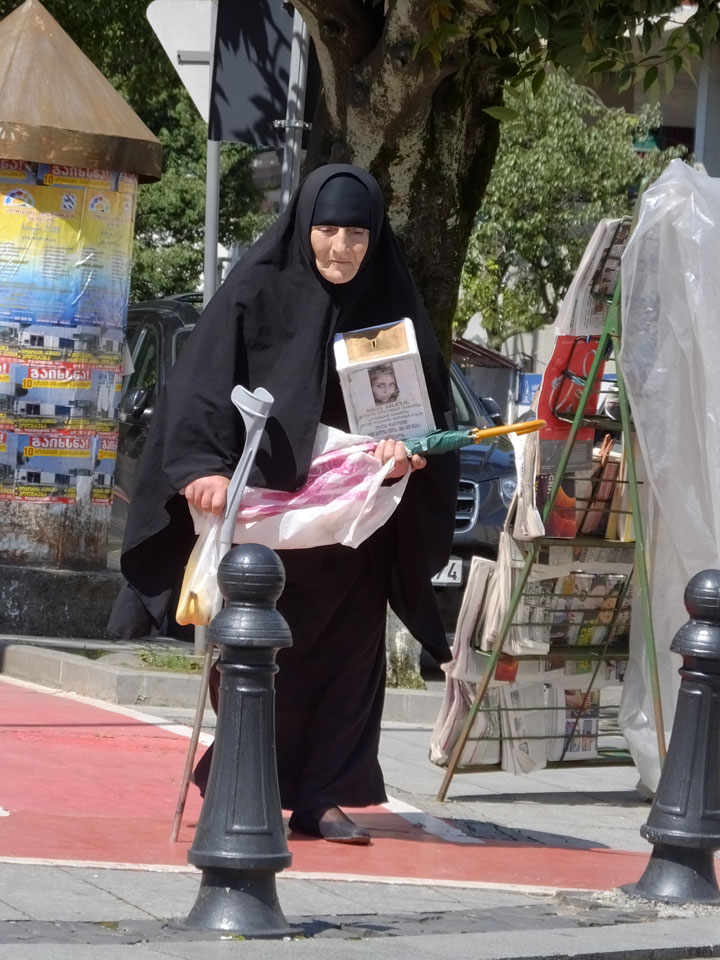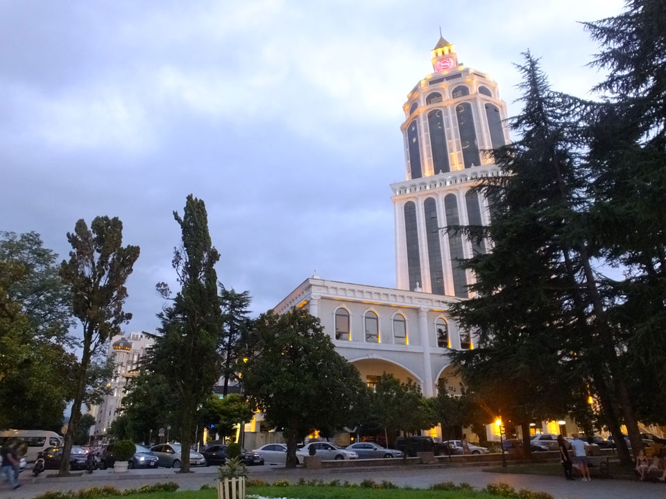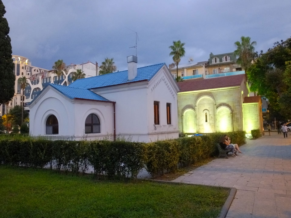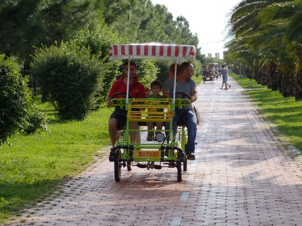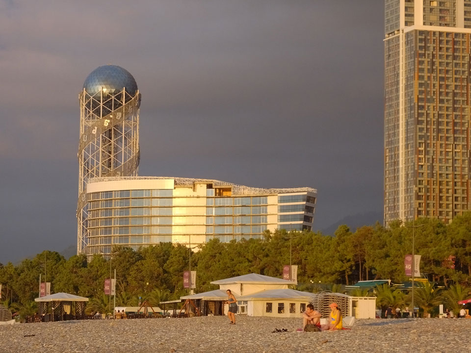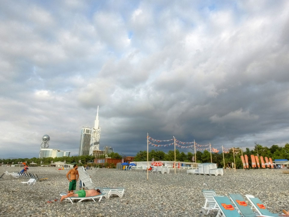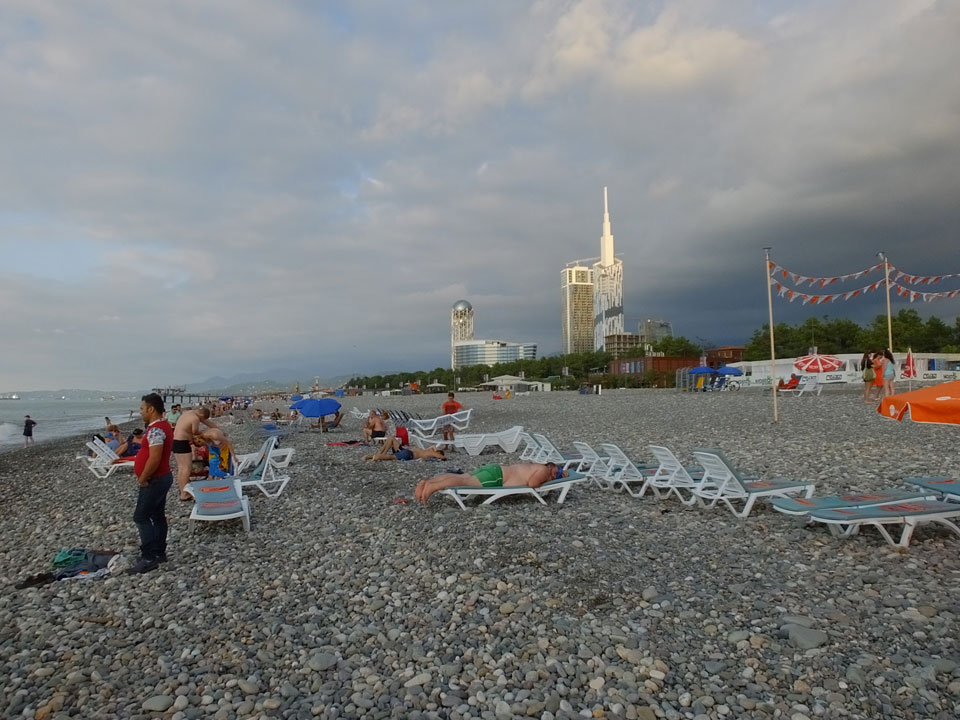 Heute ließ ich’s mir wieder gut gehen. Genug vom Sparfrühstück, ging ich mal im „Privet Iz Batumi“ essen. Omelett, Club Sandwich und Cappuccino für 20 (+10%) – also 22 Lari = €8,60. Auf der Straße wurden Schirme aufgehängt, sieht immer nett aus.