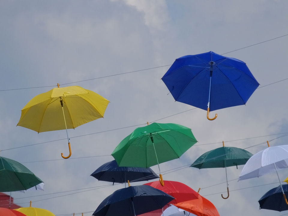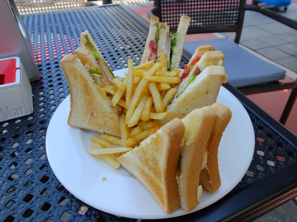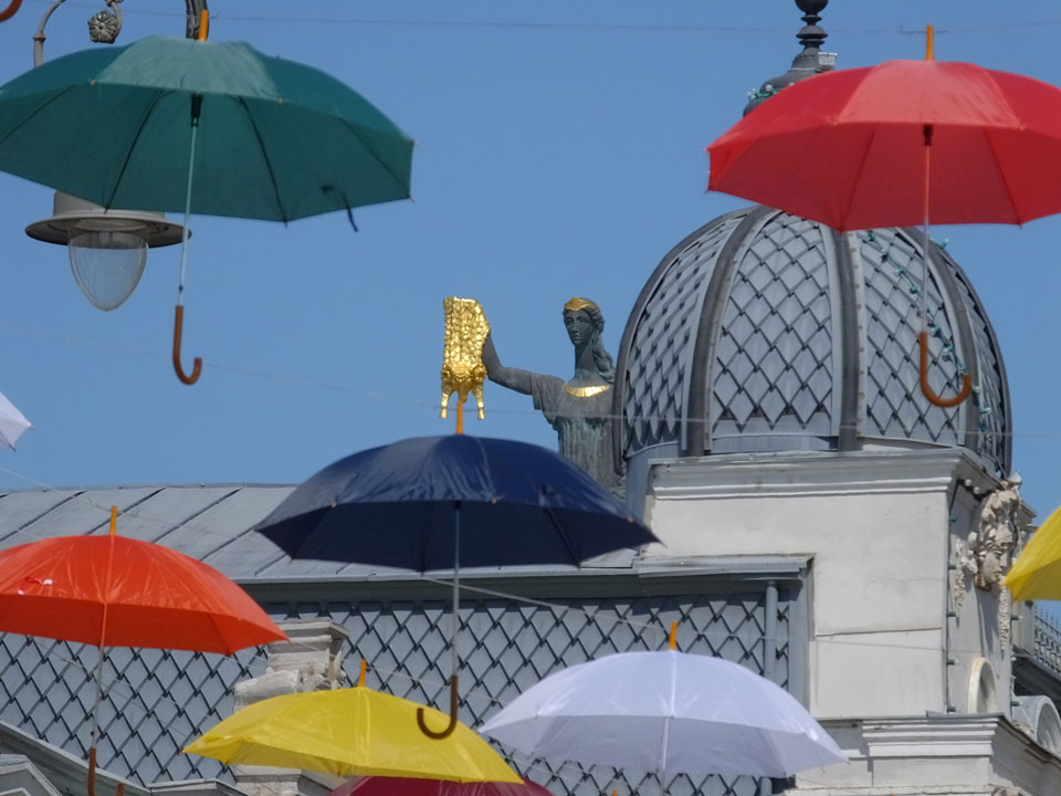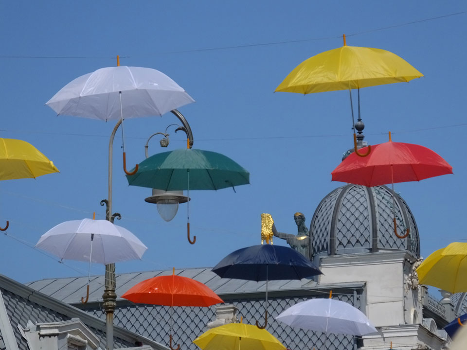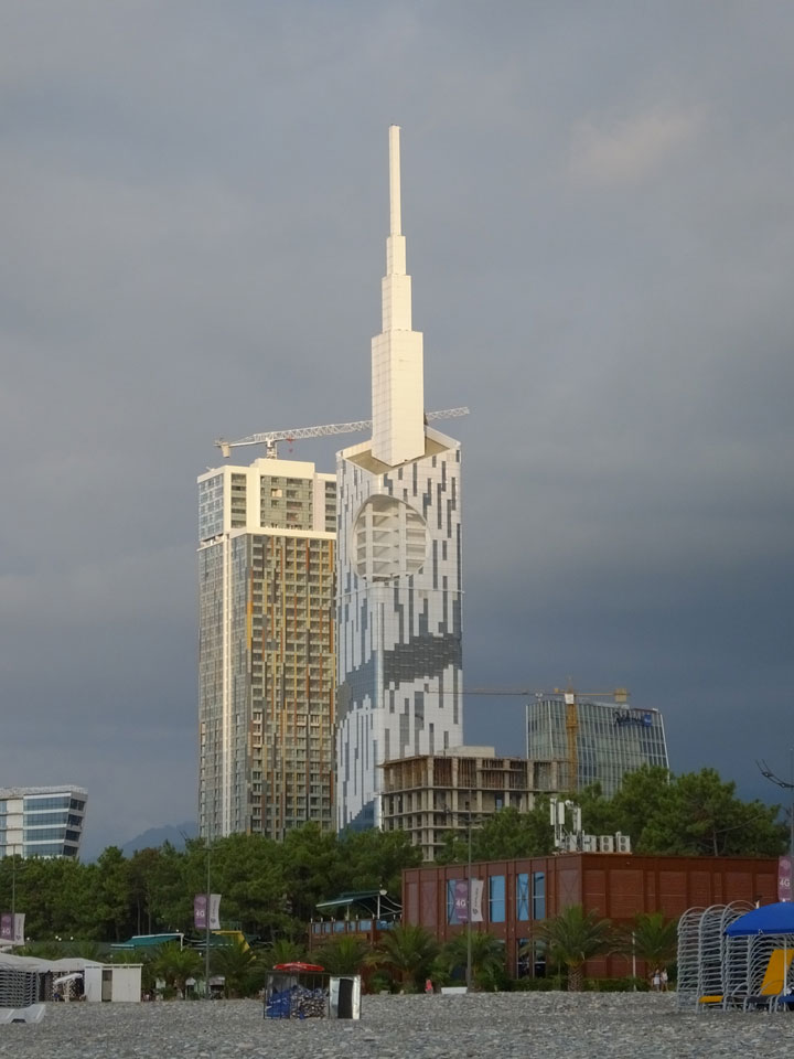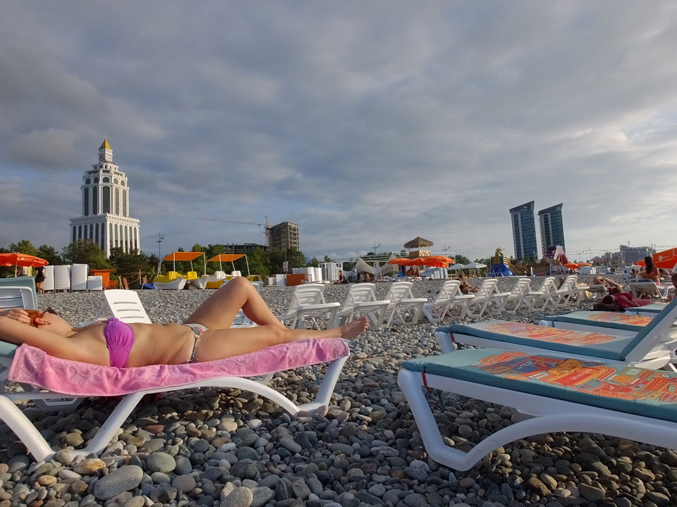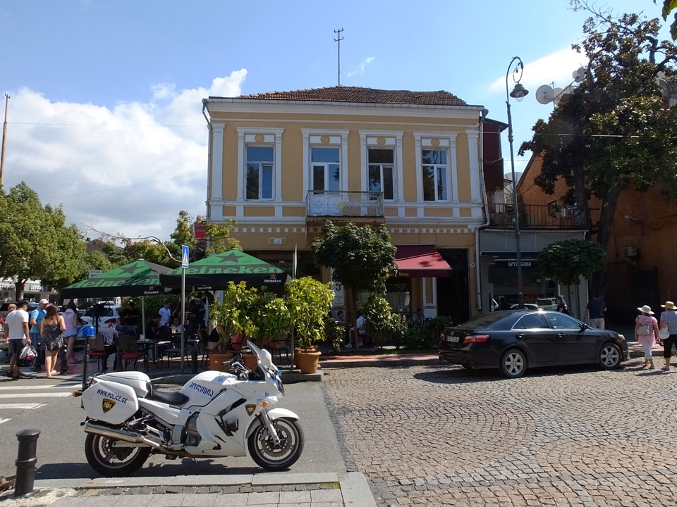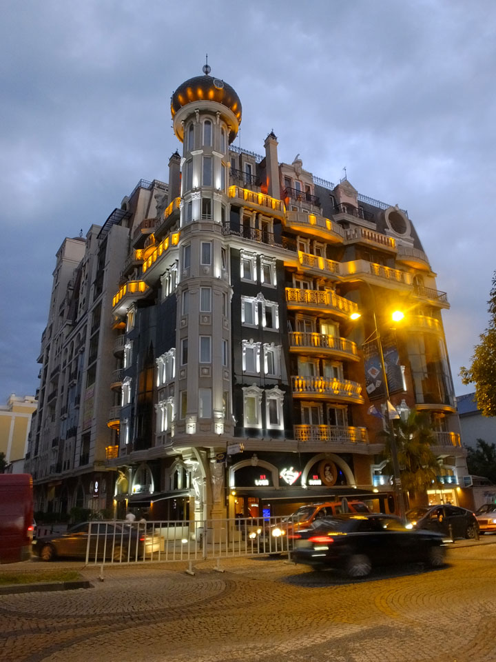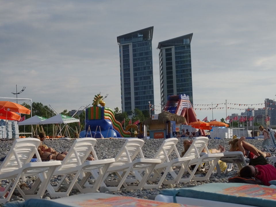 Heute ließ ich’s mir wieder gut gehen. Genug vom Sparfrühstück, ging ich mal im „Privet Iz Batumi“ essen. Omelett, Club Sandwich und Cappuccino für 20 (+10%) – also 22 Lari = €8,60. Auf der Straße wurden Schirme aufgehängt, sieht immer nett aus.