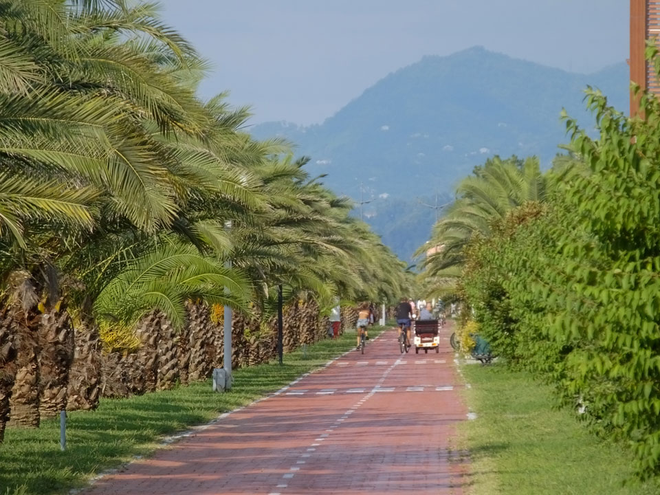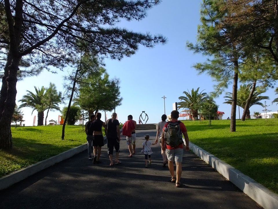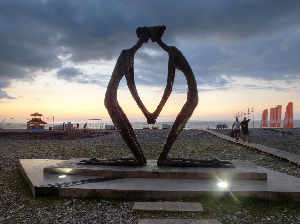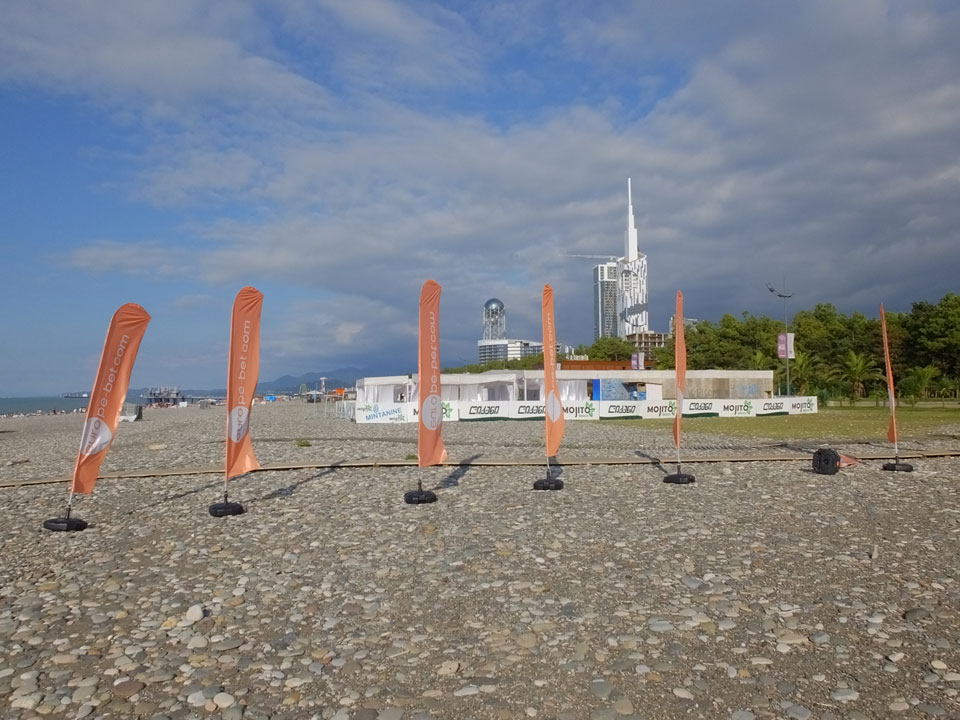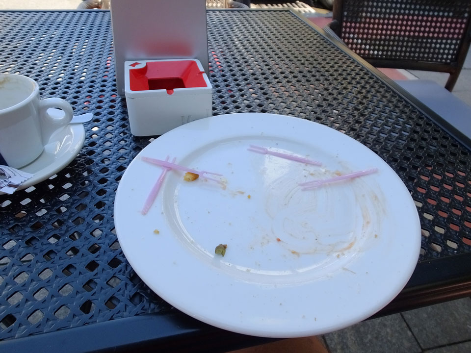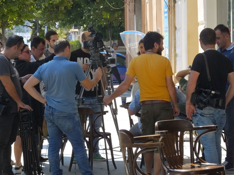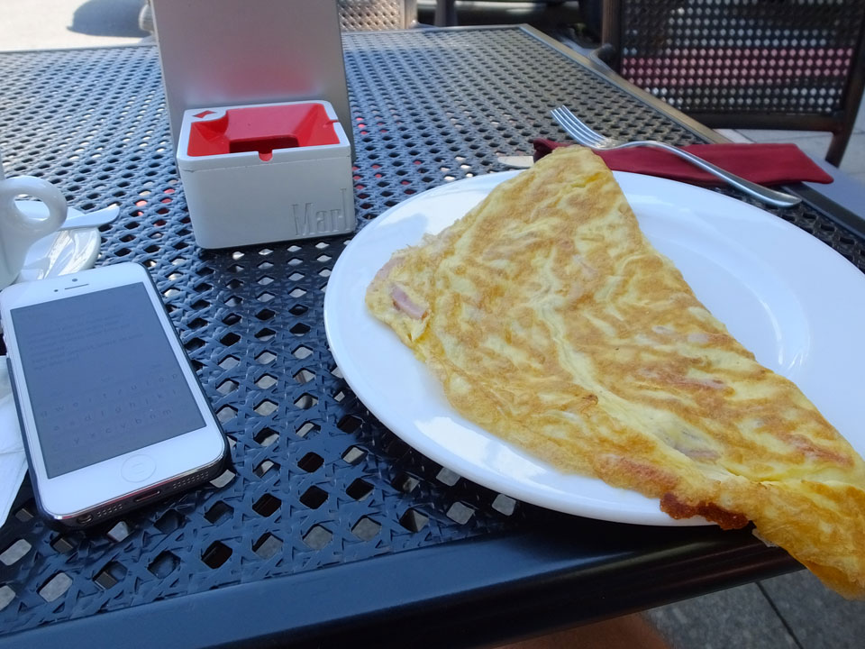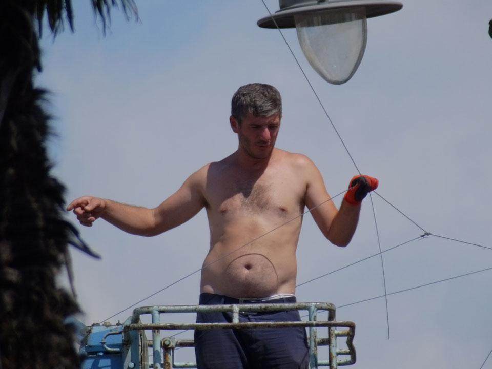 Heute ließ ich’s mir wieder gut gehen. Genug vom Sparfrühstück, ging ich mal im „Privet Iz Batumi“ essen. Omelett, Club Sandwich und Cappuccino für 20 (+10%) – also 22 Lari = €8,60. Auf der Straße wurden Schirme aufgehängt, sieht immer nett aus.