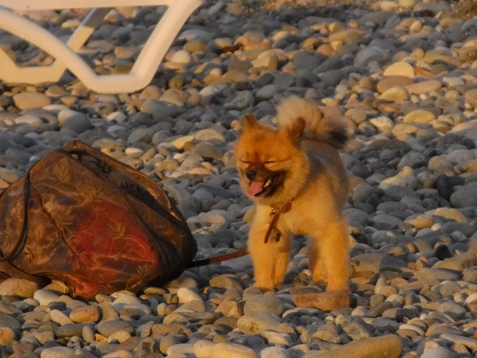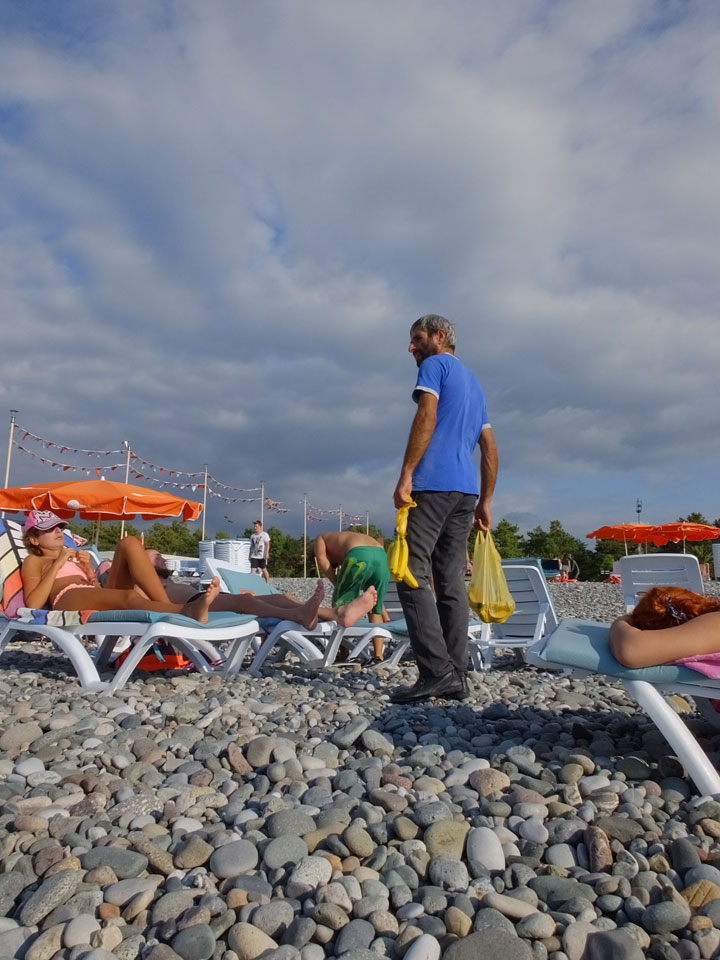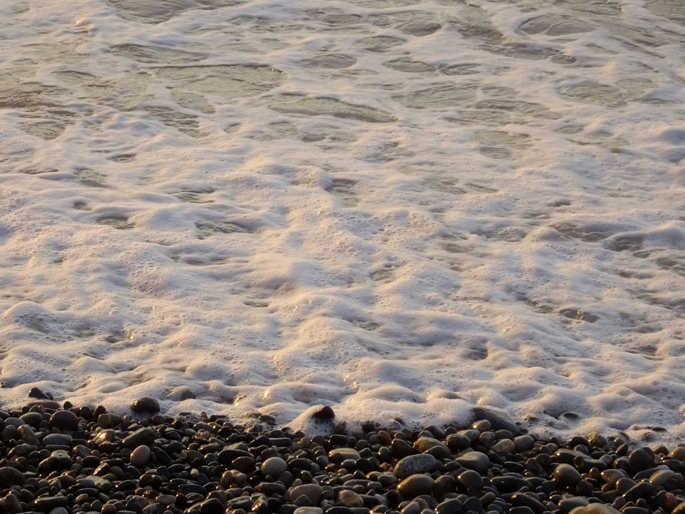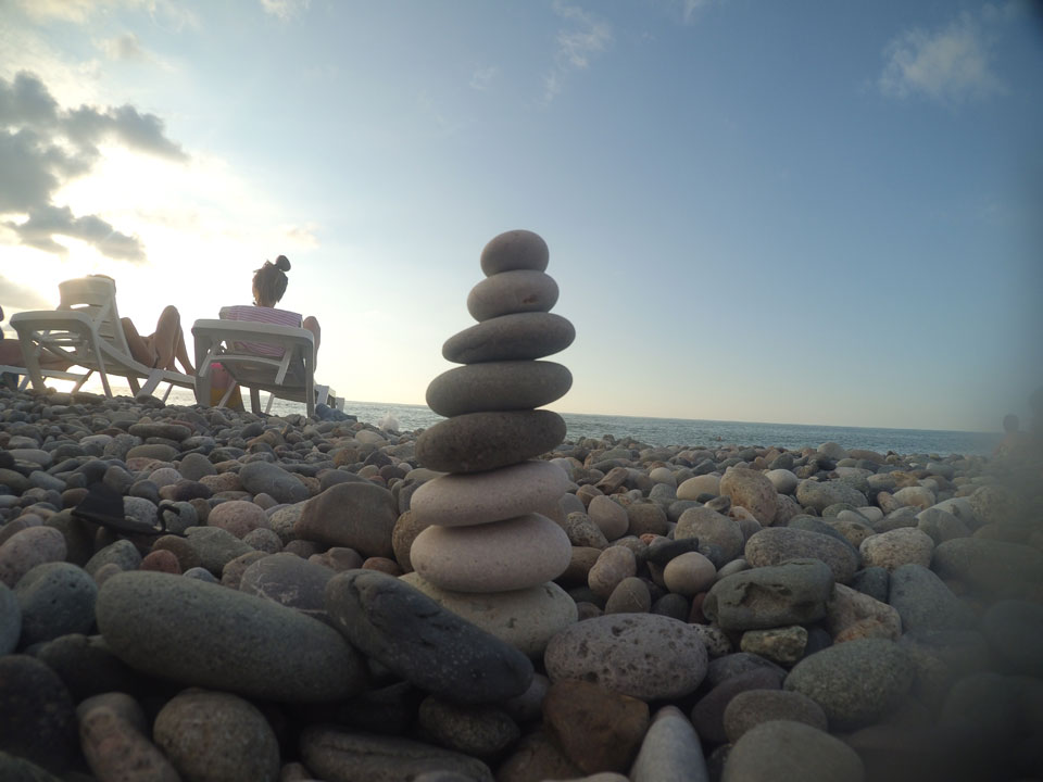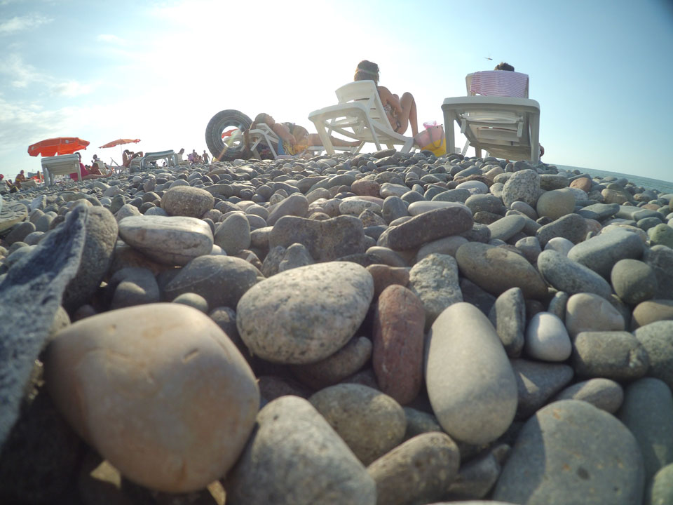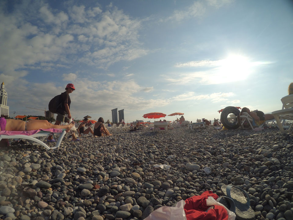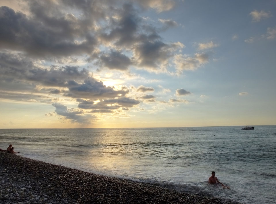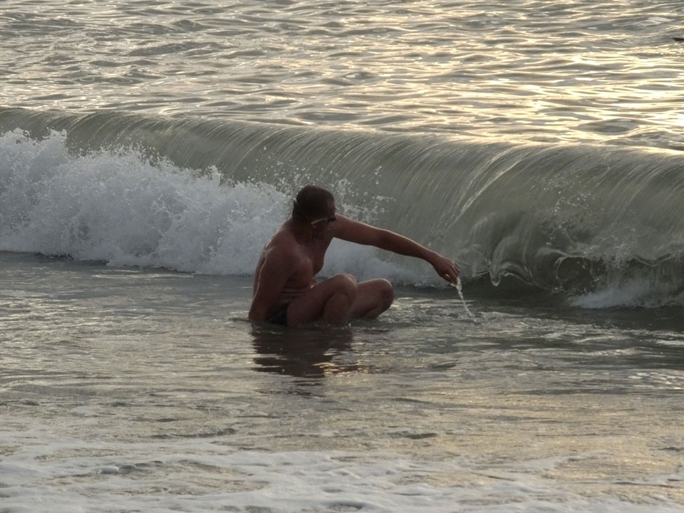 Nach etwas Video-Bearbeitung ging ich um 5 an den Strand. Die Steine sind hart und herumliegen entsprechend unbequem. Ich hüpfte zwei Mal in die Wellen und wartete bis zum Sonnenuntergang. Alles nett hier. Einige alte Frauen betteln, viele wandernde Händler verkaufen von Bananen bis Bier und Nüsse einiges. Schwimmschuhe wären hier was, ha!