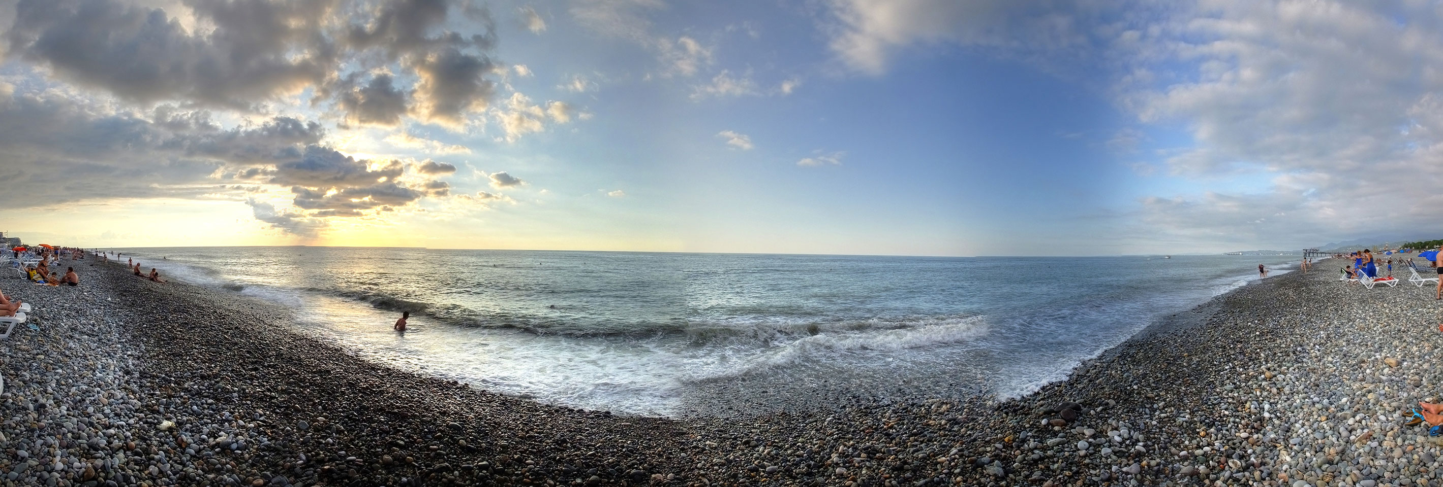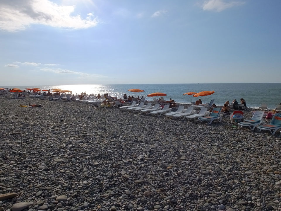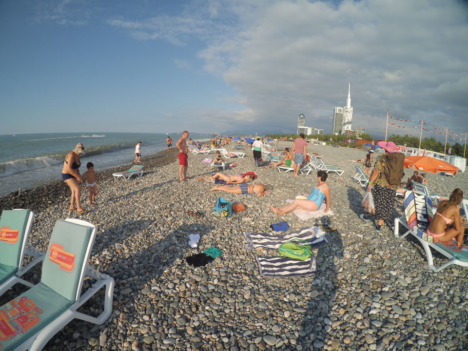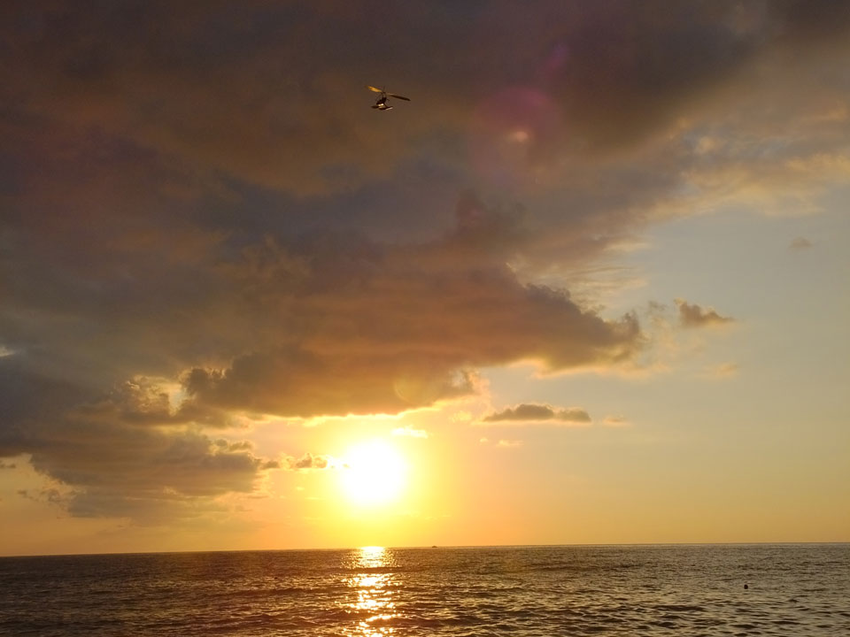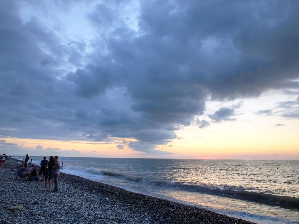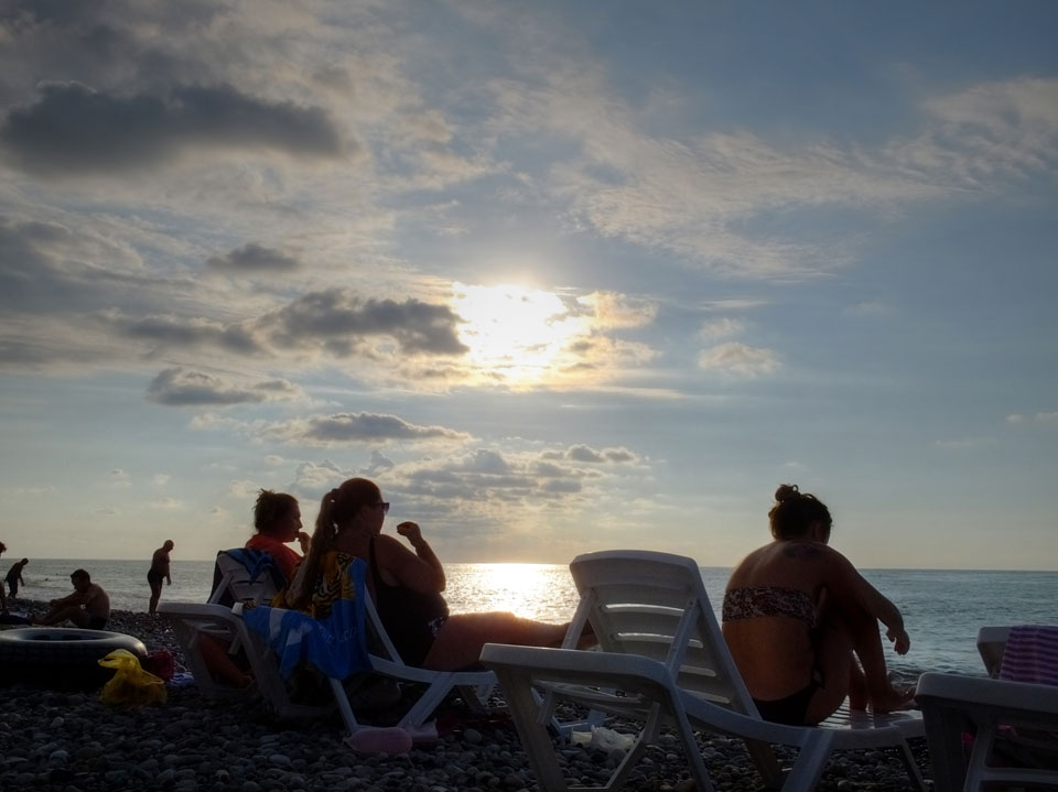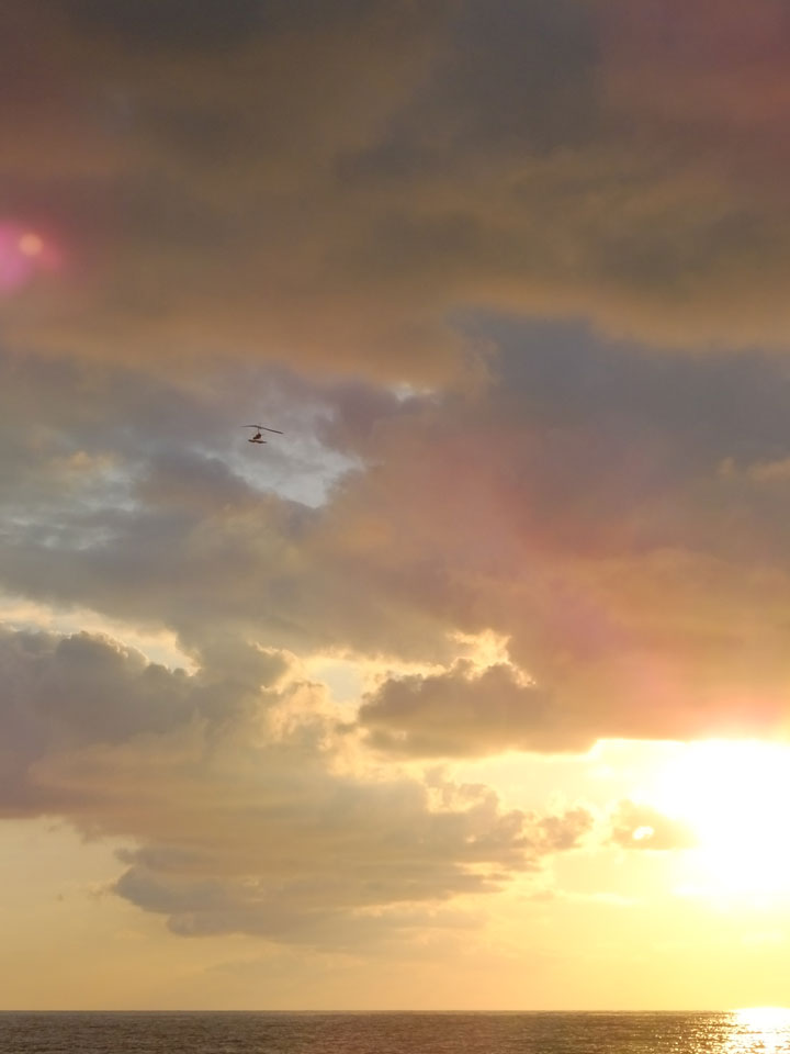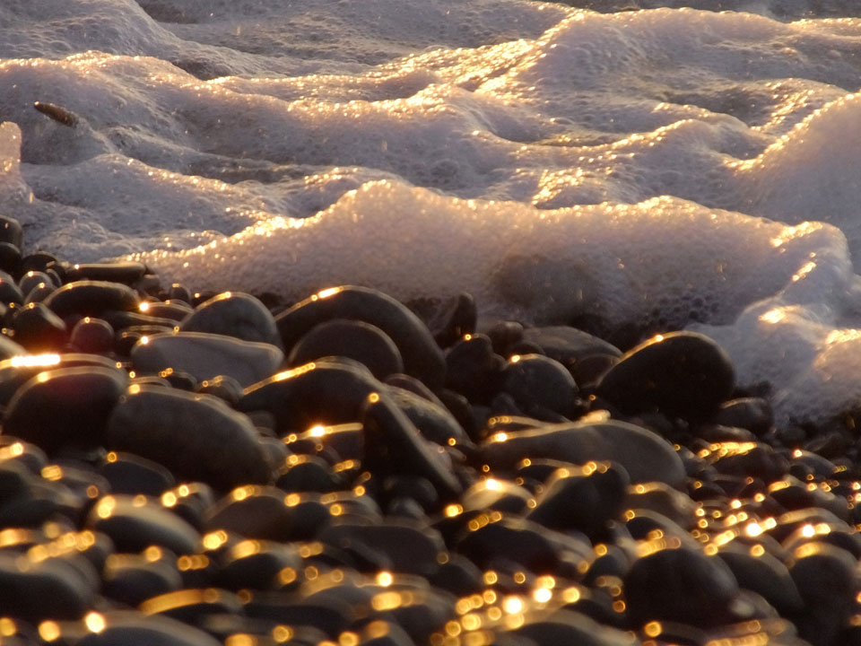 Nach etwas Video-Bearbeitung ging ich um 5 an den Strand. Die Steine sind hart und herumliegen entsprechend unbequem. Ich hüpfte zwei Mal in die Wellen und wartete bis zum Sonnenuntergang. Alles nett hier. Einige alte Frauen betteln, viele wandernde Händler verkaufen von Bananen bis Bier und Nüsse einiges. Schwimmschuhe wären hier was, ha!