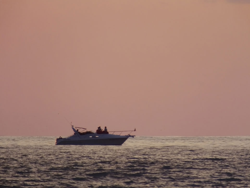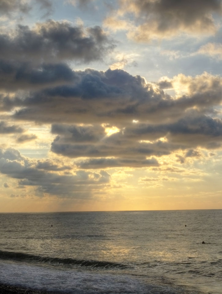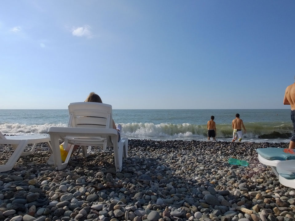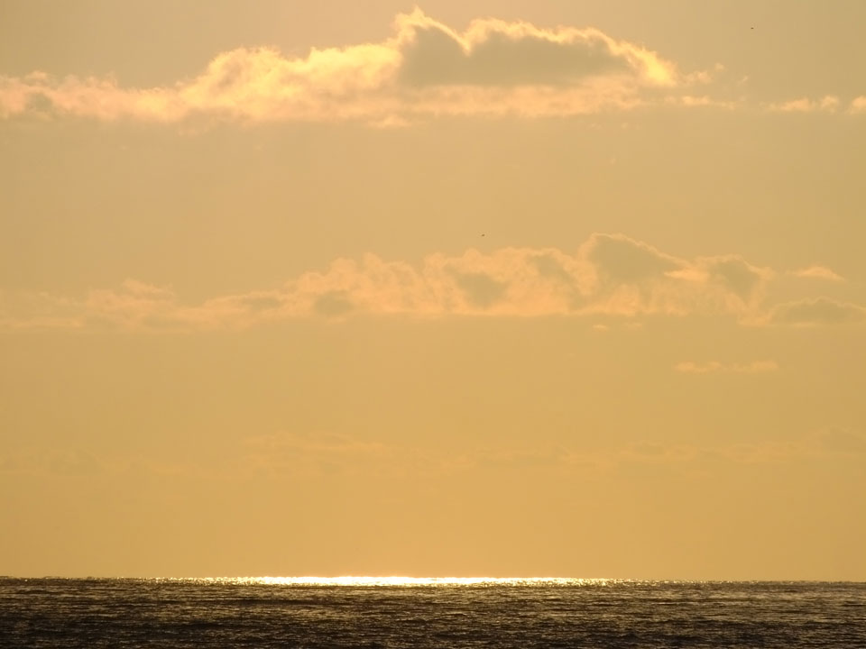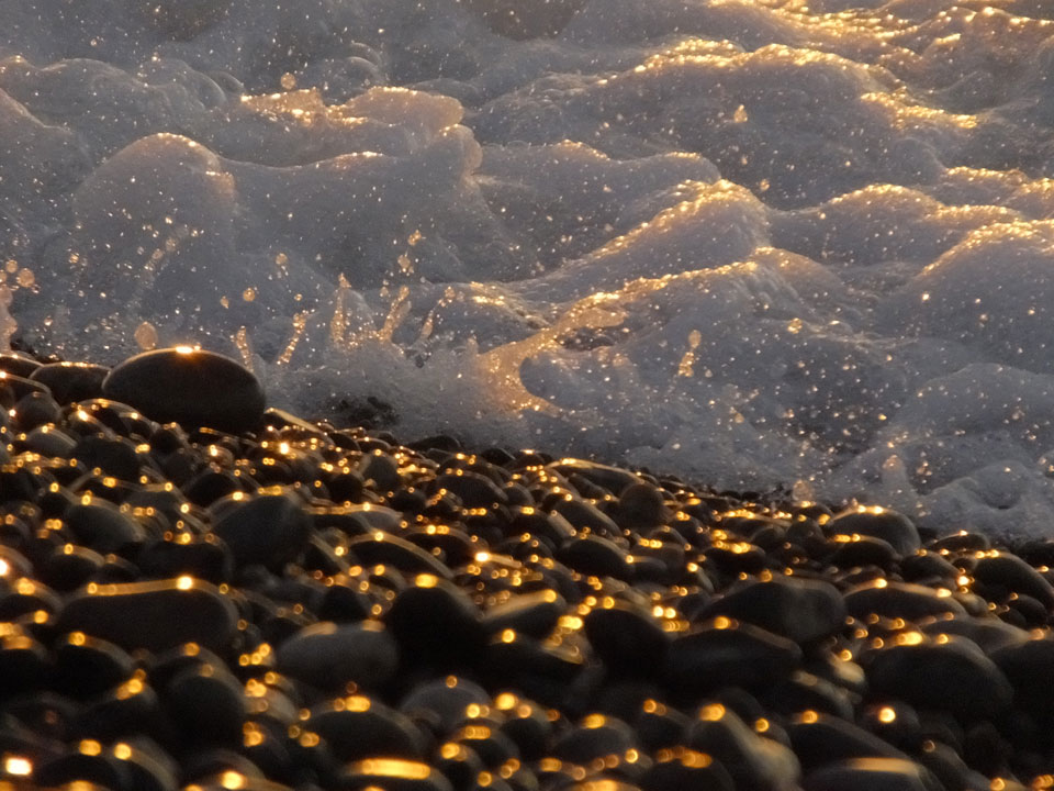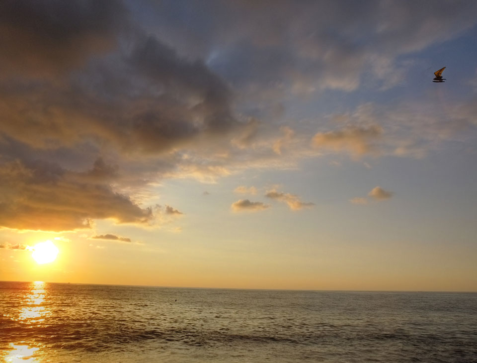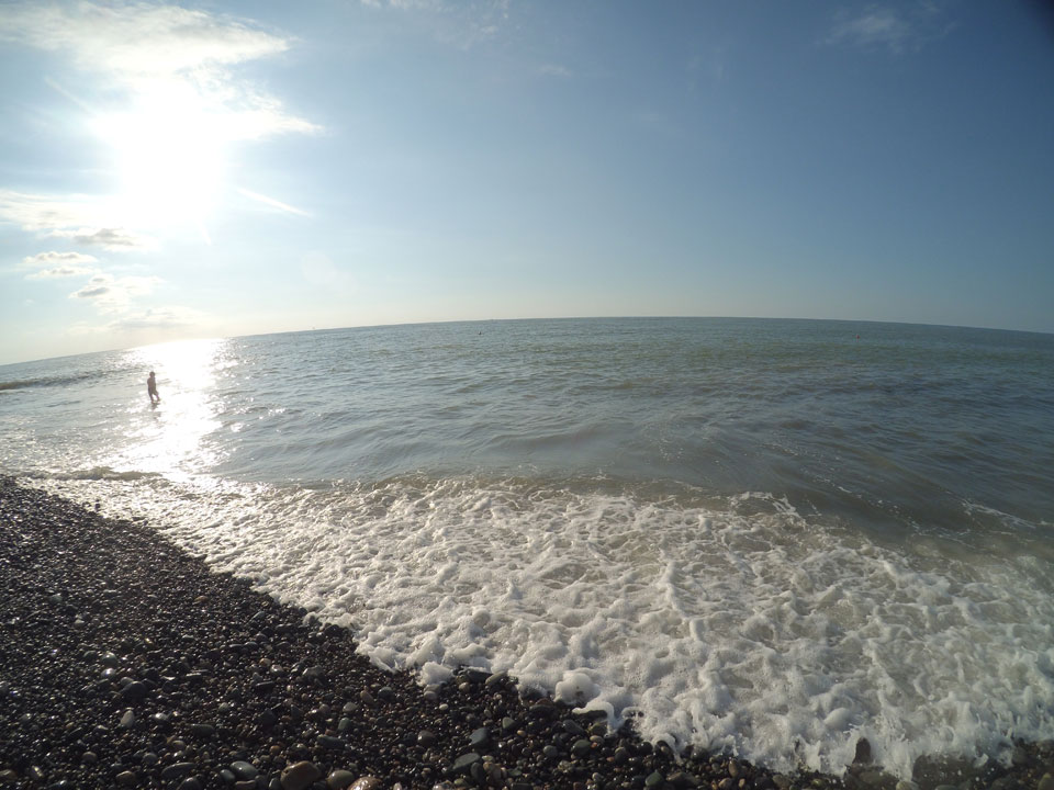 Nach etwas Video-Bearbeitung ging ich um 5 an den Strand. Die Steine sind hart und herumliegen entsprechend unbequem. Ich hüpfte zwei Mal in die Wellen und wartete bis zum Sonnenuntergang. Alles nett hier. Einige alte Frauen betteln, viele wandernde Händler verkaufen von Bananen bis Bier und Nüsse einiges. Schwimmschuhe wären hier was, ha!