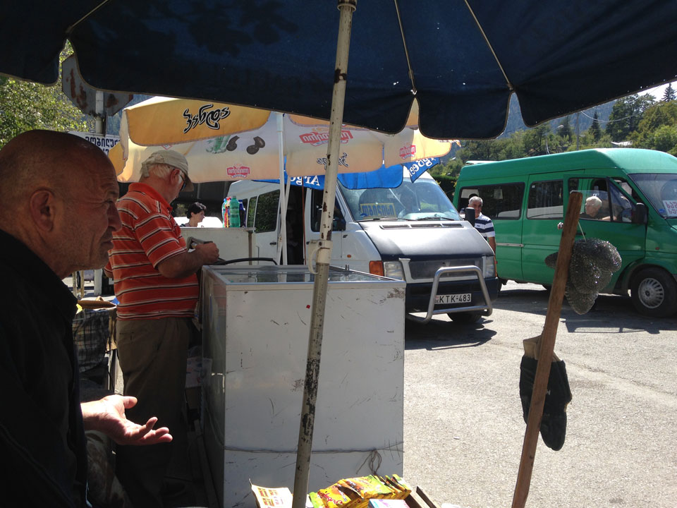 Gegen 13:00 war ich am Bushaltepunkt. Ein Minibus nach Gori sollte 13:45 fahren. Genügend Zeit also und so kam ich nochmals zu einer Shwarma im „Fast Food“ da. Informationen aus Deutschland zu einer Geburt trafen ein.