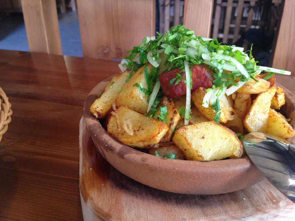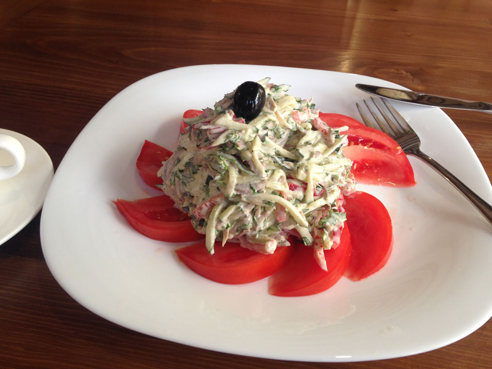 Um 13:08 war ich dort, fragte nach dem Bus, doch der nächste sollte erst 15:00 fahren. Ich wusste vom Zweistundentakt und suchte mir erst mal ein Restaurant zu hinsetzen. Ich fand ein echt gutes mit Hotel und schnellem Internet. Salat und dann Kartoffel / Schweinepfanne mit Kaffee. Alles bestens und die Zeit verging fast zu schnell. Halb 3 ging ich zurück zur Marshrutka, bekam einen Platz. Selbst die Notsitze wurde schließlich besetzt. Ab ging die Fahrt nach einer Starthilfe. Landstraße durch die Dörfer. Ich war heute fertig, doch jetzt folgt eigentlich die restliche Zeit ein Zweitages-Takt, der mir etwas Bedenken bereitet.