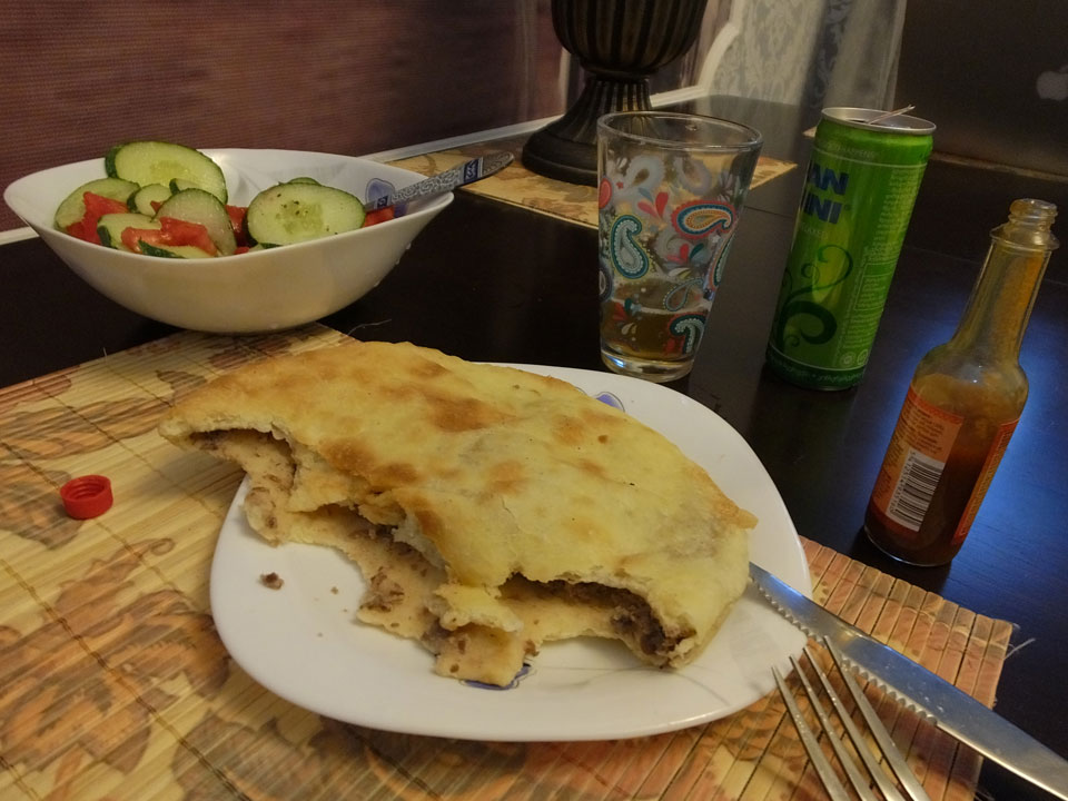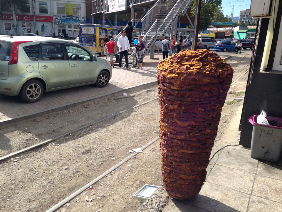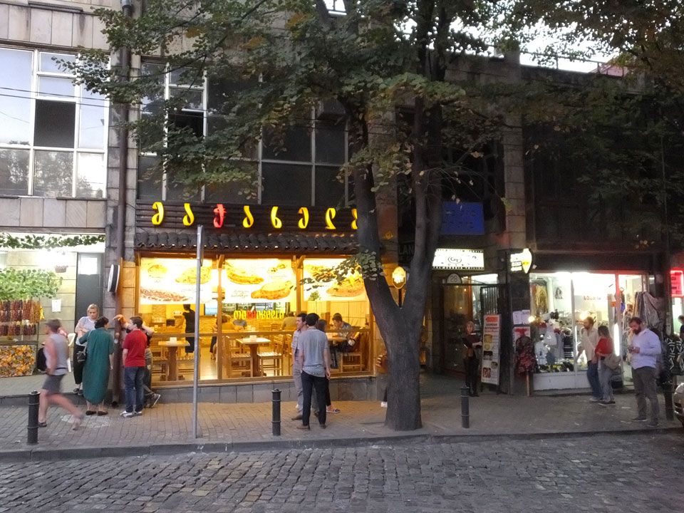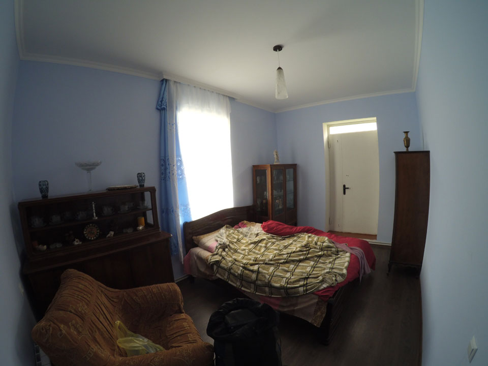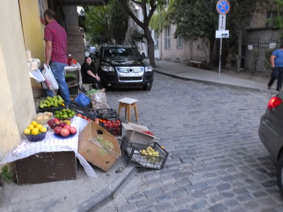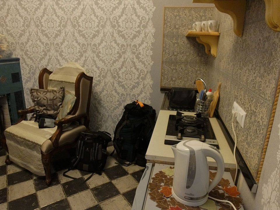 Ein tolles Zimmer mal mit Küche usw.. Russischer Stil, doch exzellent sauber und komfortabel. WLAN ging, dann noch eine Runde durch die Gegend. Die Lage war auch super, ganz so wie ich das dachte. Ich holte mir etwas zu essen und kaufte noch 2 Tomaten und eine Gurke. Das Gemüse kam genau einen Lari für meinen letzten Tomaten-Gurkensalat hier.