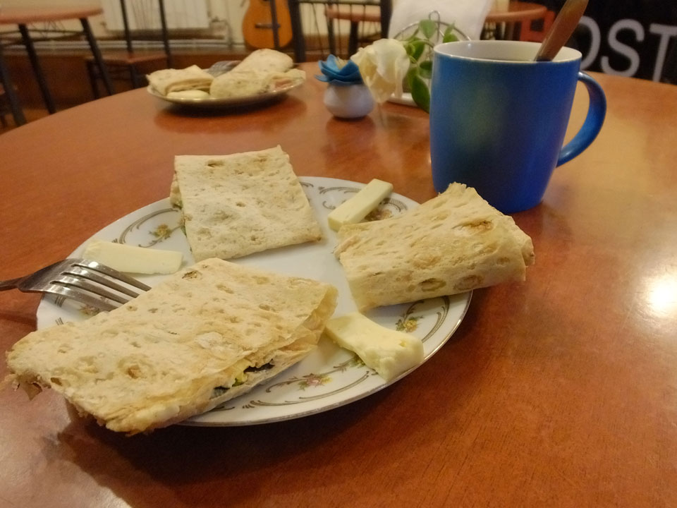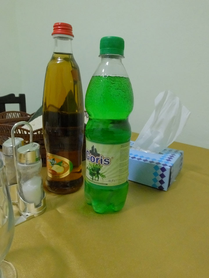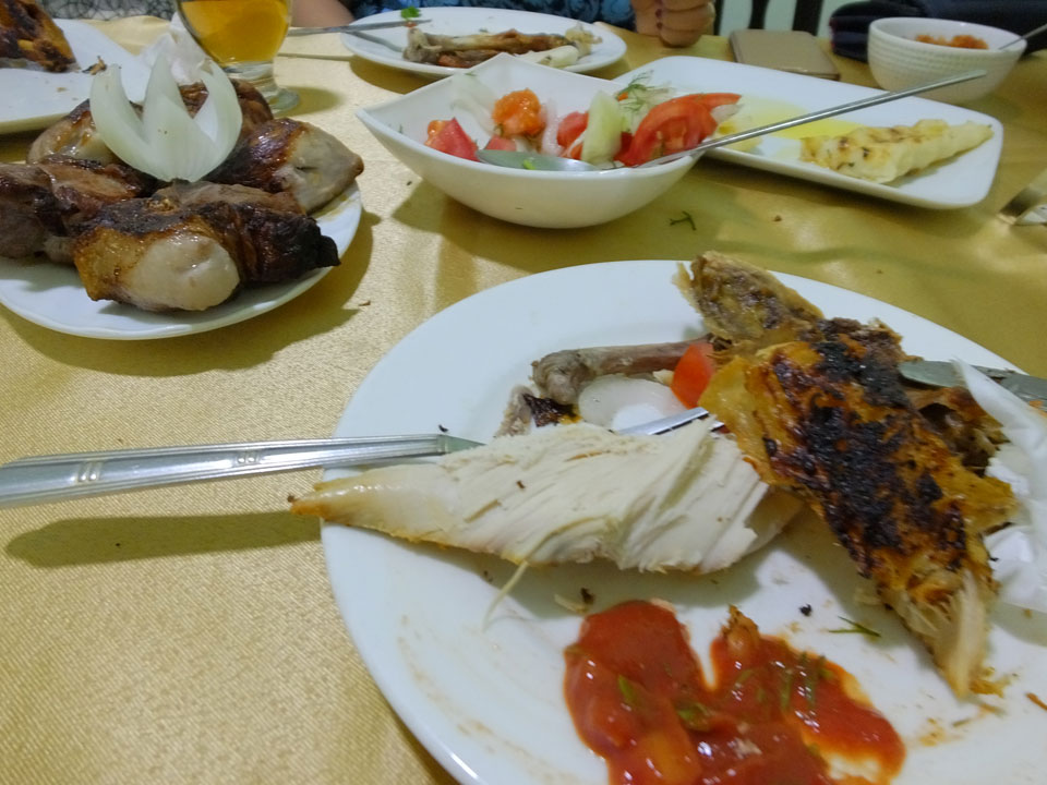 So war’s dann auch. Eine Gruppe von Männern stand vor einem Hotel und guckte erstaunt. Selten kommen wohl Touristen hier vorbei. Das Hotel wurde gerade renoviert. Man leitete uns in einen kleinen Raum. Draußen roch es nach Farbe, hier drinnen war das ein Privatrestaurant. Den Grill draußen hatte ich schon gesehen. Die Speisekarte listete allerhand auf. Es wurde mit einem Schweinespieß, Kartoffeln und Salat ein großes Essen. Brot gibt’s auch immer dazu.