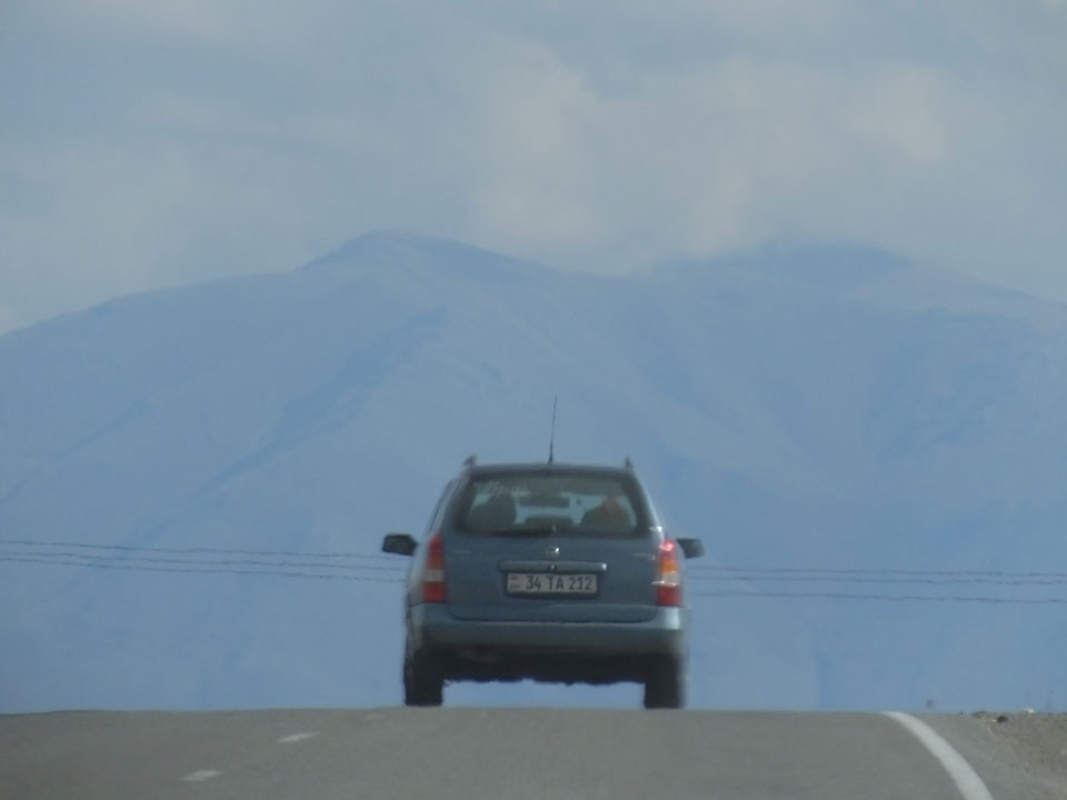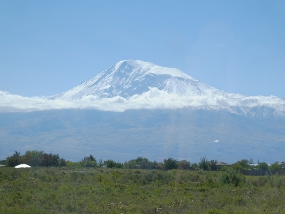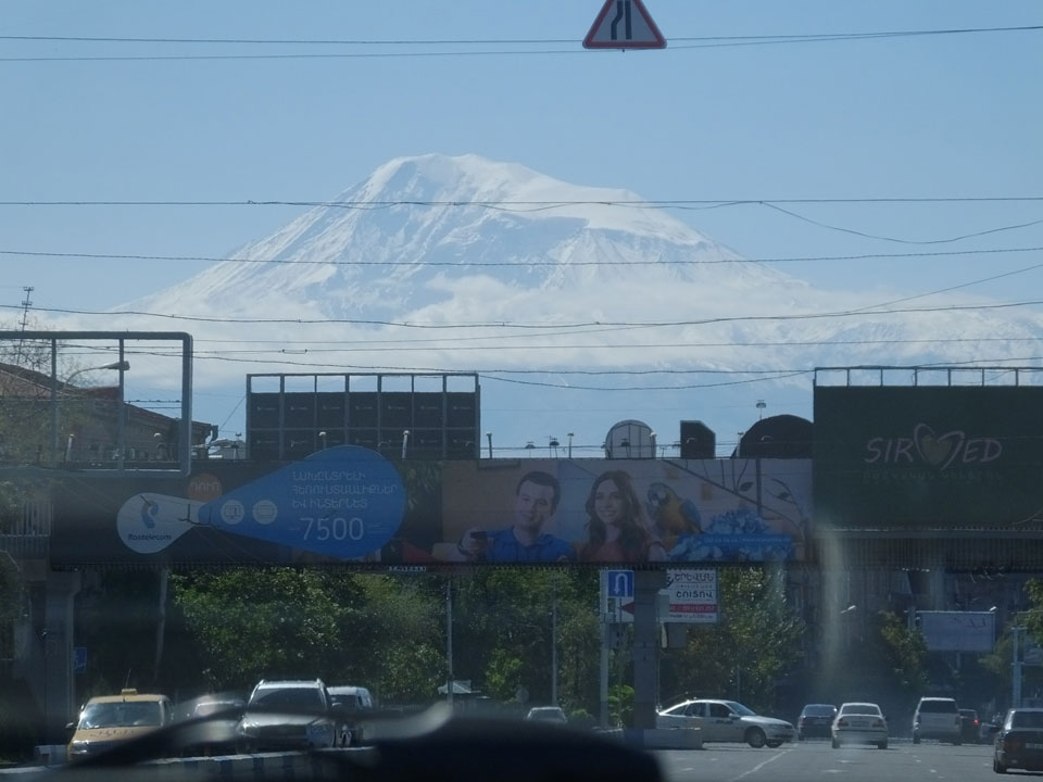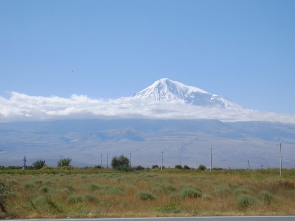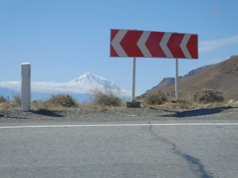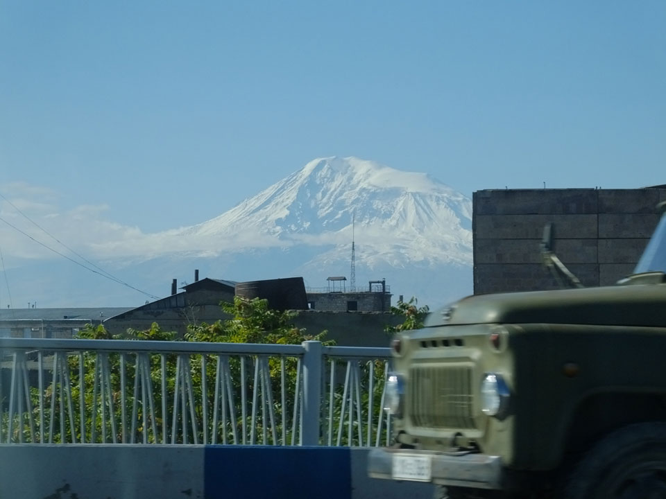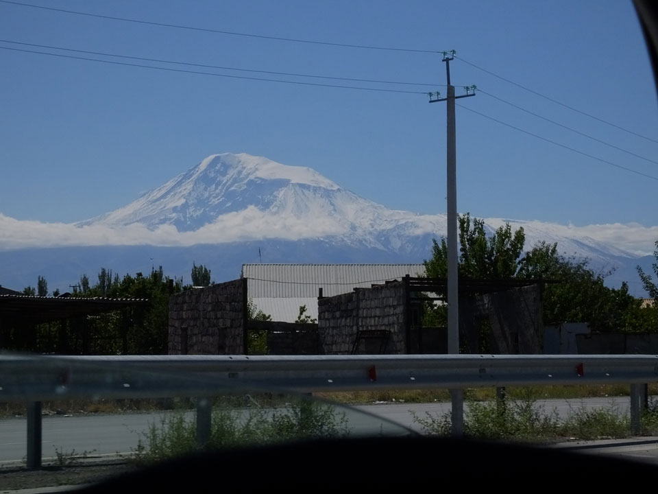 Wir holten weitere Leute ab, dann ging’s raus aus Yerevan Richtung Osten. Links neben mir das Mädel, recht eine Frau mit Kind. Bei einer Tankpause sah ich Mt. Ararat in voller Schönheit. Ein imposanter Vulkan da drüben in der Türkei.