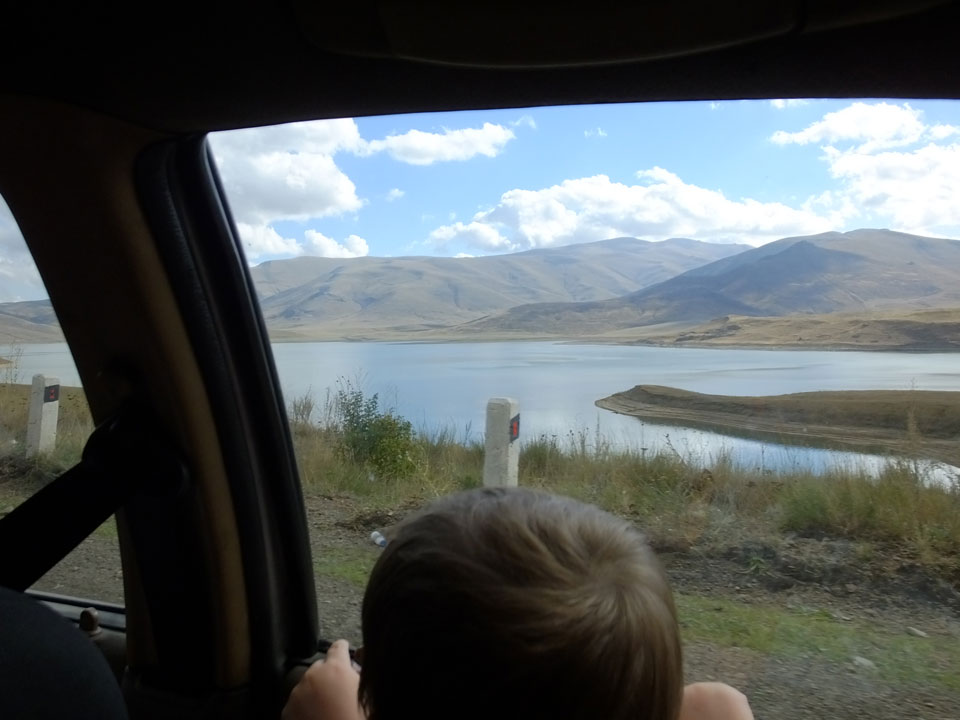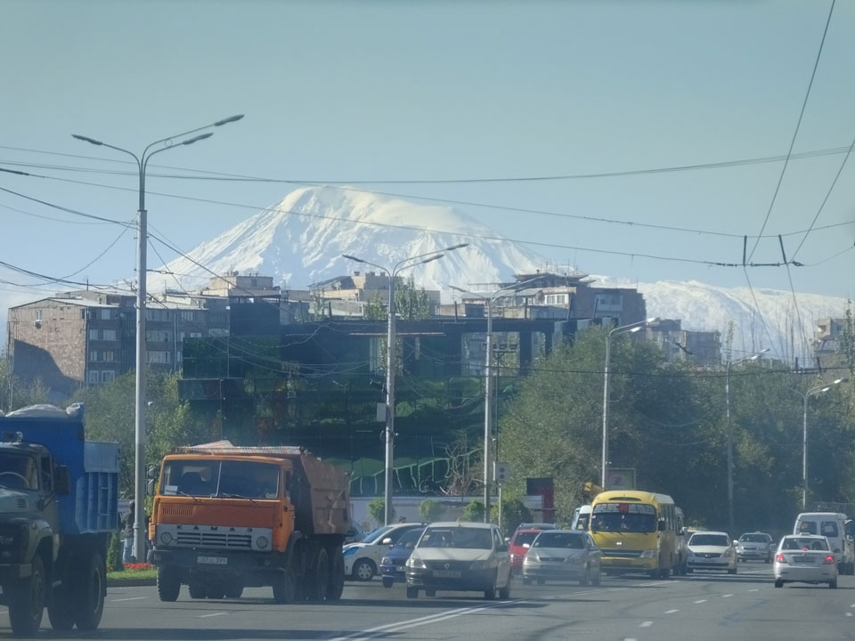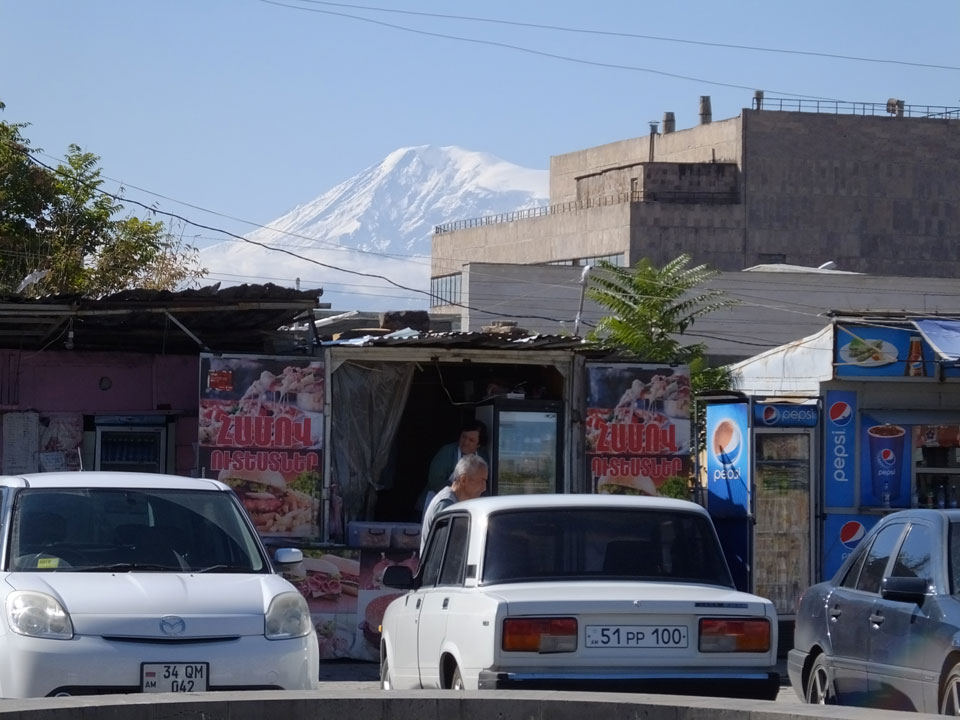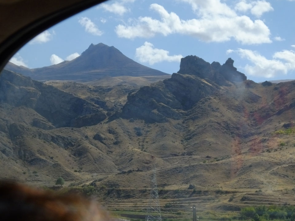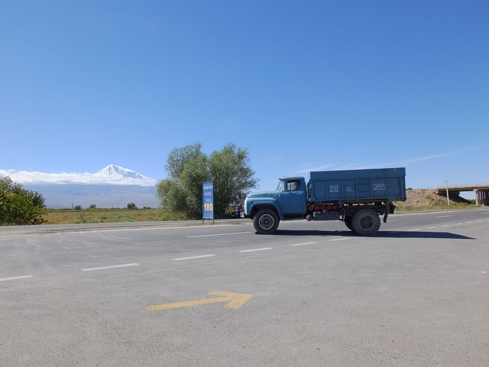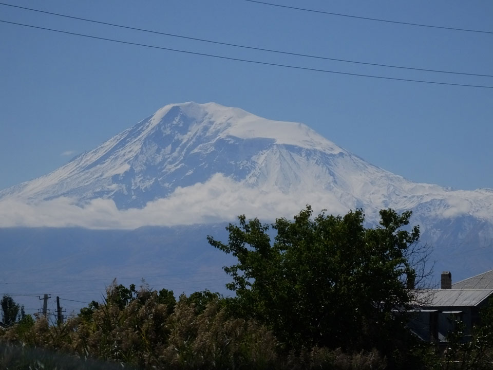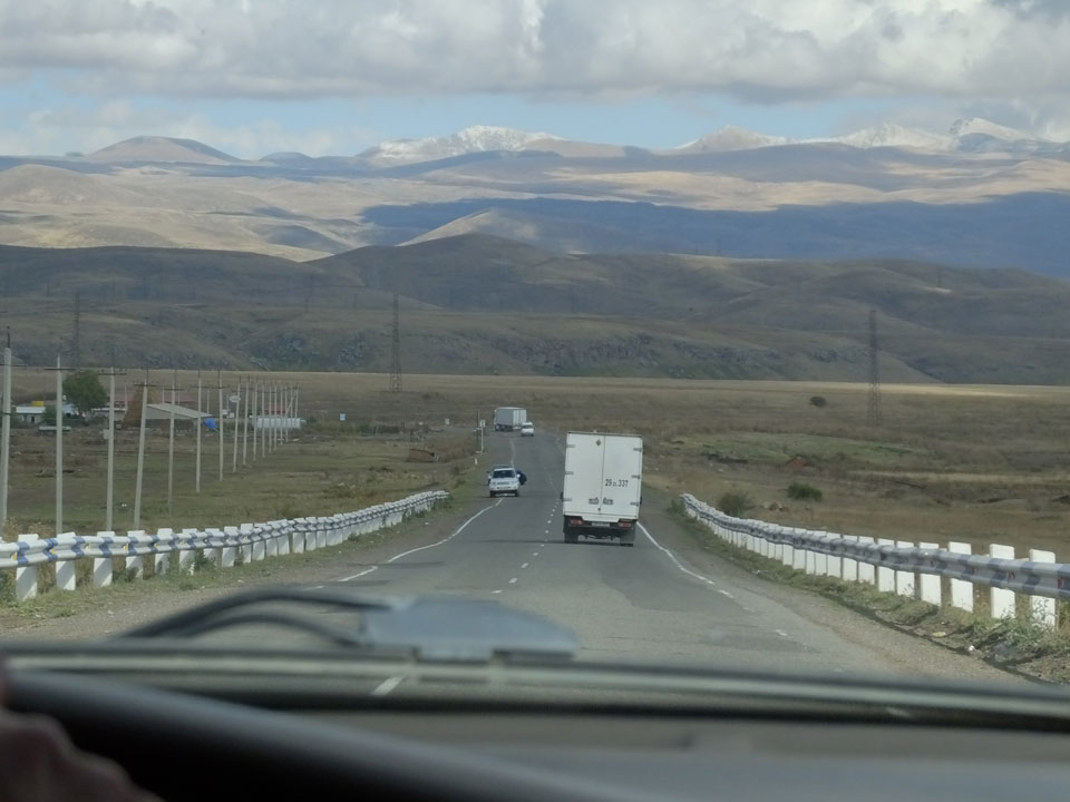Wir holten weitere Leute ab, dann ging’s raus aus Yerevan Richtung Osten. Links neben mir das Mädel, recht eine Frau mit Kind. Bei einer Tankpause sah ich Mt. Ararat in voller Schönheit. Ein imposanter Vulkan da drüben in der Türkei.