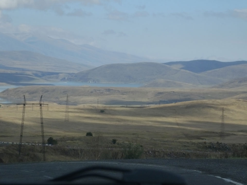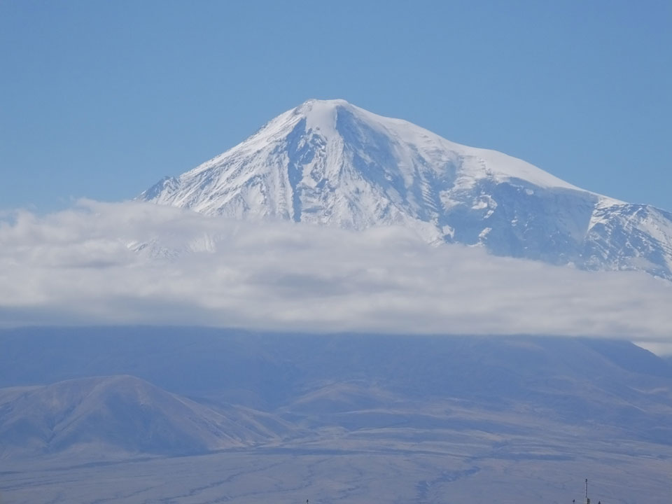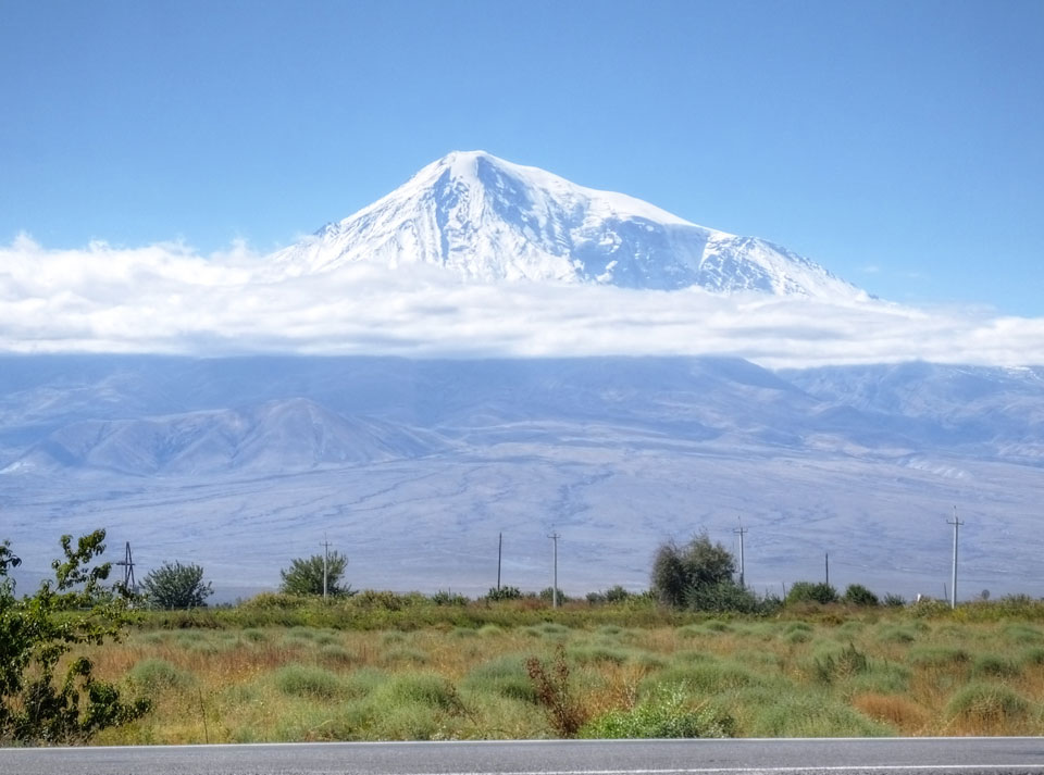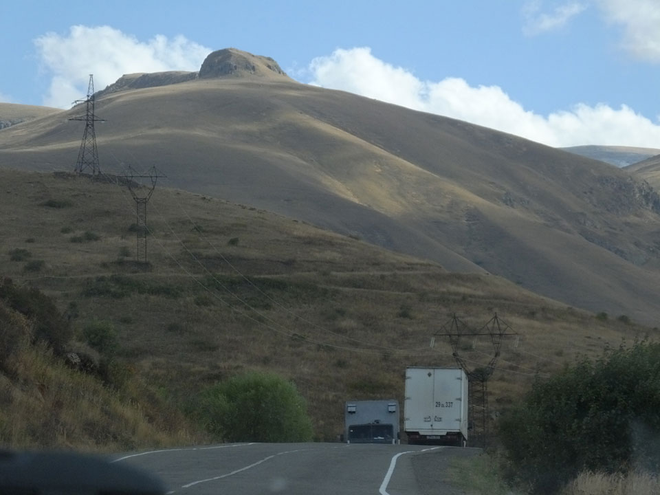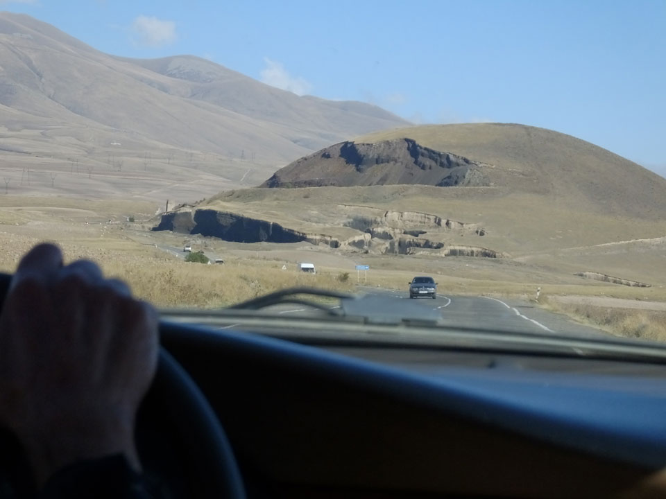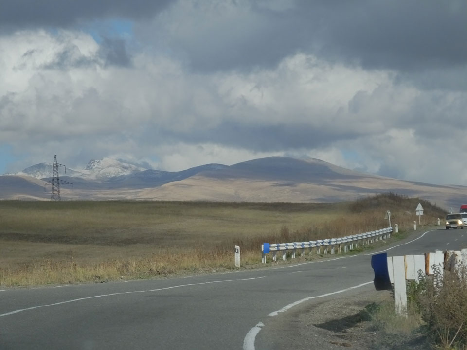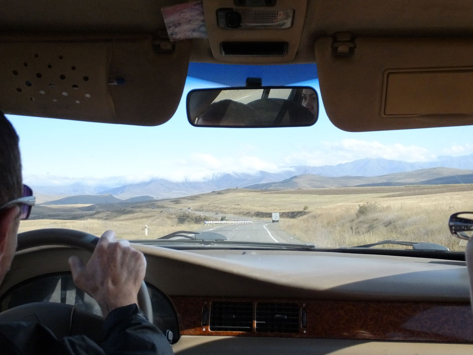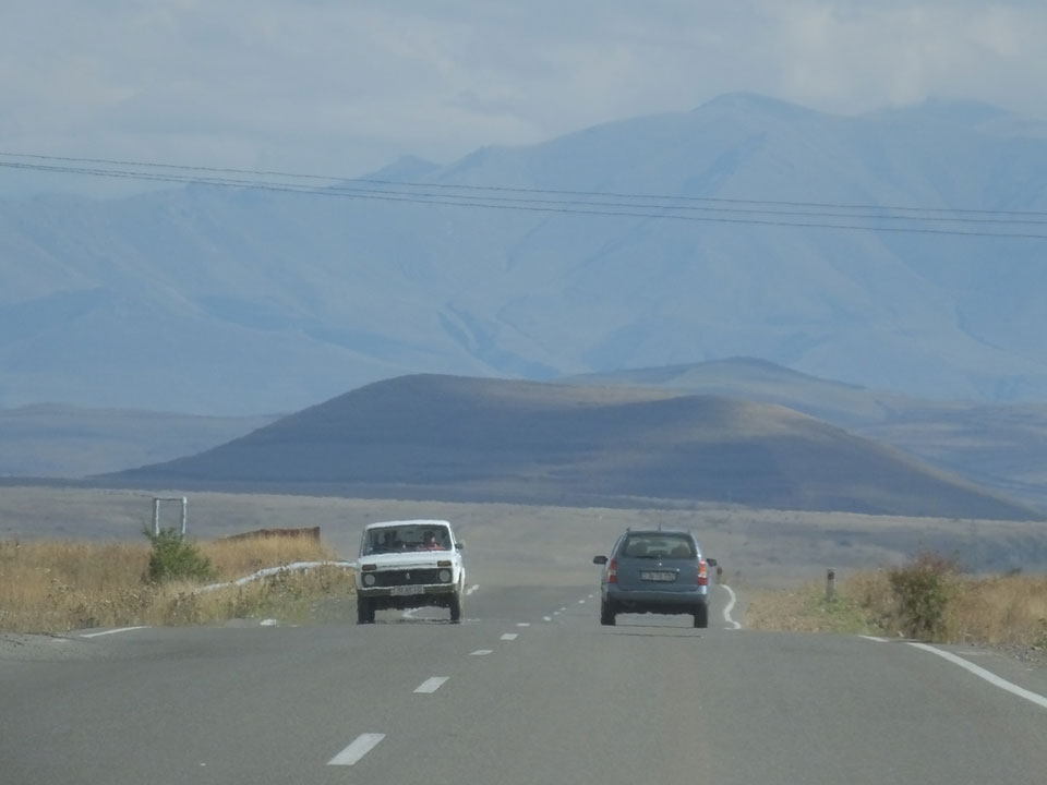 Wir holten weitere Leute ab, dann ging’s raus aus Yerevan Richtung Osten. Links neben mir das Mädel, recht eine Frau mit Kind. Bei einer Tankpause sah ich Mt. Ararat in voller Schönheit. Ein imposanter Vulkan da drüben in der Türkei.