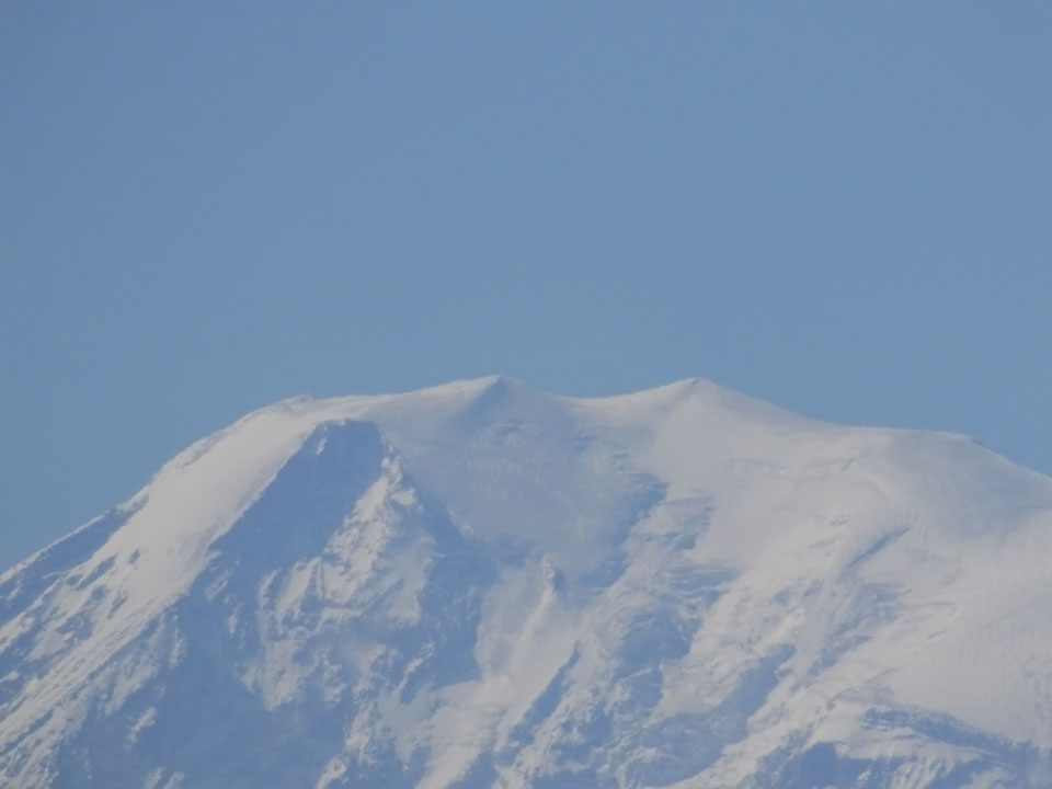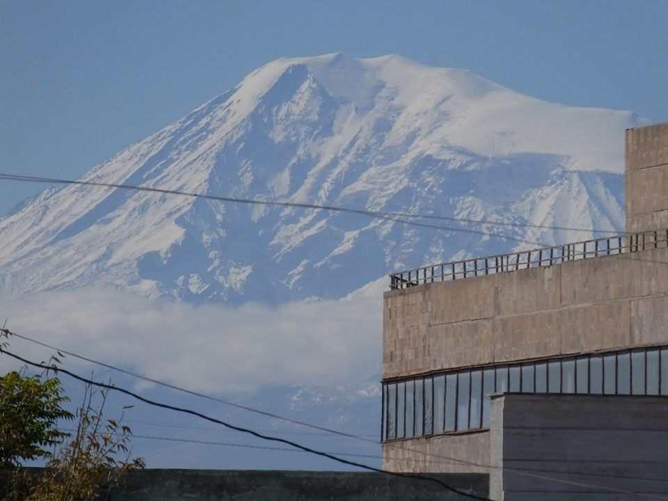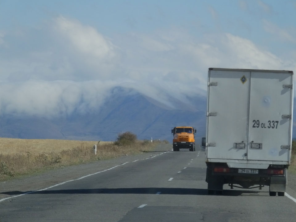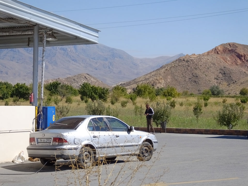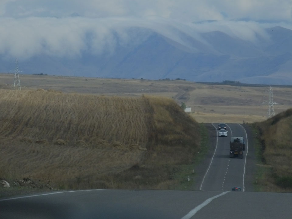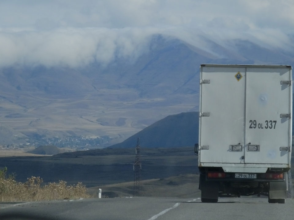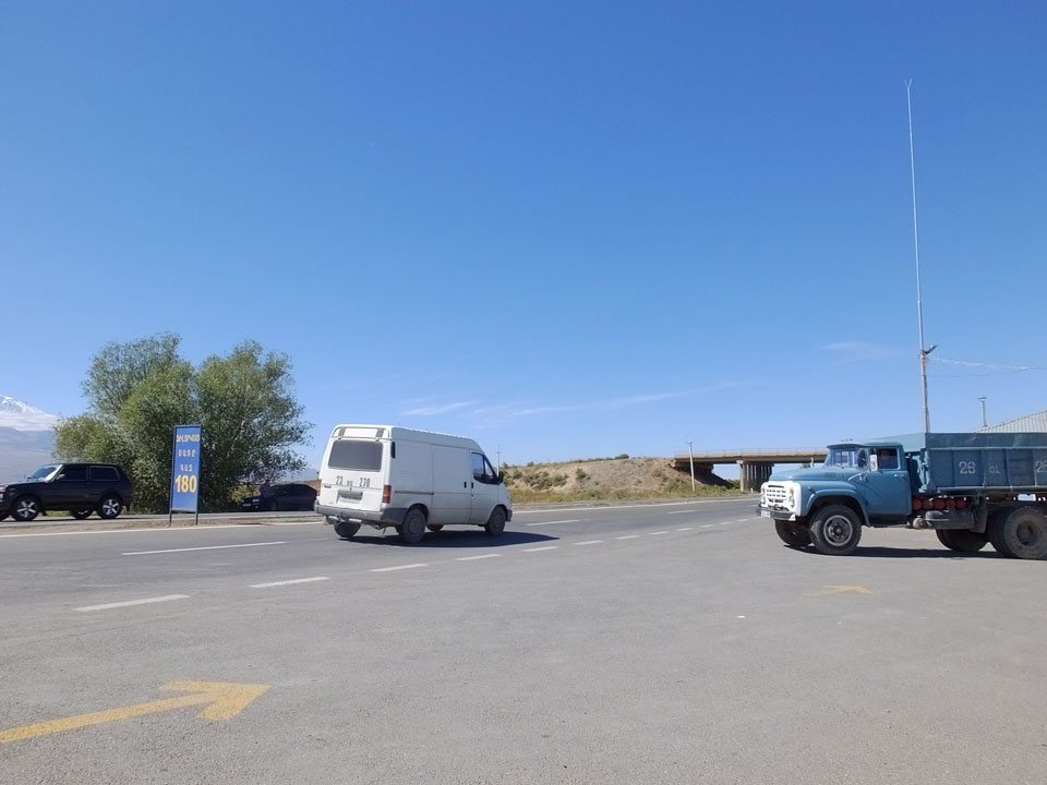 Wir holten weitere Leute ab, dann ging’s raus aus Yerevan Richtung Osten. Links neben mir das Mädel, recht eine Frau mit Kind. Bei einer Tankpause sah ich Mt. Ararat in voller Schönheit. Ein imposanter Vulkan da drüben in der Türkei.