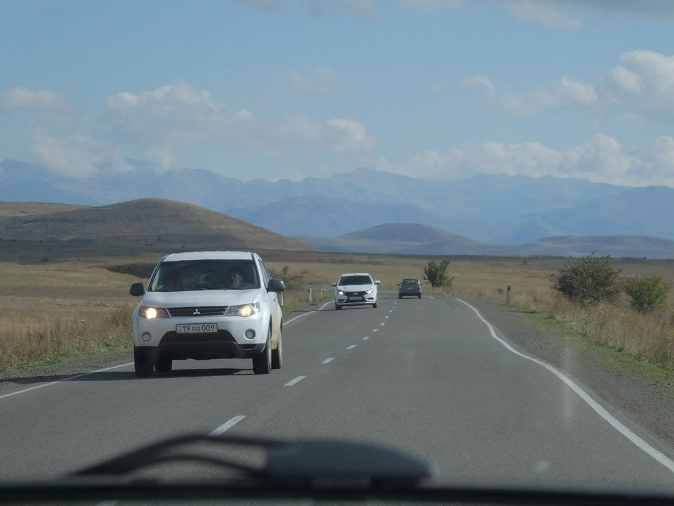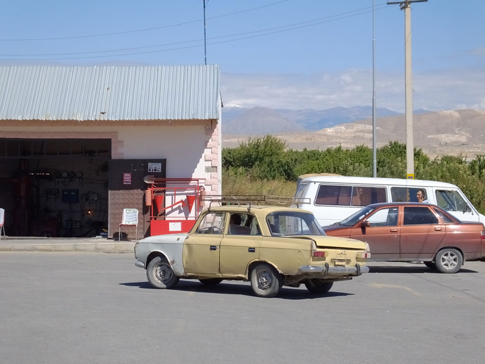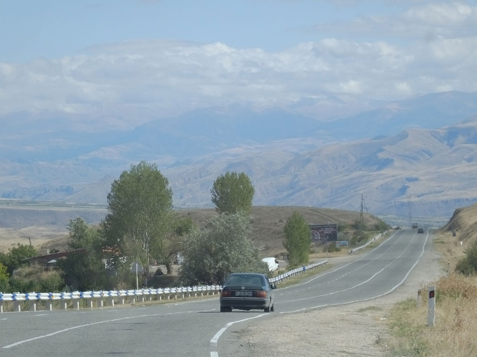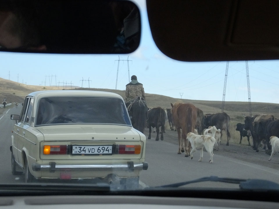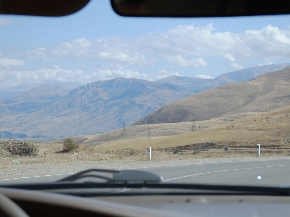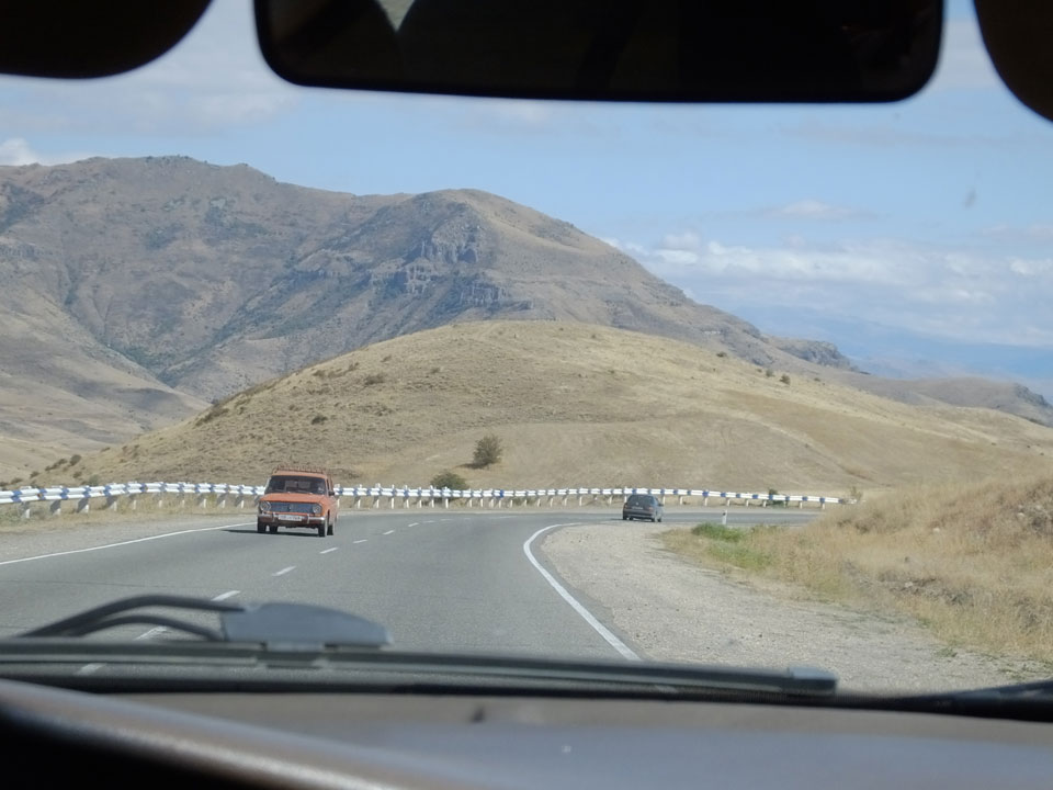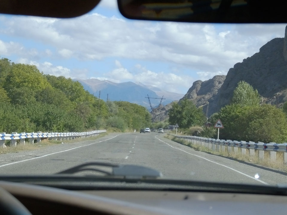 Der Taxtifahrer fuhr uns hin und für 1000 (900+100) war es das auch wert gegenüber Bus. Dort an der Gai Station wusste man nur nicht von Goris. Es wurde diskutiert. Ein anderes Taxi fuhr los und brachte uns wohl zu Rossiya Station. Das Herumkurven dauerte, sodass es dann 2000 wurden. Da waren wir nun und ein Shared Taxi stand auch da. Ein Minivan für um die 7 Leute. Es kam nur niemand und somit wurde schließlich der Rucksack auf das Dach eines Kombis geschnallt. Da auch weiter warten – nichts tat sich. Ein weiteres Mal wechselten wir das Gefährt. Jetzt ein normales Auto und es ging los. Inzwischen ca. 11:30, wieder um die 1:30h Wartezeit. Für mich normal.