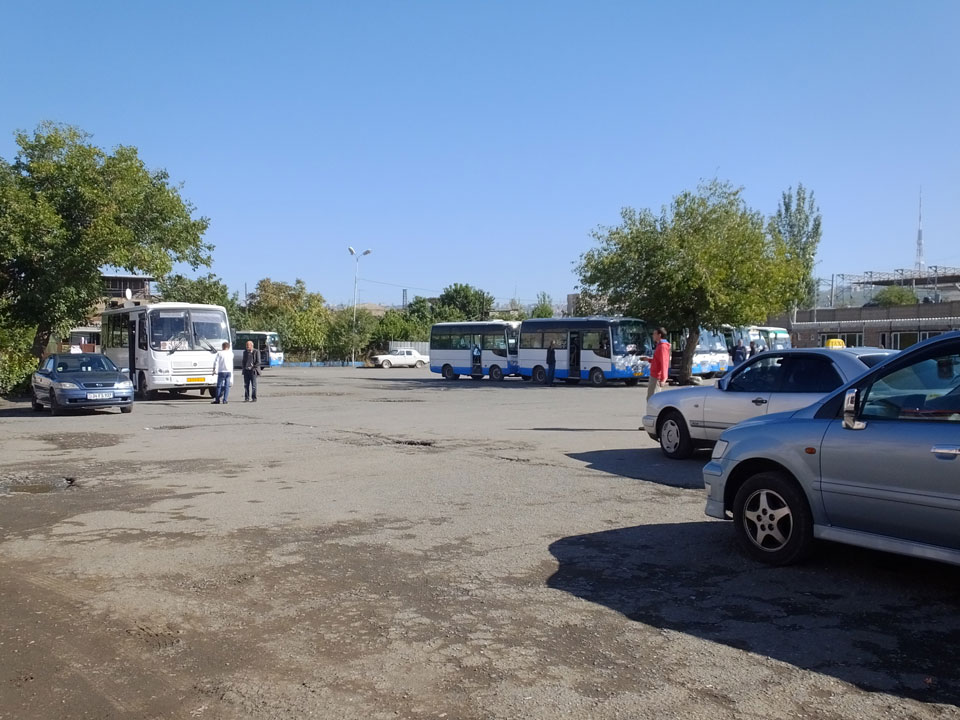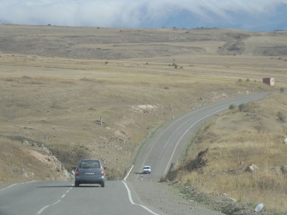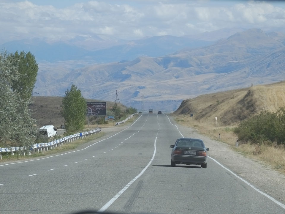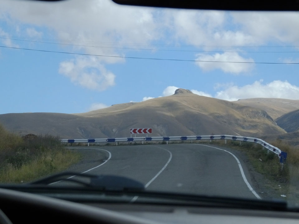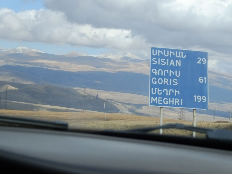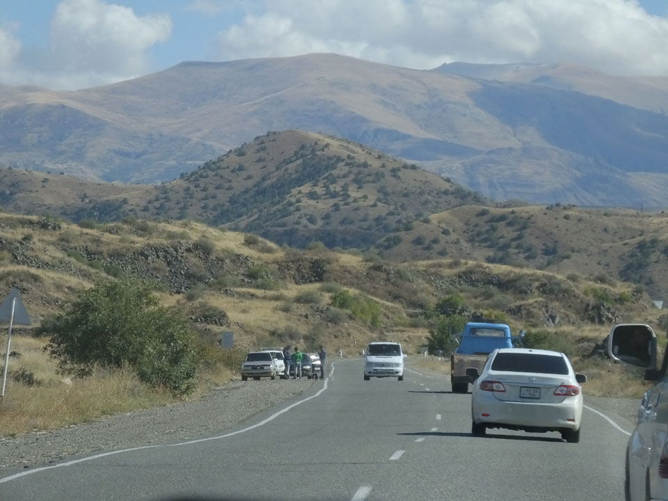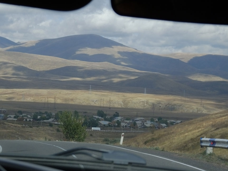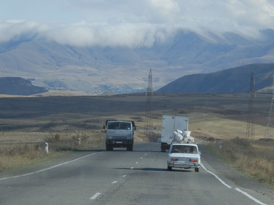 Der Taxtifahrer fuhr uns hin und für 1000 (900+100) war es das auch wert gegenüber Bus. Dort an der Gai Station wusste man nur nicht von Goris. Es wurde diskutiert. Ein anderes Taxi fuhr los und brachte uns wohl zu Rossiya Station. Das Herumkurven dauerte, sodass es dann 2000 wurden. Da waren wir nun und ein Shared Taxi stand auch da. Ein Minivan für um die 7 Leute. Es kam nur niemand und somit wurde schließlich der Rucksack auf das Dach eines Kombis geschnallt. Da auch weiter warten – nichts tat sich. Ein weiteres Mal wechselten wir das Gefährt. Jetzt ein normales Auto und es ging los. Inzwischen ca. 11:30, wieder um die 1:30h Wartezeit. Für mich normal.