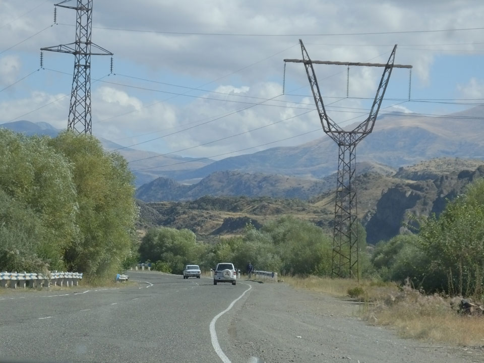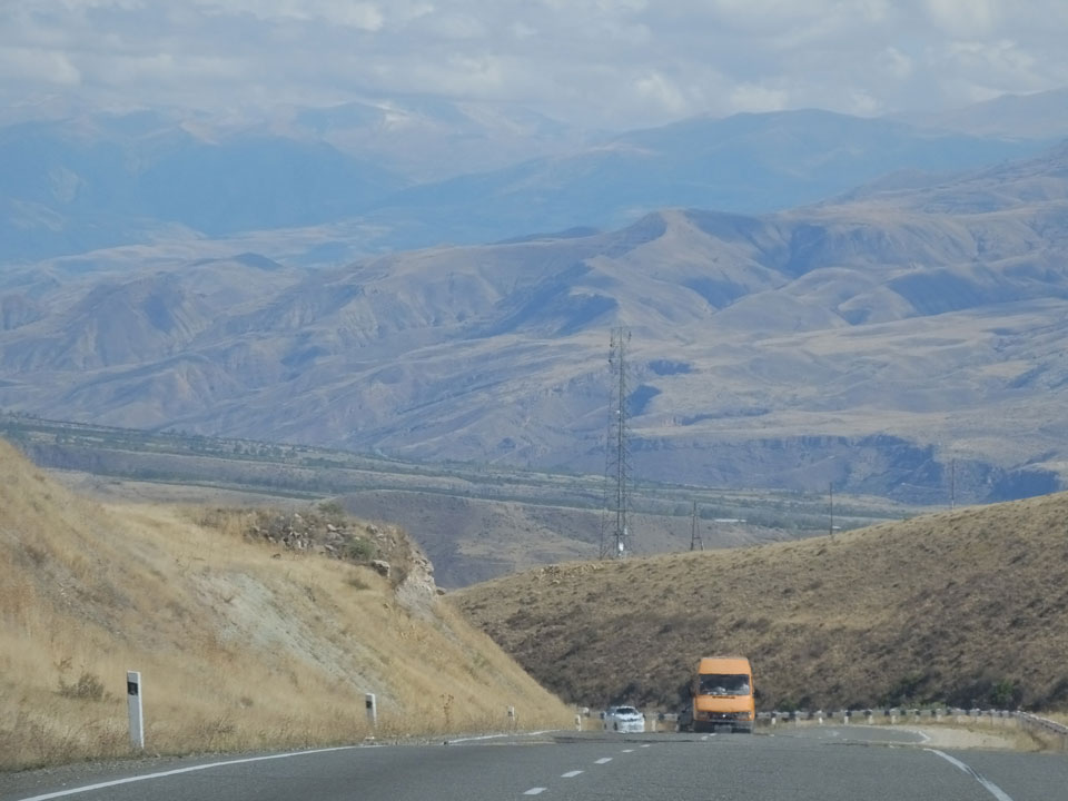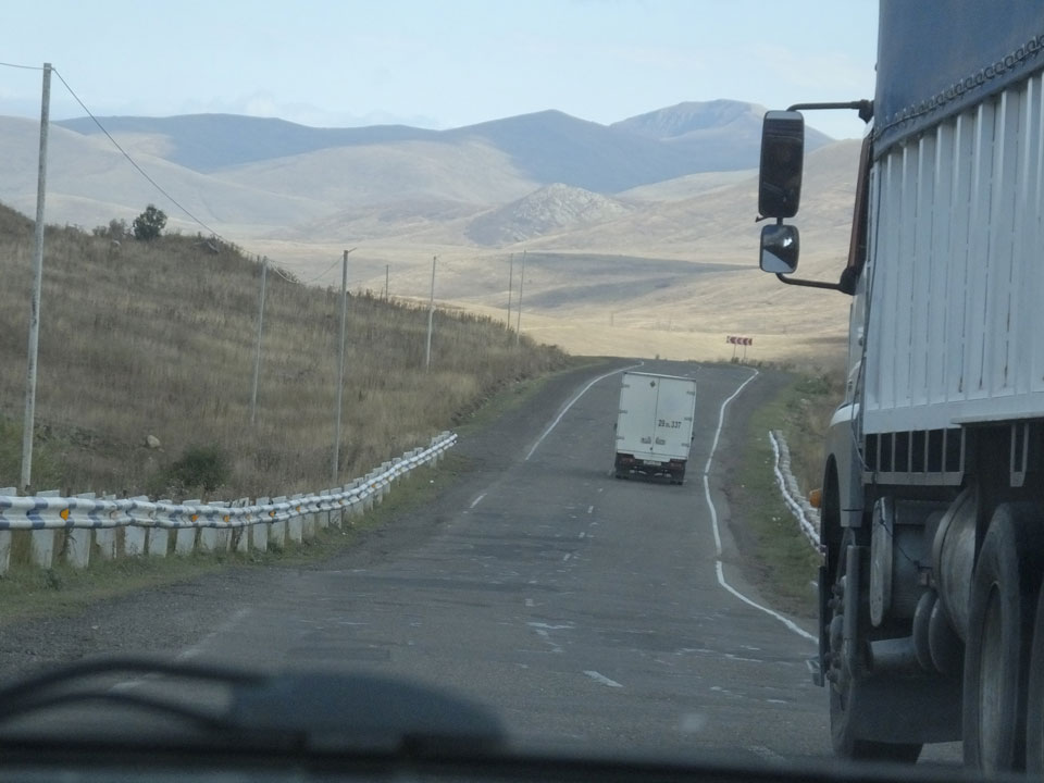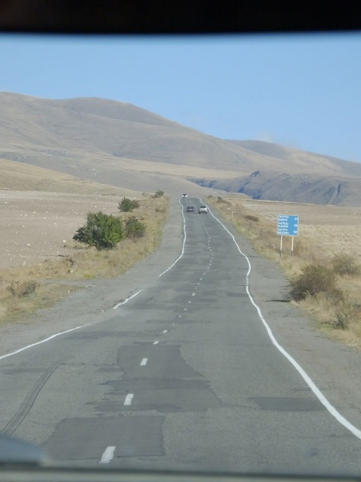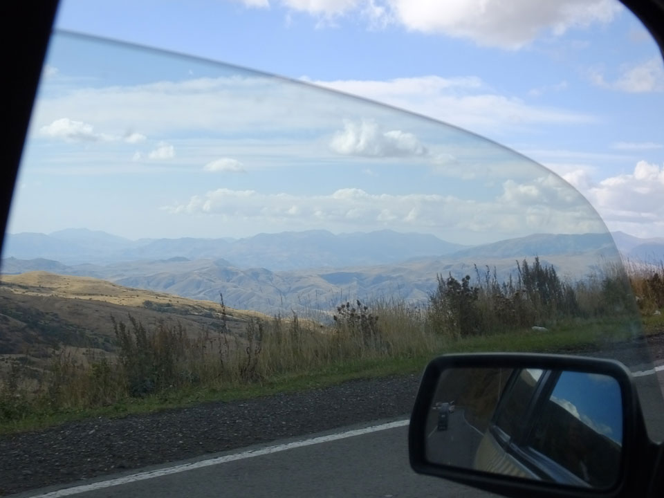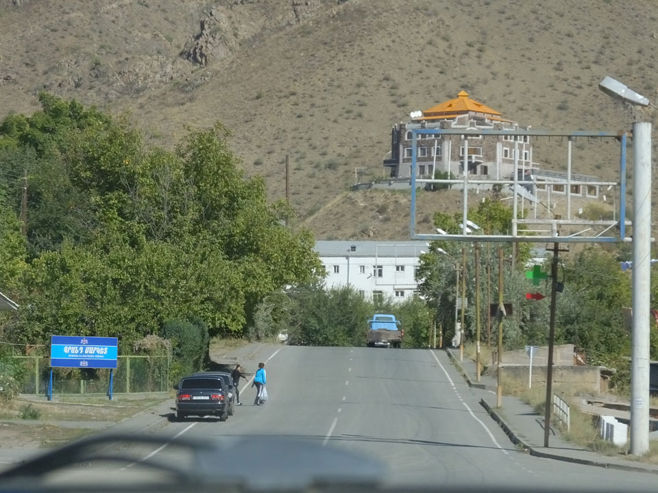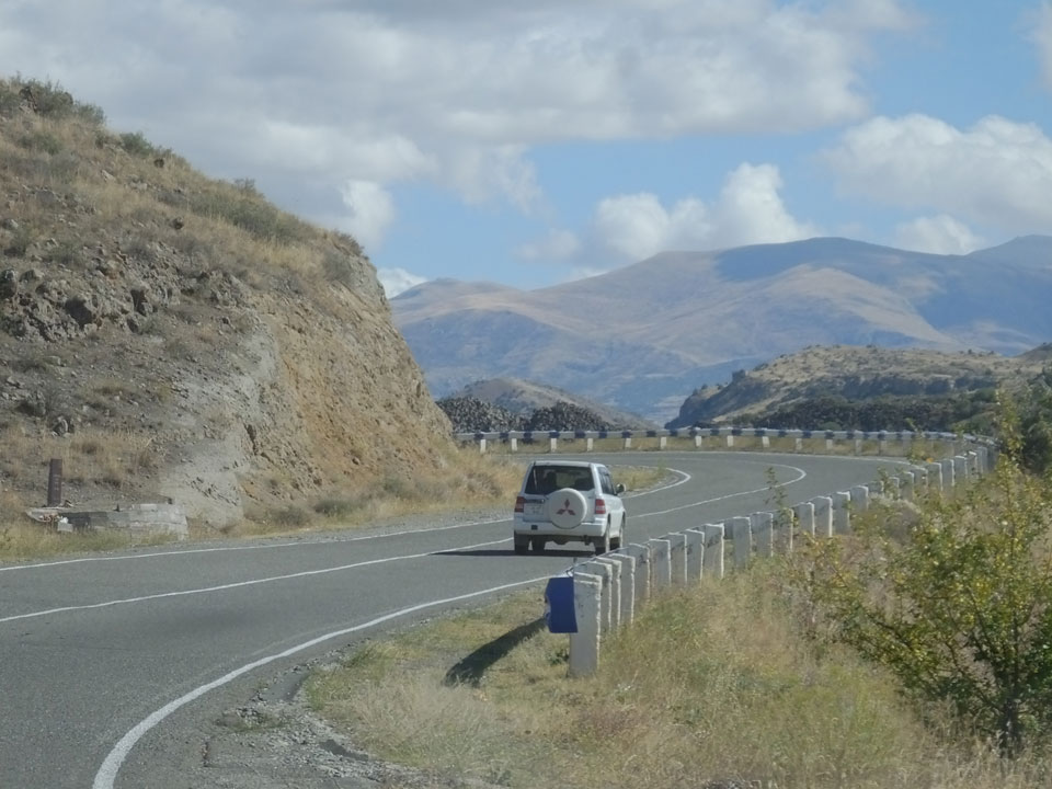Der Taxtifahrer fuhr uns hin und für 1000 (900+100) war es das auch wert gegenüber Bus. Dort an der Gai Station wusste man nur nicht von Goris. Es wurde diskutiert. Ein anderes Taxi fuhr los und brachte uns wohl zu Rossiya Station. Das Herumkurven dauerte, sodass es dann 2000 wurden. Da waren wir nun und ein Shared Taxi stand auch da. Ein Minivan für um die 7 Leute. Es kam nur niemand und somit wurde schließlich der Rucksack auf das Dach eines Kombis geschnallt. Da auch weiter warten – nichts tat sich. Ein weiteres Mal wechselten wir das Gefährt. Jetzt ein normales Auto und es ging los. Inzwischen ca. 11:30, wieder um die 1:30h Wartezeit. Für mich normal.