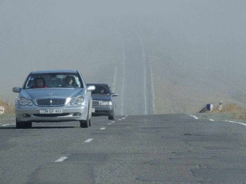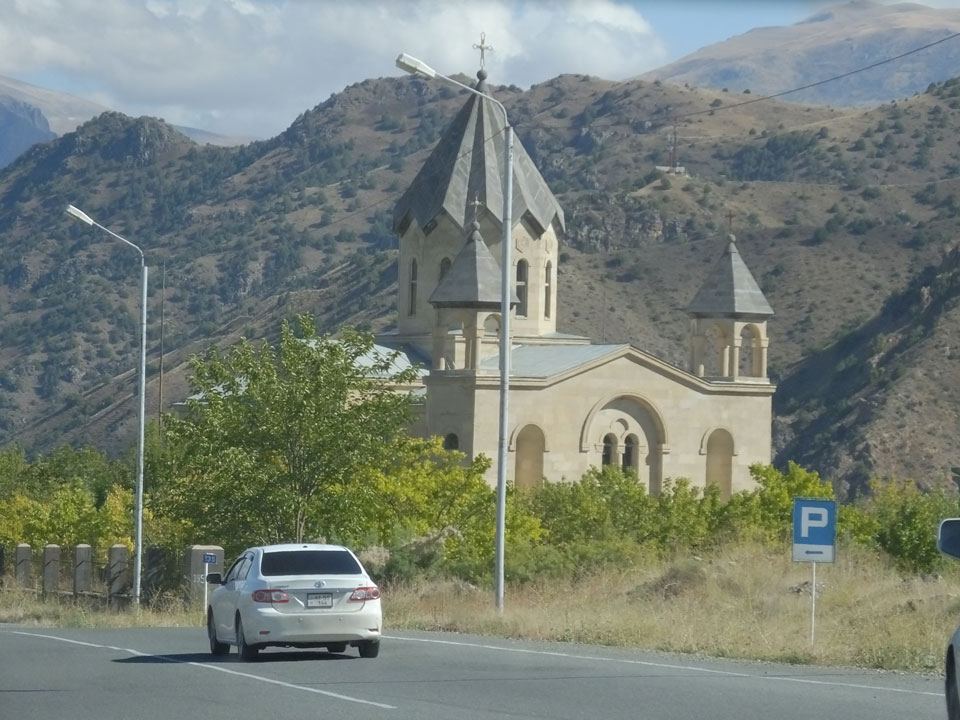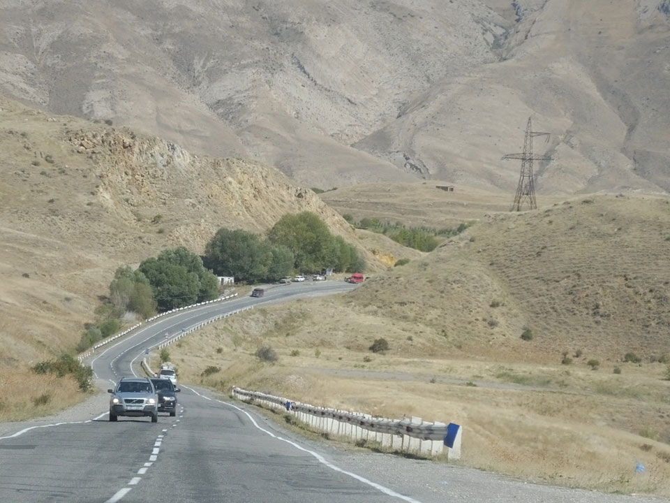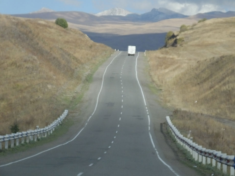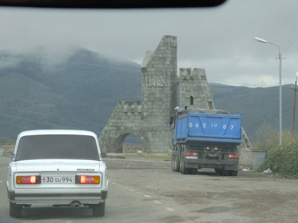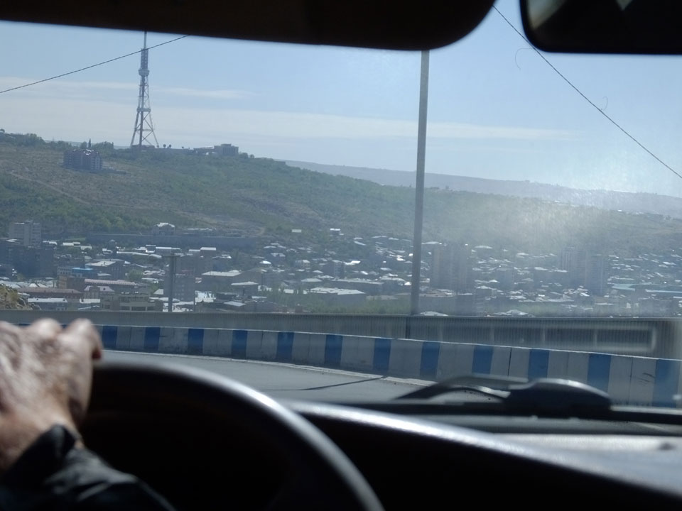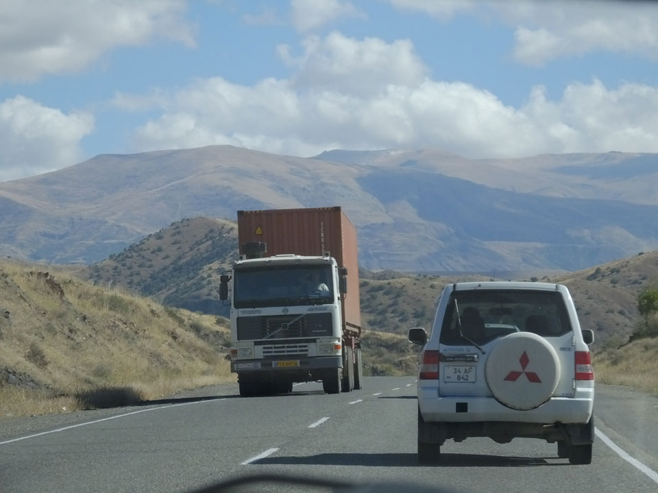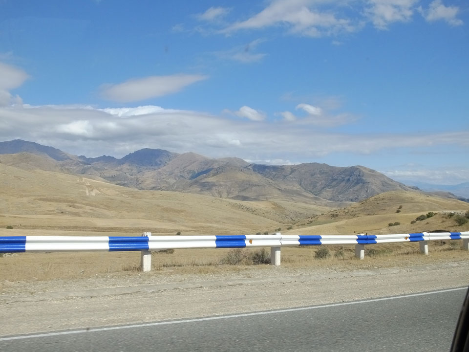 Der Taxtifahrer fuhr uns hin und für 1000 (900+100) war es das auch wert gegenüber Bus. Dort an der Gai Station wusste man nur nicht von Goris. Es wurde diskutiert. Ein anderes Taxi fuhr los und brachte uns wohl zu Rossiya Station. Das Herumkurven dauerte, sodass es dann 2000 wurden. Da waren wir nun und ein Shared Taxi stand auch da. Ein Minivan für um die 7 Leute. Es kam nur niemand und somit wurde schließlich der Rucksack auf das Dach eines Kombis geschnallt. Da auch weiter warten – nichts tat sich. Ein weiteres Mal wechselten wir das Gefährt. Jetzt ein normales Auto und es ging los. Inzwischen ca. 11:30, wieder um die 1:30h Wartezeit. Für mich normal.