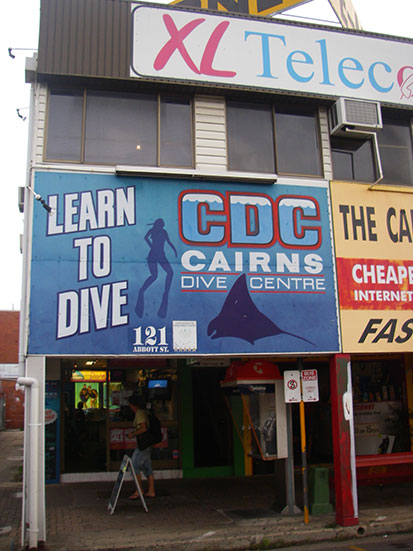 Ich ging mit und wir klapperten einige Tauchshops ab. Hier in Cairns, mit dem Great Barrier Reef vor der Tür, haben sich viele Tauchschulen und -Shops angesiedelt. Keine von denen hatte jedoch eine runde, altmodische Taucherbrille. Erst mit etwas herumtelefonieren, wurde von einem Shop eine ausfindig gemacht. Auf dem Weg schauten wir in einem Army Disposal Shop vorbei. Ich telefonierte draußen und er kam mit einer Brille wieder raus- Nur AU$39.