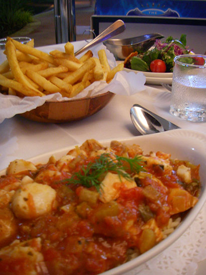 Neben Vorspeise, hatte ich ein Seafood Jambalaja. Jemand hatte Black Coral Trout. Zum Dessert auch was feines, dazu ein Wein. Alles super, selten so nett gegessen.