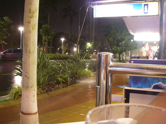 Es regnete wie wild, Schirme hatten wir dabei. Zu viel Wasser, um auf ein Taxi zu warten, also gingen wir mal kurz zu Johno’s. Die Krötenrennen waren in vollem Gange. Es gewann ein Aborinal, der sich als Preis eine Rundfahrt aussuchte. Dann zum Taxi und ab ins zweite Apartment.