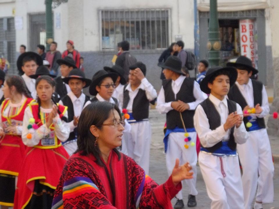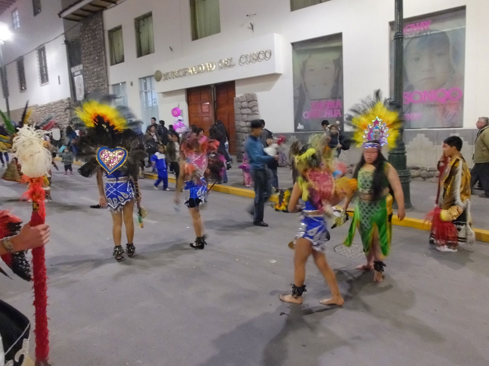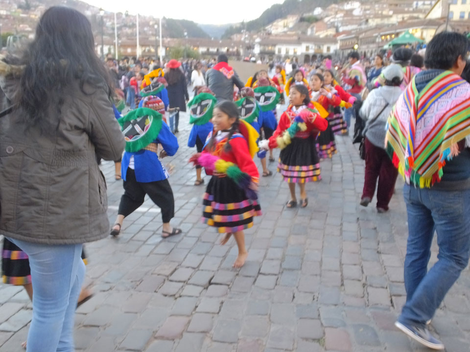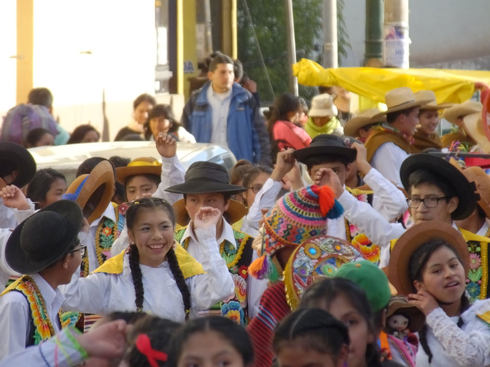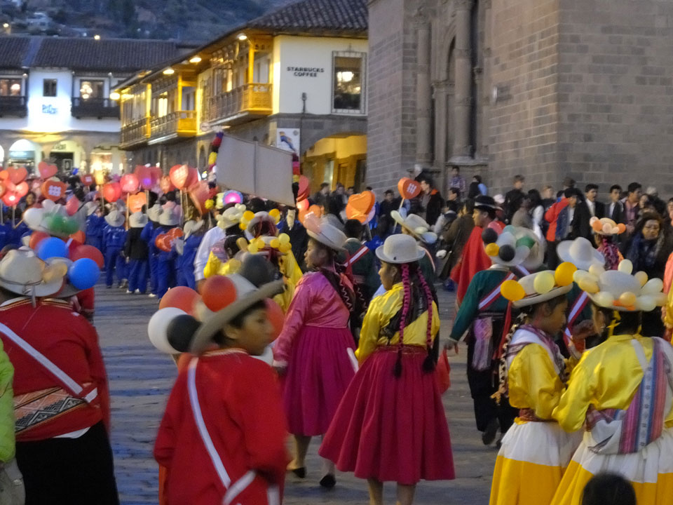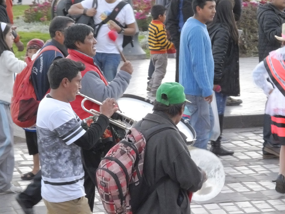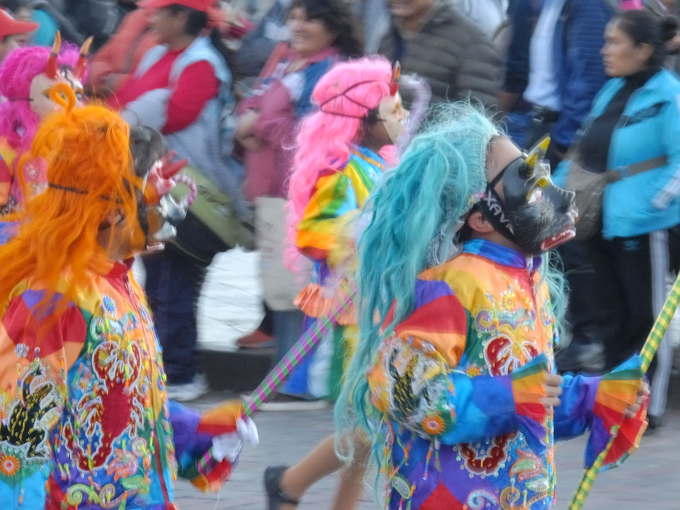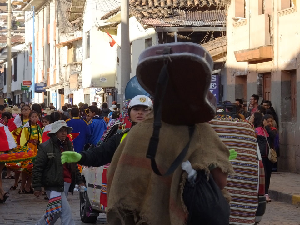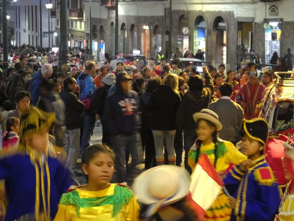 Ich ging ein 1/8 Hühnchen essen – 6 Soles. Danach hörte ich Straßen weiter Musik. Da war mal wieder eine Tanzparade. Heute von Kindern, meist maximal 10 Jahre denke ich mal. Verschiedene Gruppen mit verschiedenen Kostümen. Es war wieder ganz nett anzusehen, wie sie sich auf den Weg zum Plaza de Armas machten. Ich hatte nur etwas Bammel, denn einst wurde mir in Ecuador eine Camera bei so einer Parade geklaut. Ich blieb also gut in Bewegung und in der Nähe der trillerndes Polizistinnen.