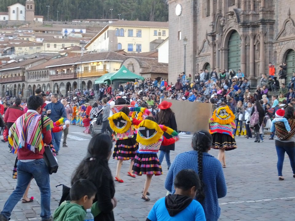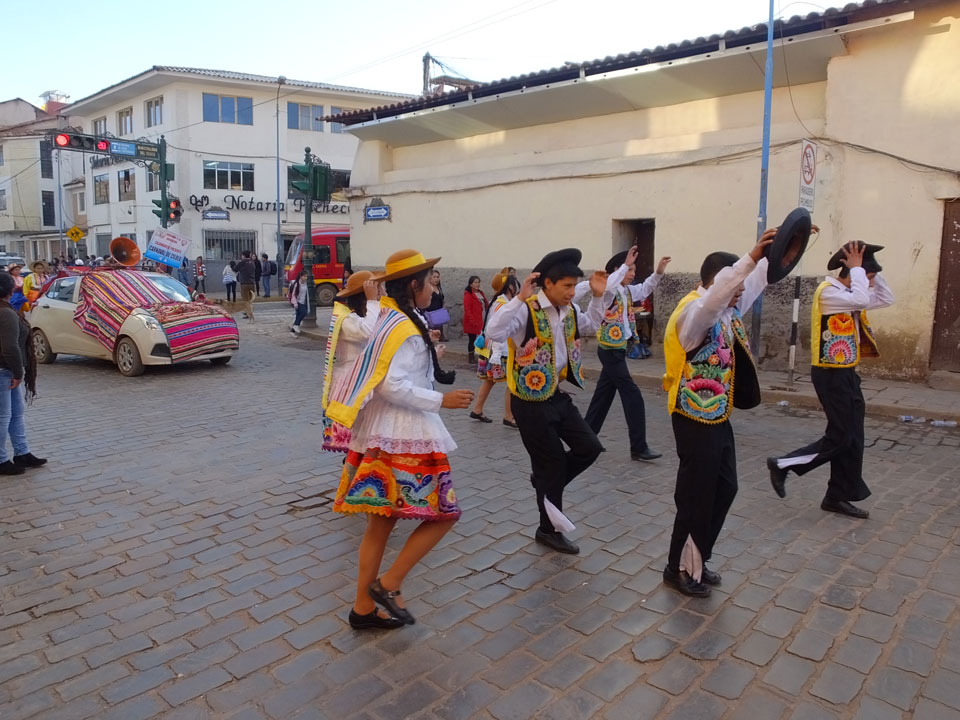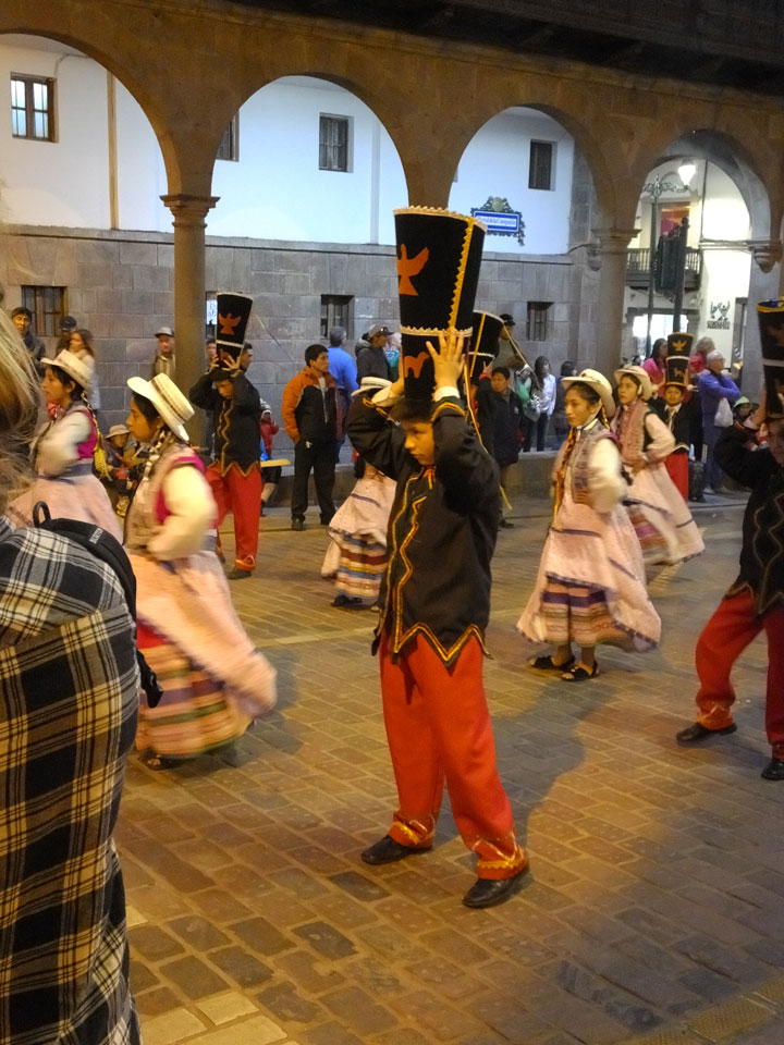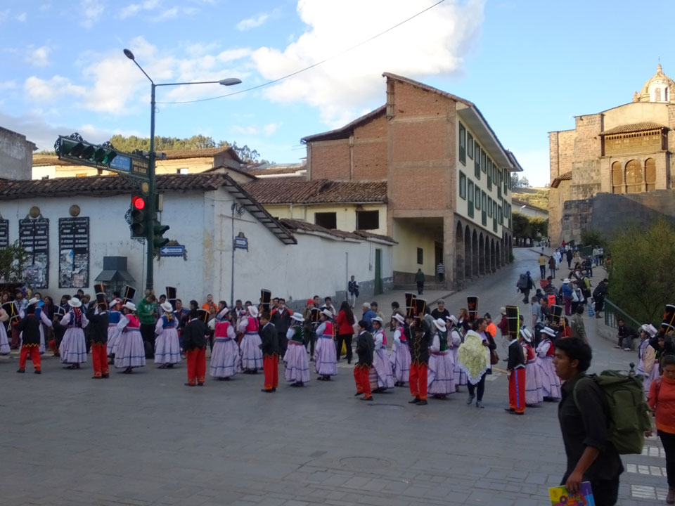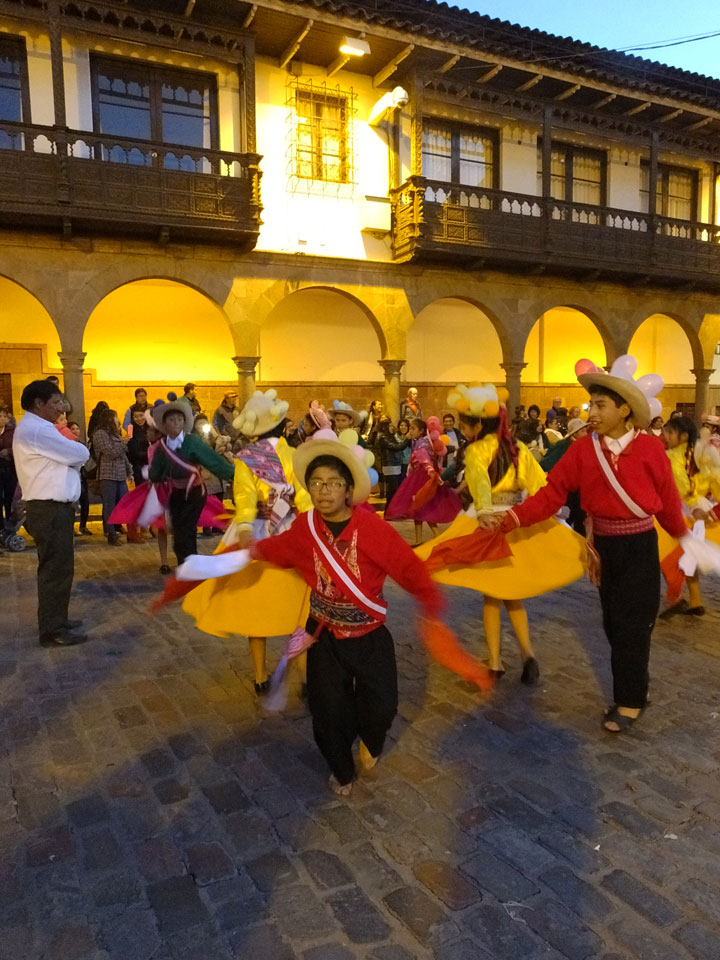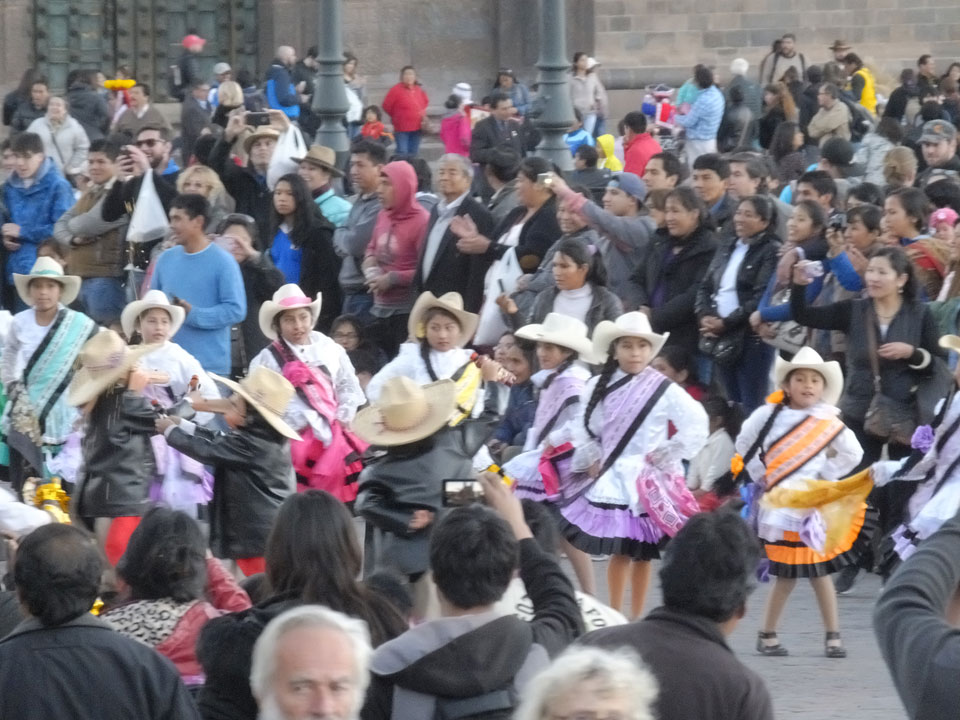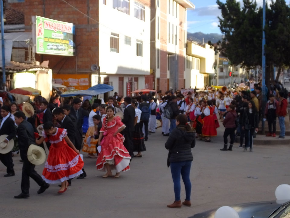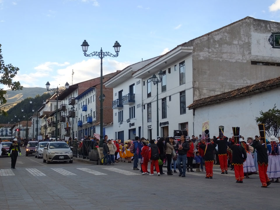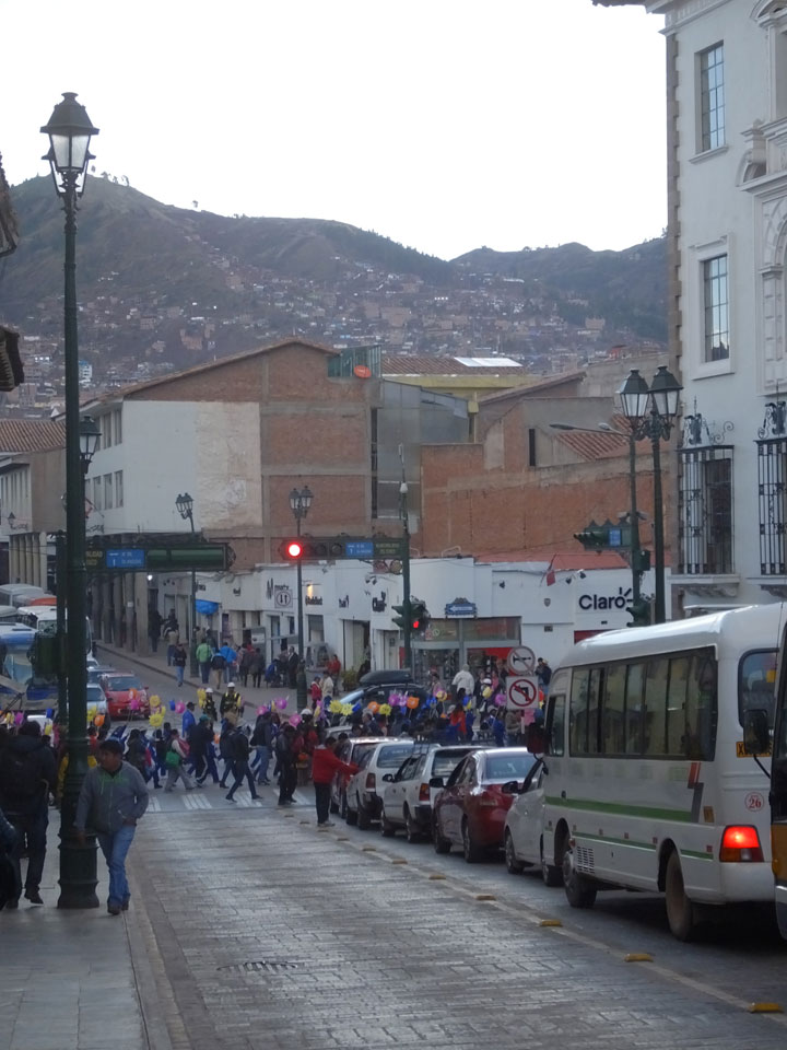 Ich ging ein 1/8 Hühnchen essen – 6 Soles. Danach hörte ich Straßen weiter Musik. Da war mal wieder eine Tanzparade. Heute von Kindern, meist maximal 10 Jahre denke ich mal. Verschiedene Gruppen mit verschiedenen Kostümen. Es war wieder ganz nett anzusehen, wie sie sich auf den Weg zum Plaza de Armas machten. Ich hatte nur etwas Bammel, denn einst wurde mir in Ecuador eine Camera bei so einer Parade geklaut. Ich blieb also gut in Bewegung und in der Nähe der trillerndes Polizistinnen.