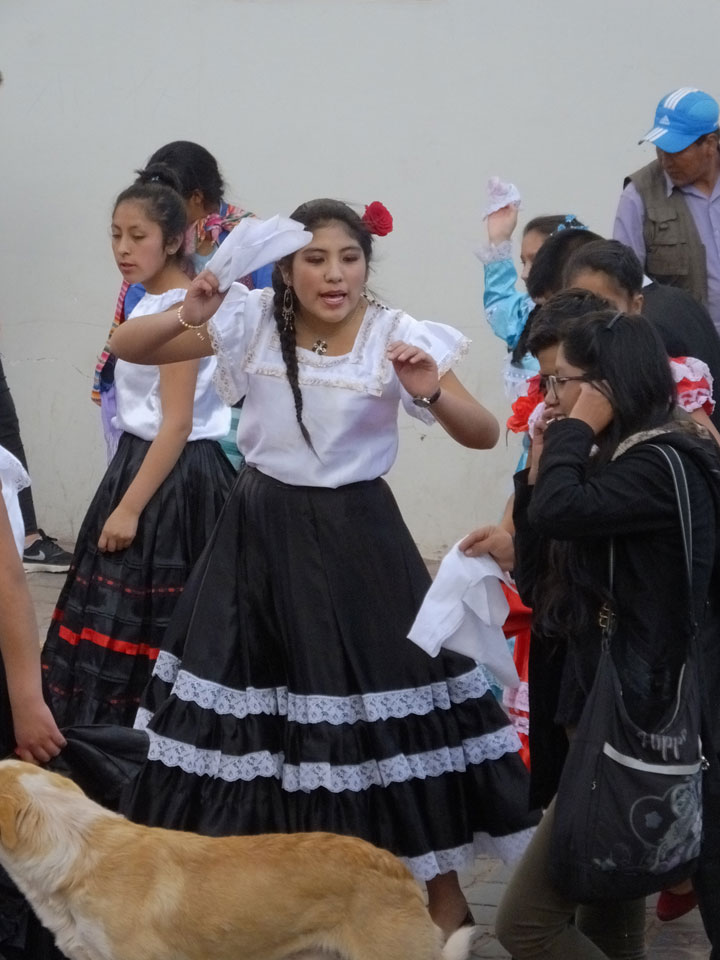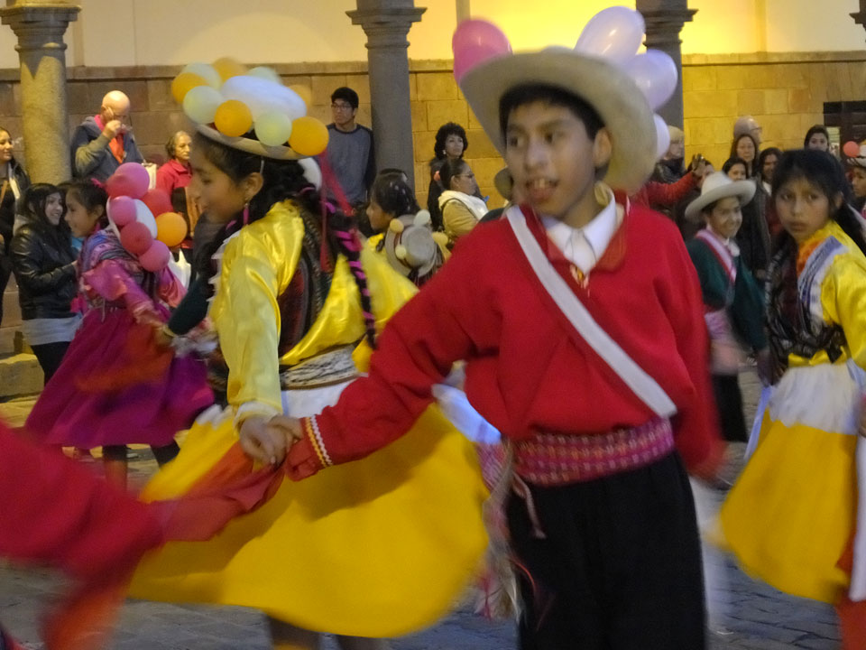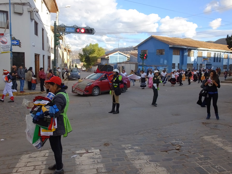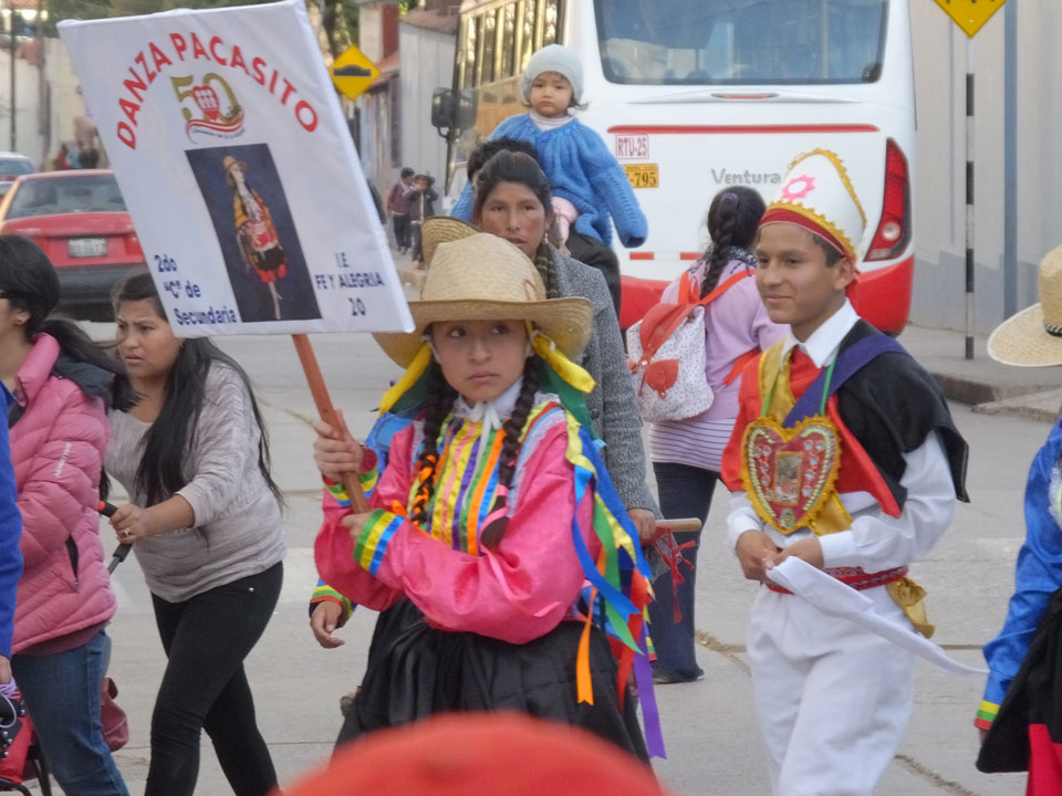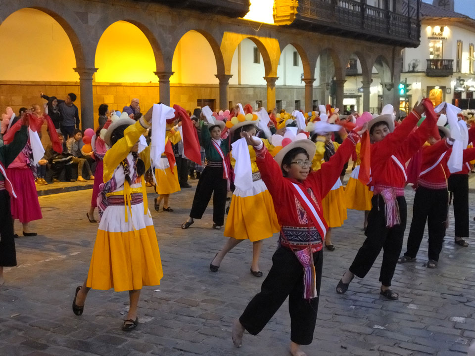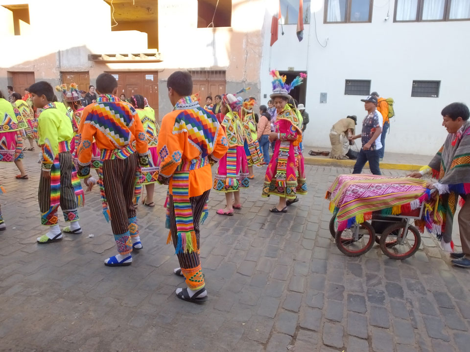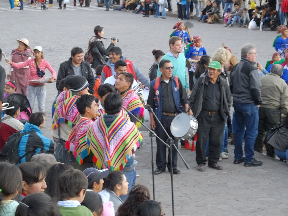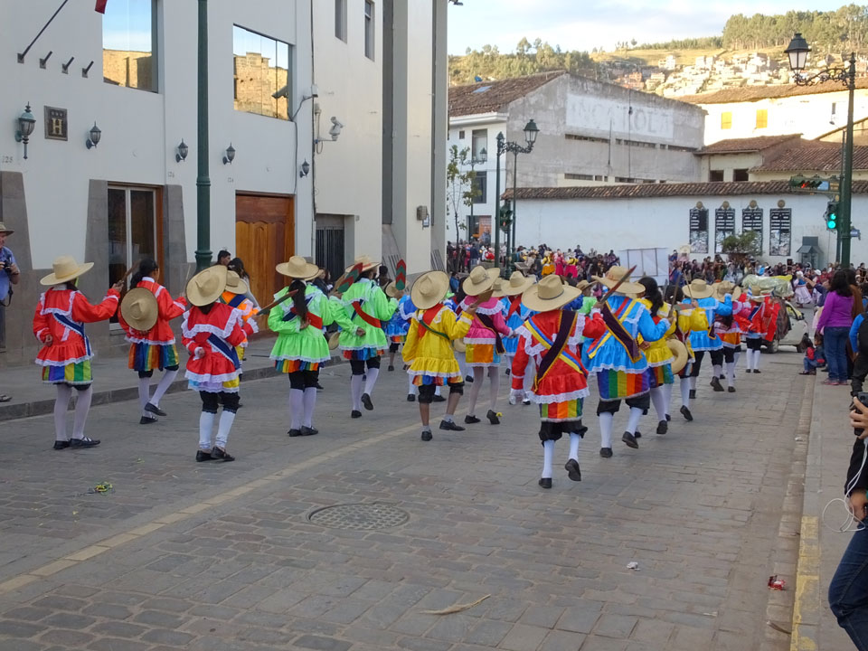 Ich ging ein 1/8 Hühnchen essen – 6 Soles. Danach hörte ich Straßen weiter Musik. Da war mal wieder eine Tanzparade. Heute von Kindern, meist maximal 10 Jahre denke ich mal. Verschiedene Gruppen mit verschiedenen Kostümen. Es war wieder ganz nett anzusehen, wie sie sich auf den Weg zum Plaza de Armas machten. Ich hatte nur etwas Bammel, denn einst wurde mir in Ecuador eine Camera bei so einer Parade geklaut. Ich blieb also gut in Bewegung und in der Nähe der trillerndes Polizistinnen.