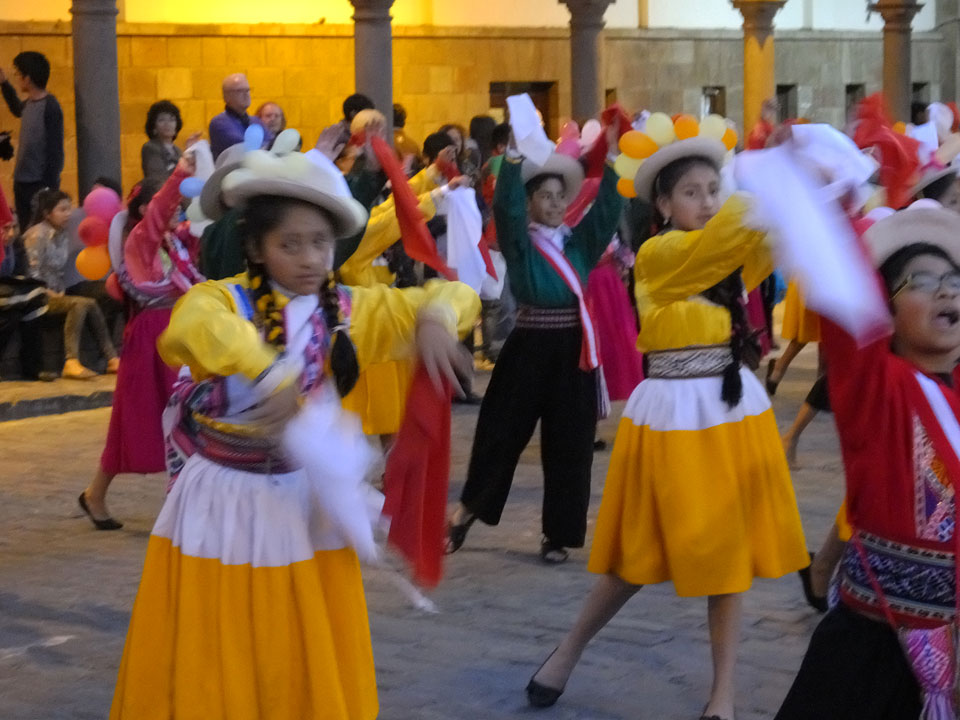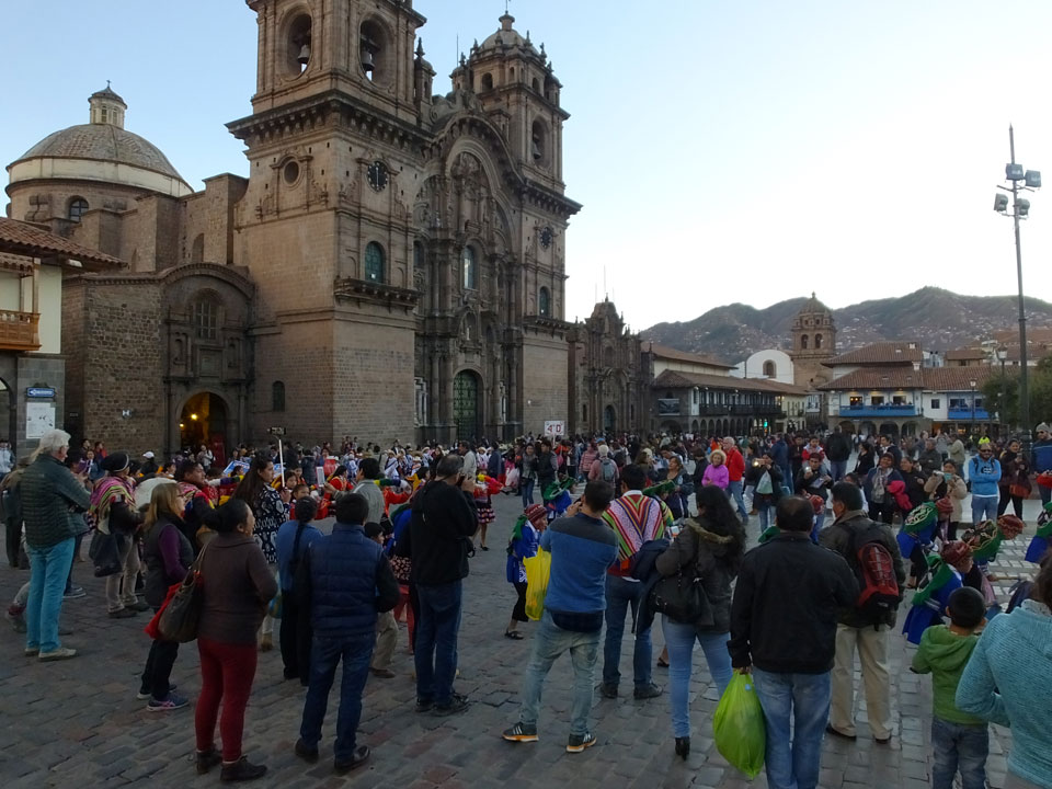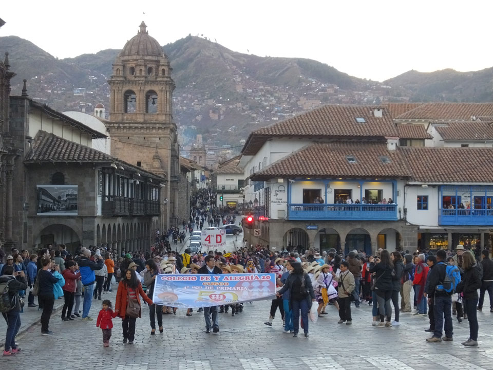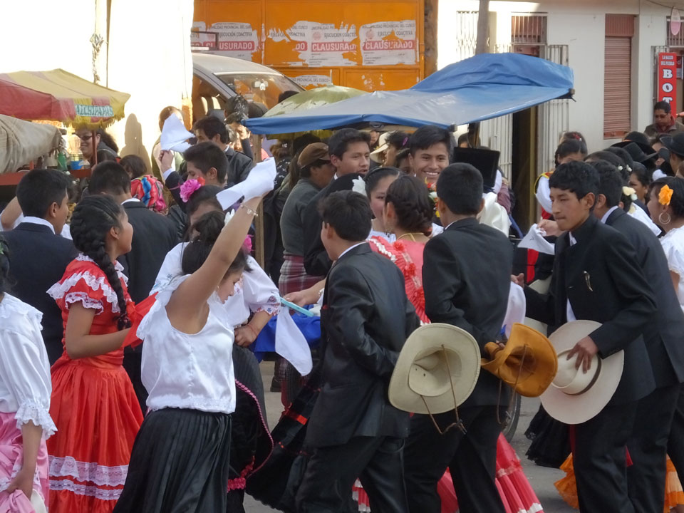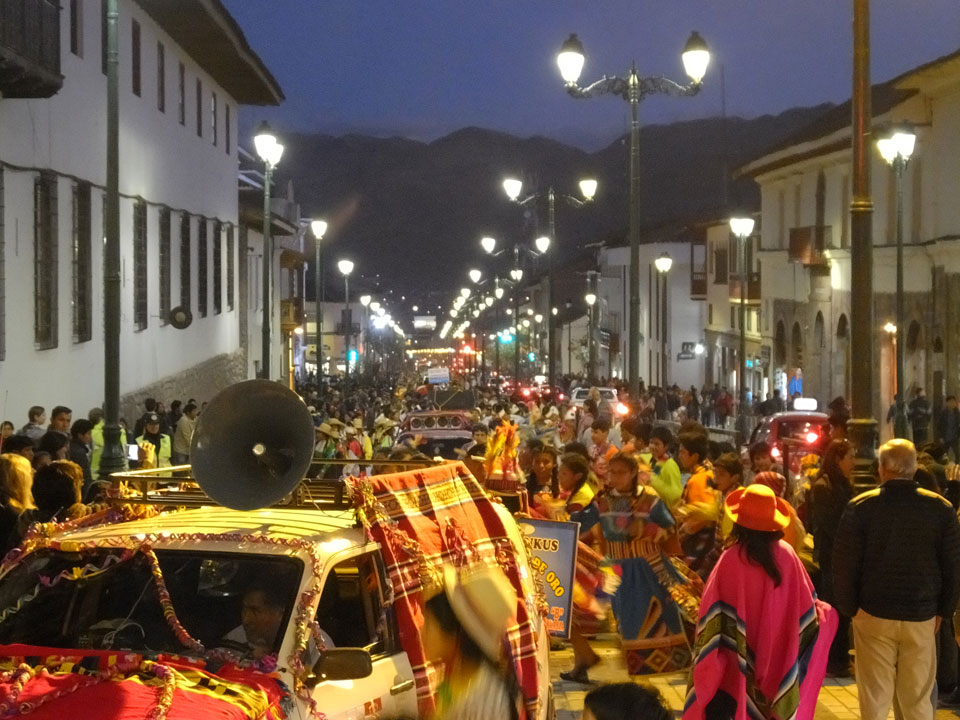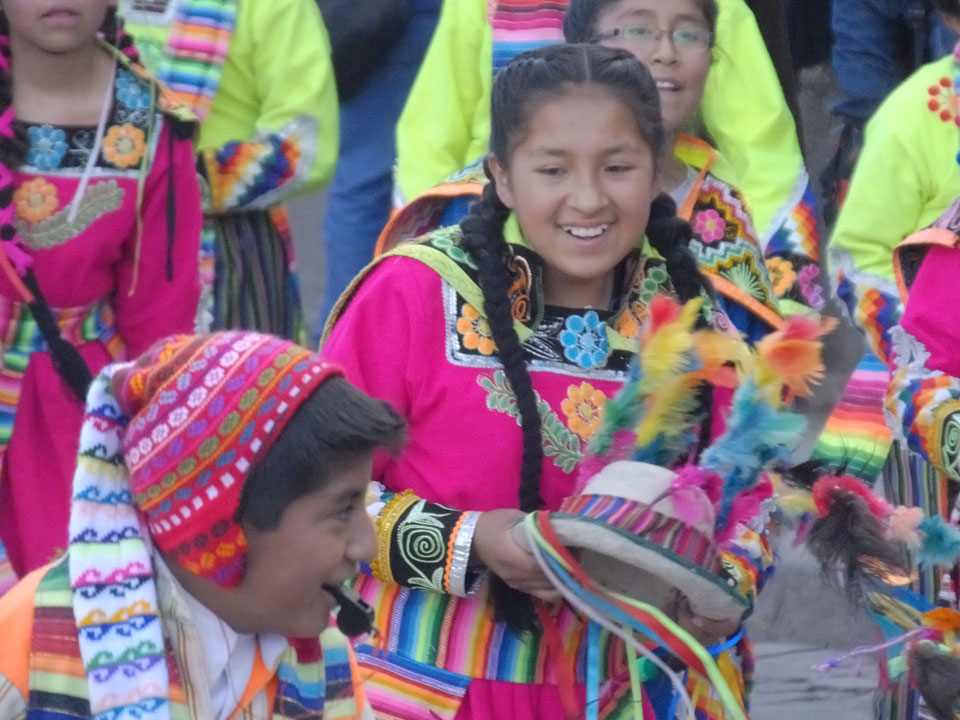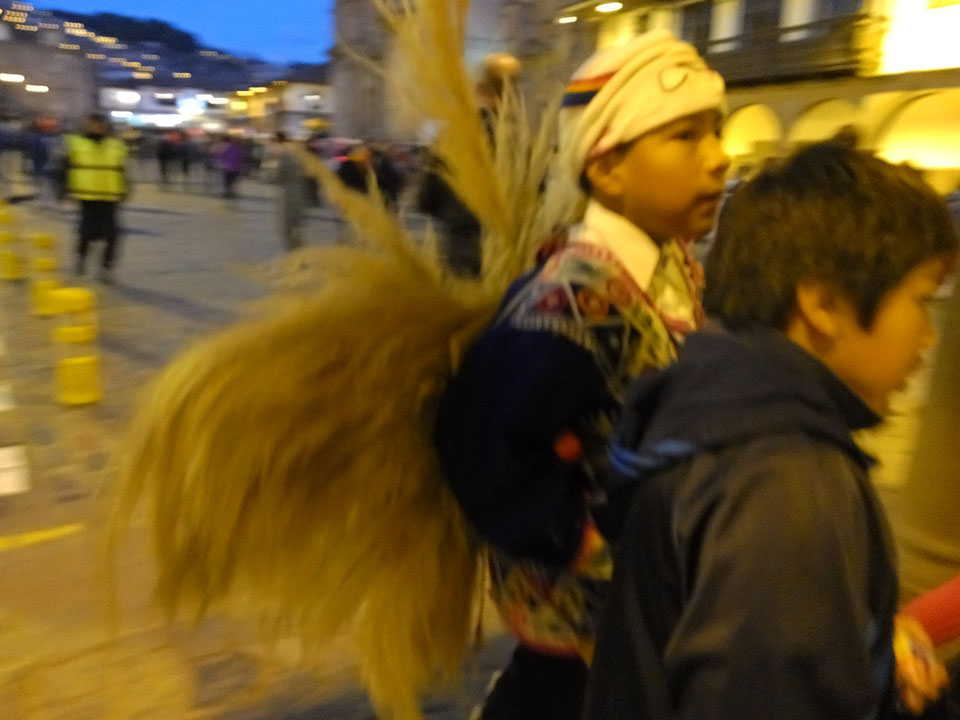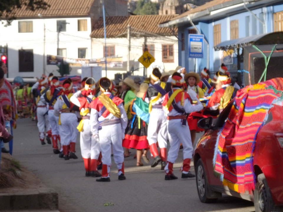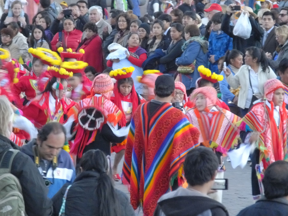 Ich ging ein 1/8 Hühnchen essen – 6 Soles. Danach hörte ich Straßen weiter Musik. Da war mal wieder eine Tanzparade. Heute von Kindern, meist maximal 10 Jahre denke ich mal. Verschiedene Gruppen mit verschiedenen Kostümen. Es war wieder ganz nett anzusehen, wie sie sich auf den Weg zum Plaza de Armas machten. Ich hatte nur etwas Bammel, denn einst wurde mir in Ecuador eine Camera bei so einer Parade geklaut. Ich blieb also gut in Bewegung und in der Nähe der trillerndes Polizistinnen.