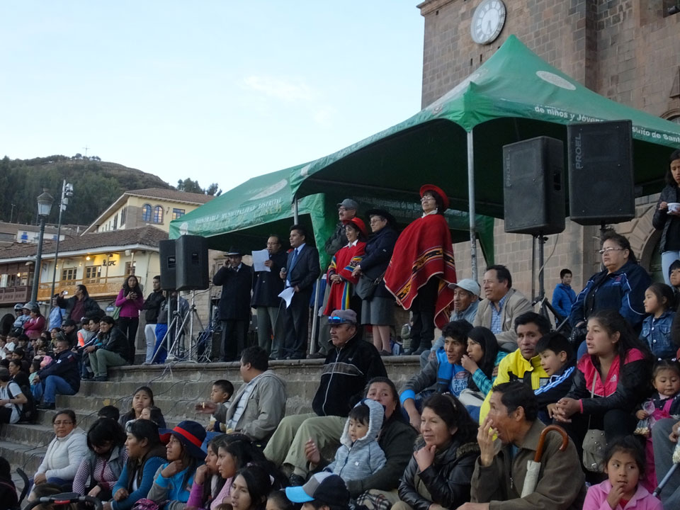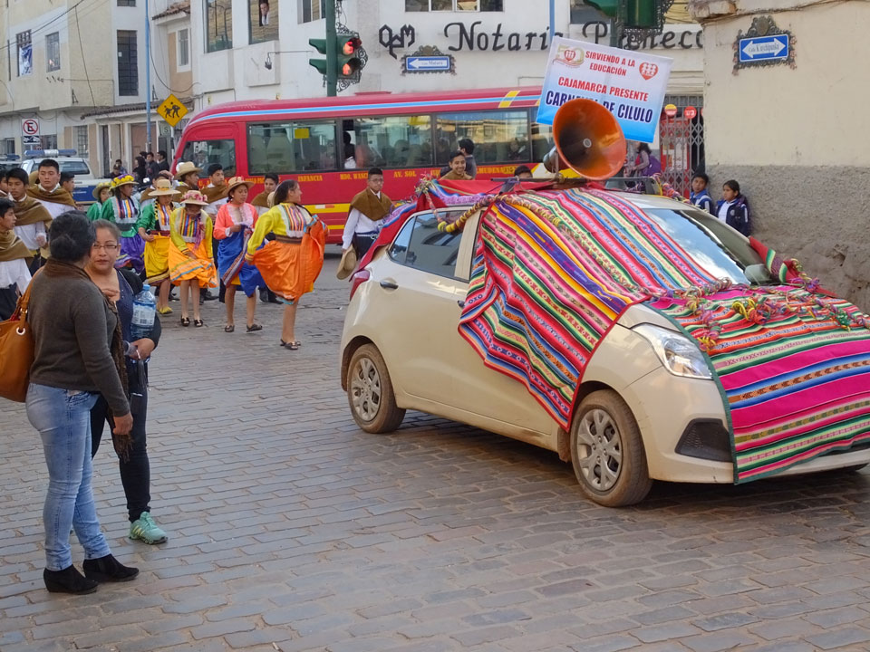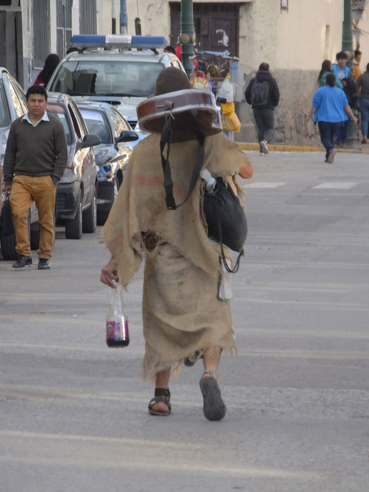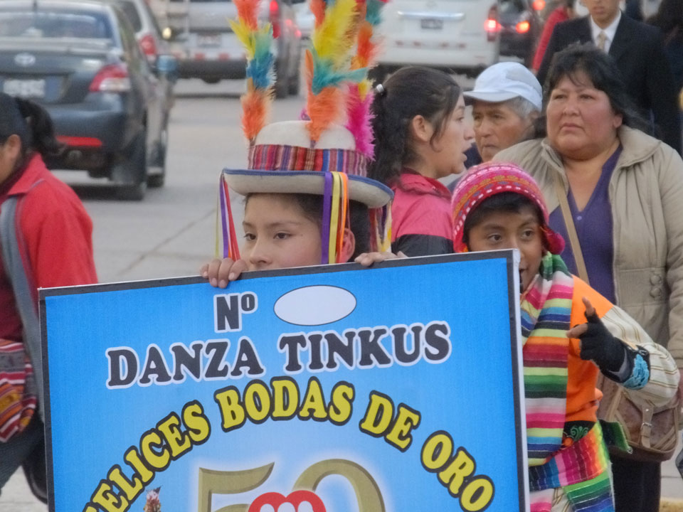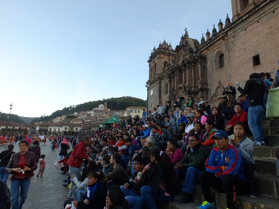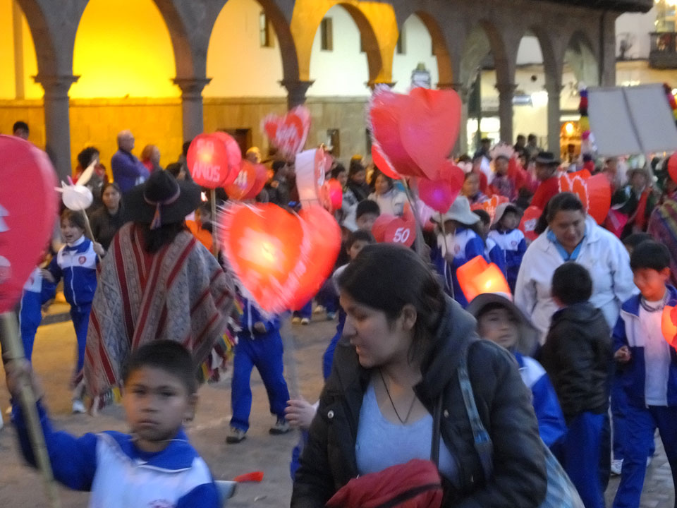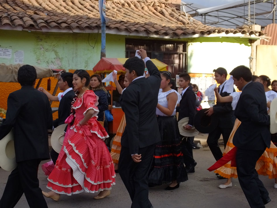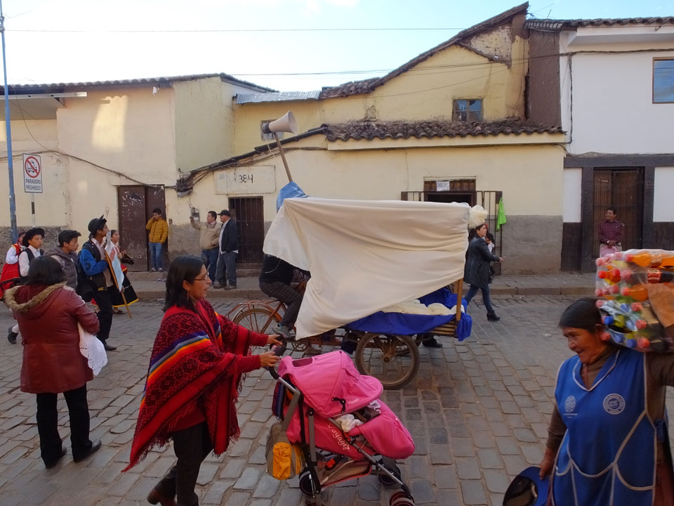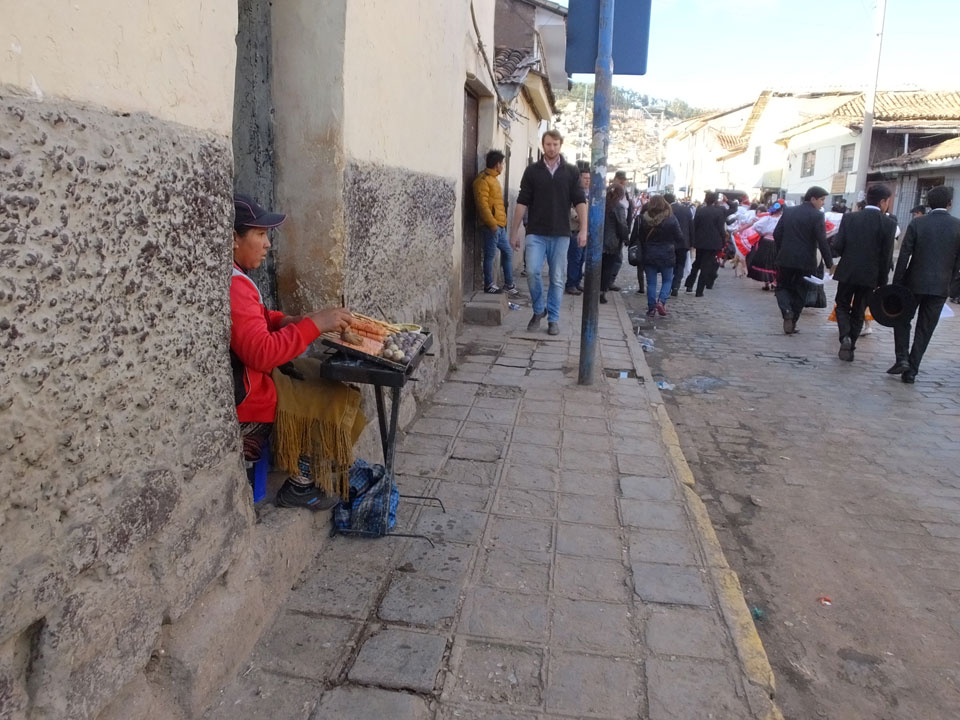 Ich ging ein 1/8 Hühnchen essen – 6 Soles. Danach hörte ich Straßen weiter Musik. Da war mal wieder eine Tanzparade. Heute von Kindern, meist maximal 10 Jahre denke ich mal. Verschiedene Gruppen mit verschiedenen Kostümen. Es war wieder ganz nett anzusehen, wie sie sich auf den Weg zum Plaza de Armas machten. Ich hatte nur etwas Bammel, denn einst wurde mir in Ecuador eine Camera bei so einer Parade geklaut. Ich blieb also gut in Bewegung und in der Nähe der trillerndes Polizistinnen.