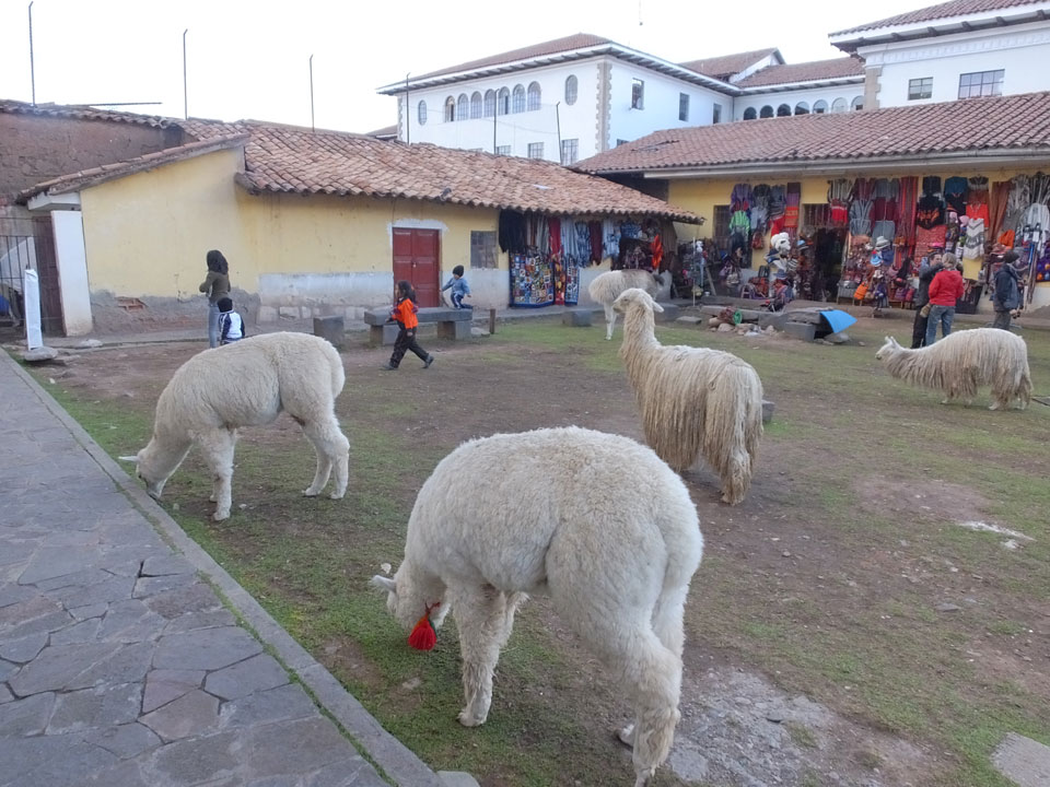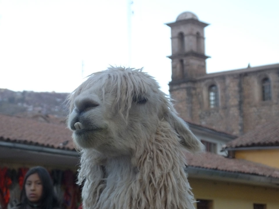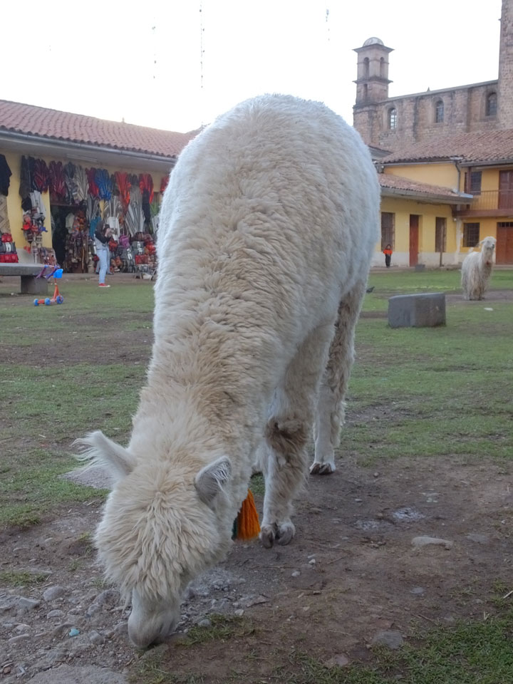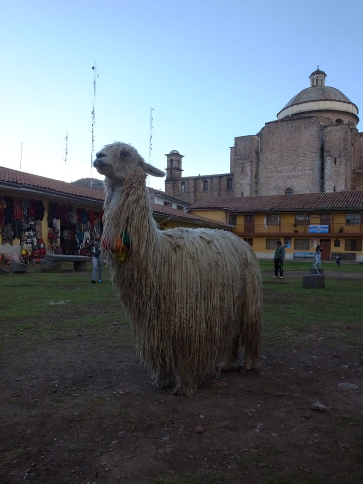 Schließlich einen Abstecher vorbei an Menschenmassen, wo ich ein paar Llamas und Alpacas fand. Bei Souvenirläden hinter der Kathedrale grasten die Tiere. Für 1 Sol ließ ich mir auch mal ein Bild machen. Lustig.