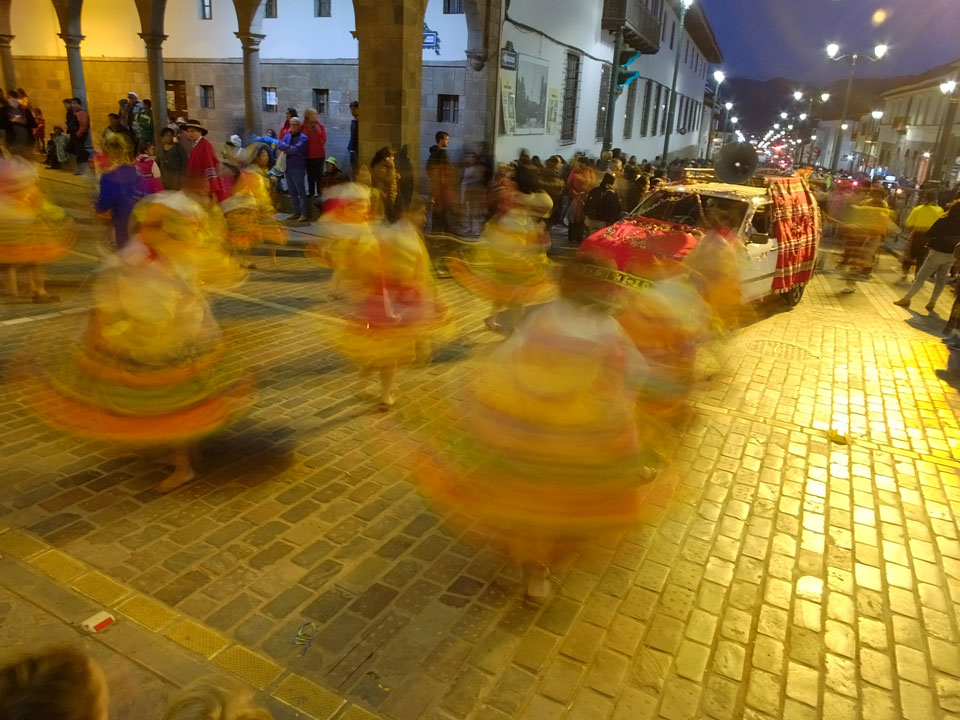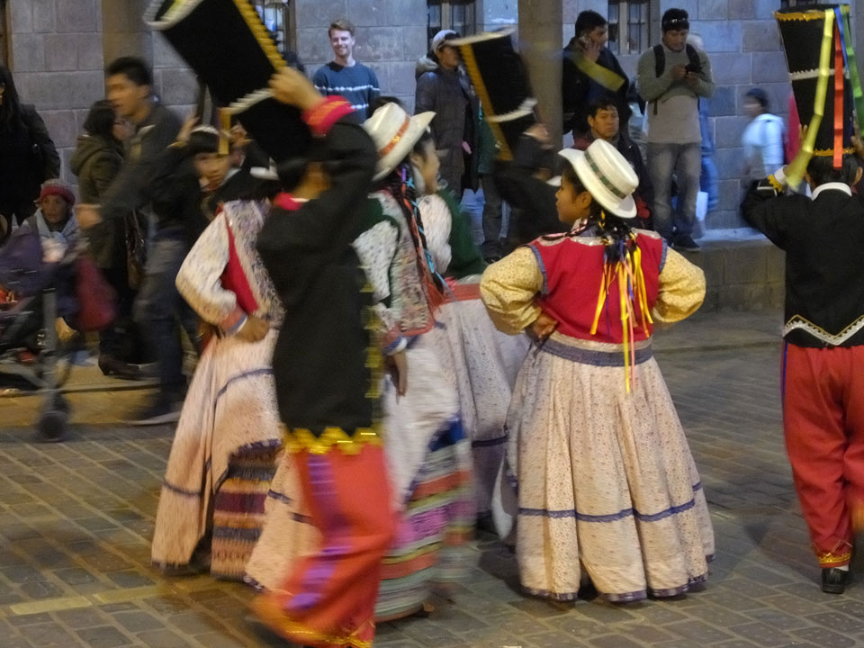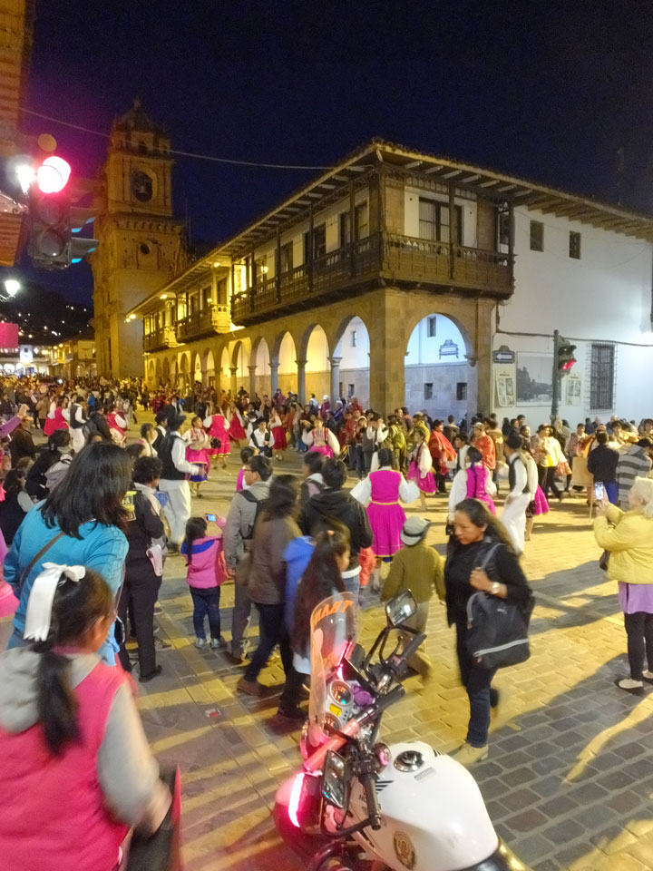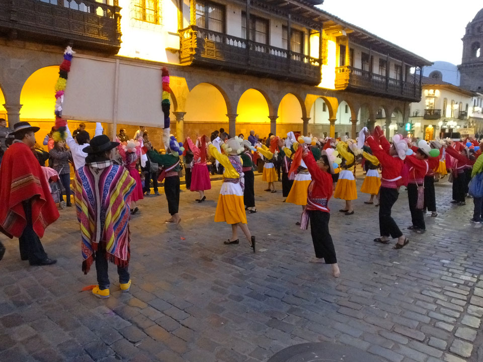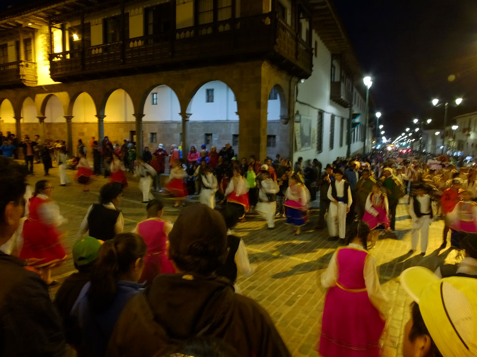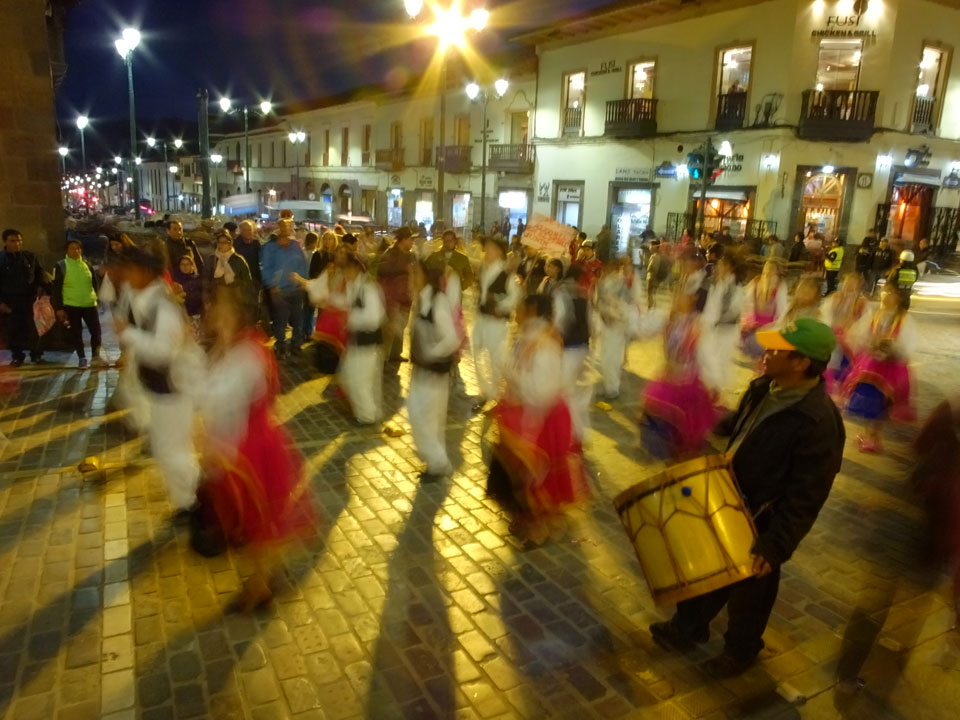Auf dem Plaza dann schaute ich weiter Tanzgruppen. Mit dem Abend schließlich ging’s zurück in’s Hostel und dann erst wieder kurz vor 23:00 raus. Happy Hour bedeutete 2 Pisco für 20 Soles. Mit Peruanischem gelbem Chili gespiced waren die ordentlich scharf. Müde dann noch zu einem Imbiss bei Bembos und in die Clubs am Plaza.