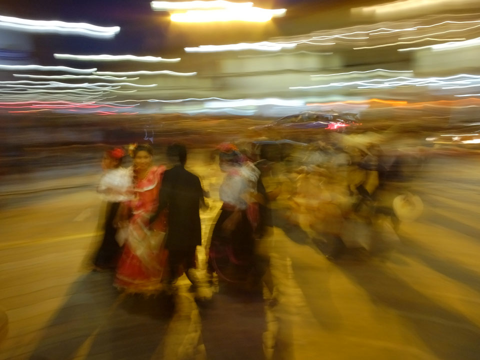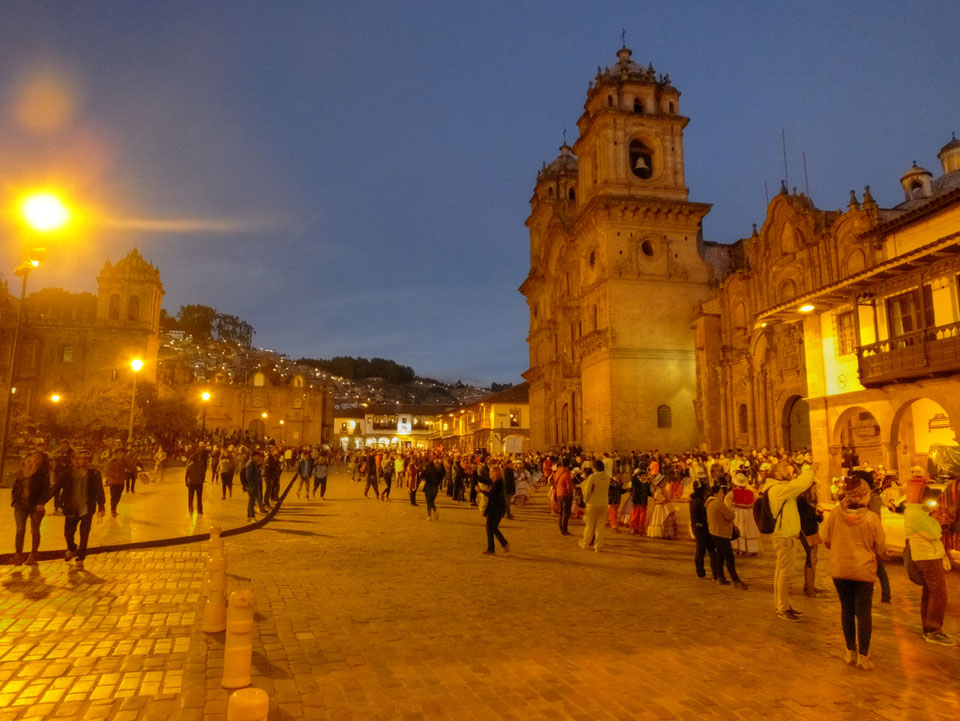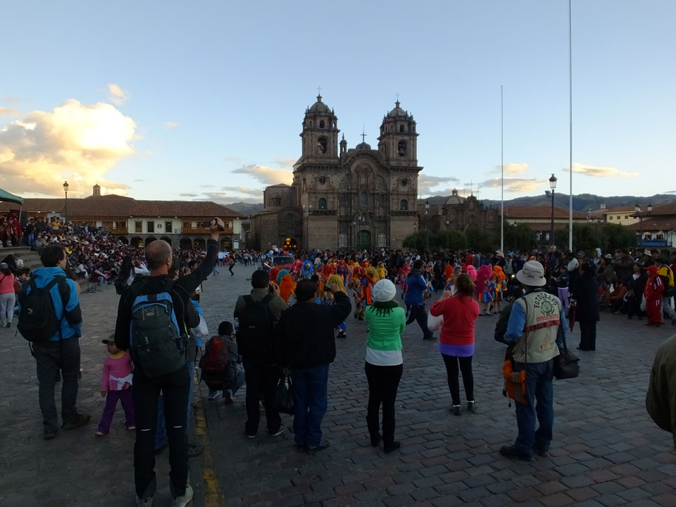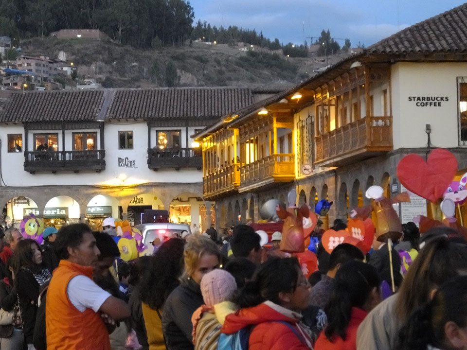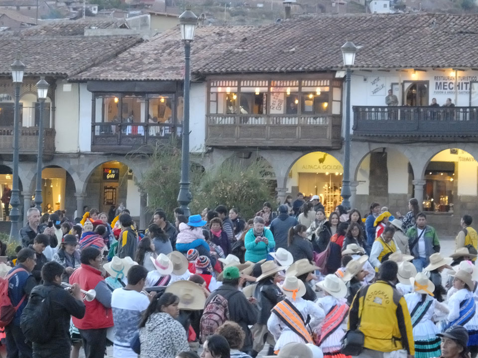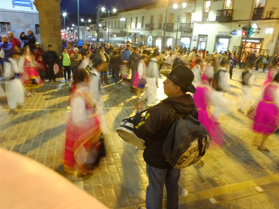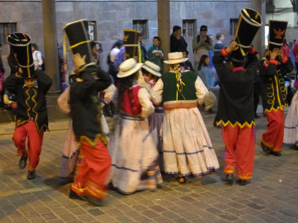 Auf dem Plaza dann schaute ich weiter Tanzgruppen. Mit dem Abend schließlich ging’s zurück in’s Hostel und dann erst wieder kurz vor 23:00 raus. Happy Hour bedeutete 2 Pisco für 20 Soles. Mit Peruanischem gelbem Chili gespiced waren die ordentlich scharf. Müde dann noch zu einem Imbiss bei Bembos und in die Clubs am Plaza.