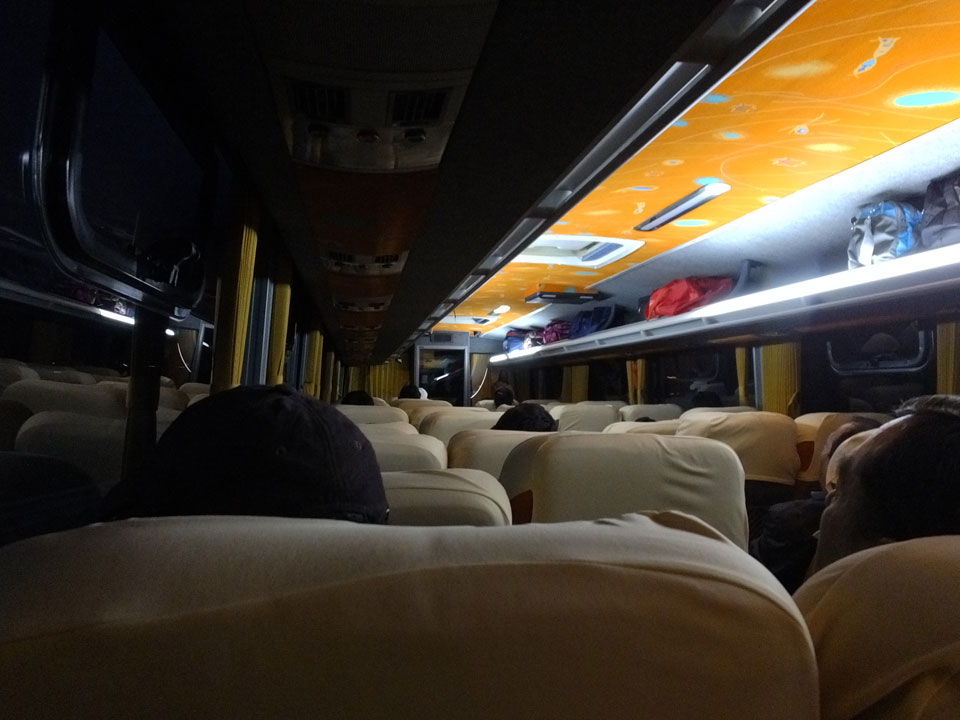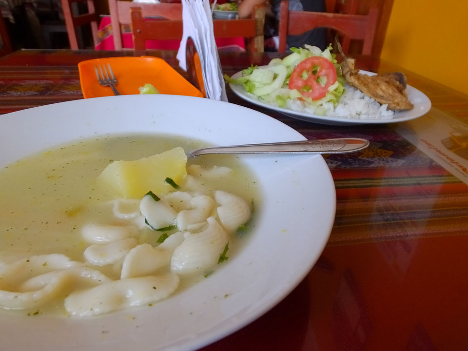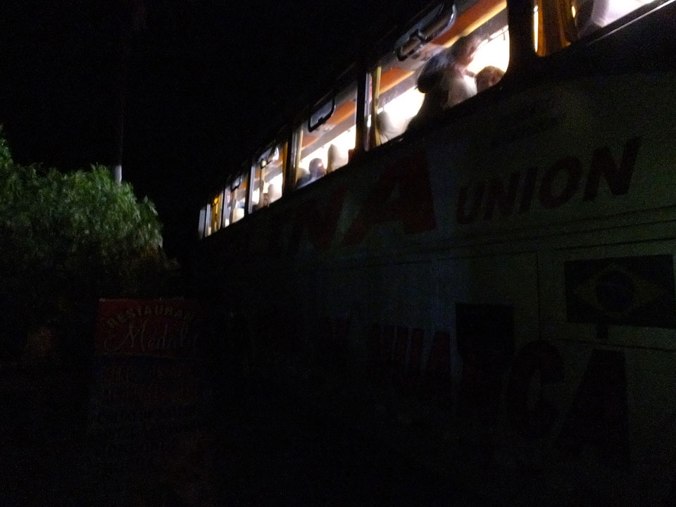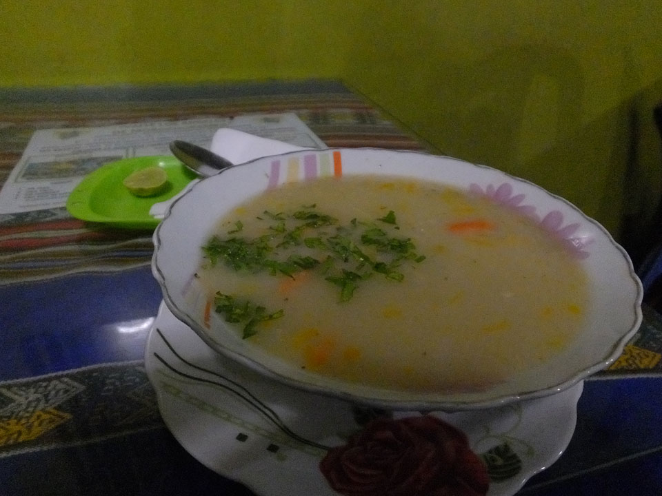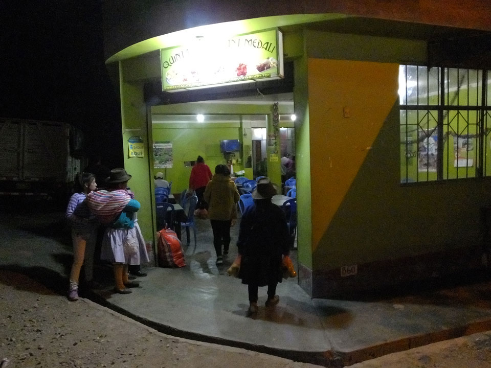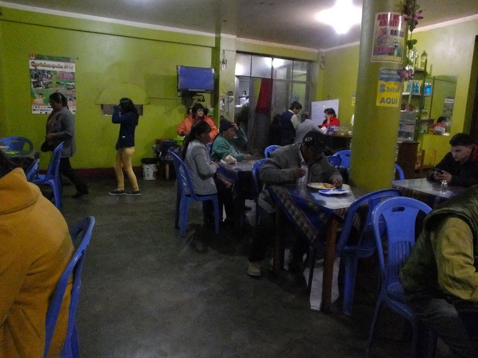 Es gab auch mal Abendessen an irgendeinem Berg-Dorf-Stopp. Die Dörfler aus dem Bus drängelten sich alle vor. Als Gringo wurde ich heute mal ordentlich gedisst. Die Suppe, die ich kaufte, wurde auch erst vergessen und kam dann auch ohne irgendwas Fleischhaftes.