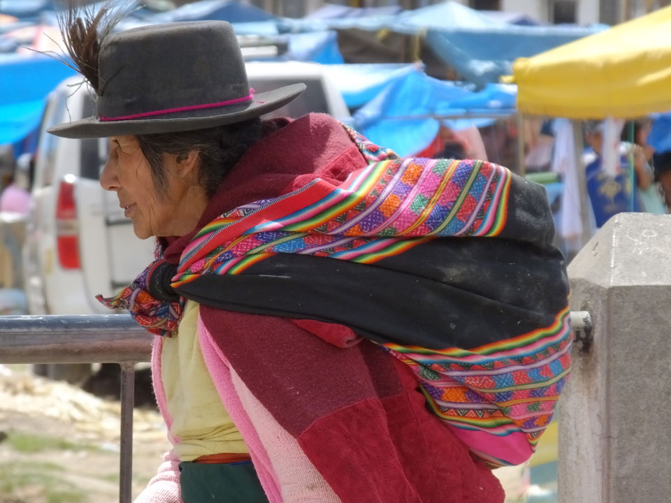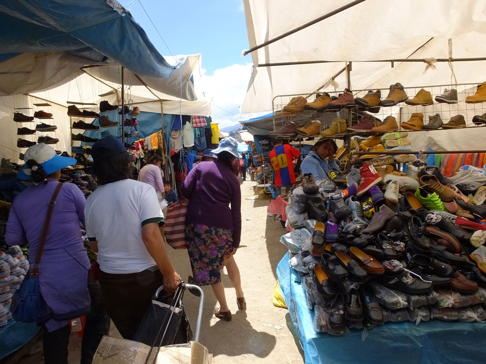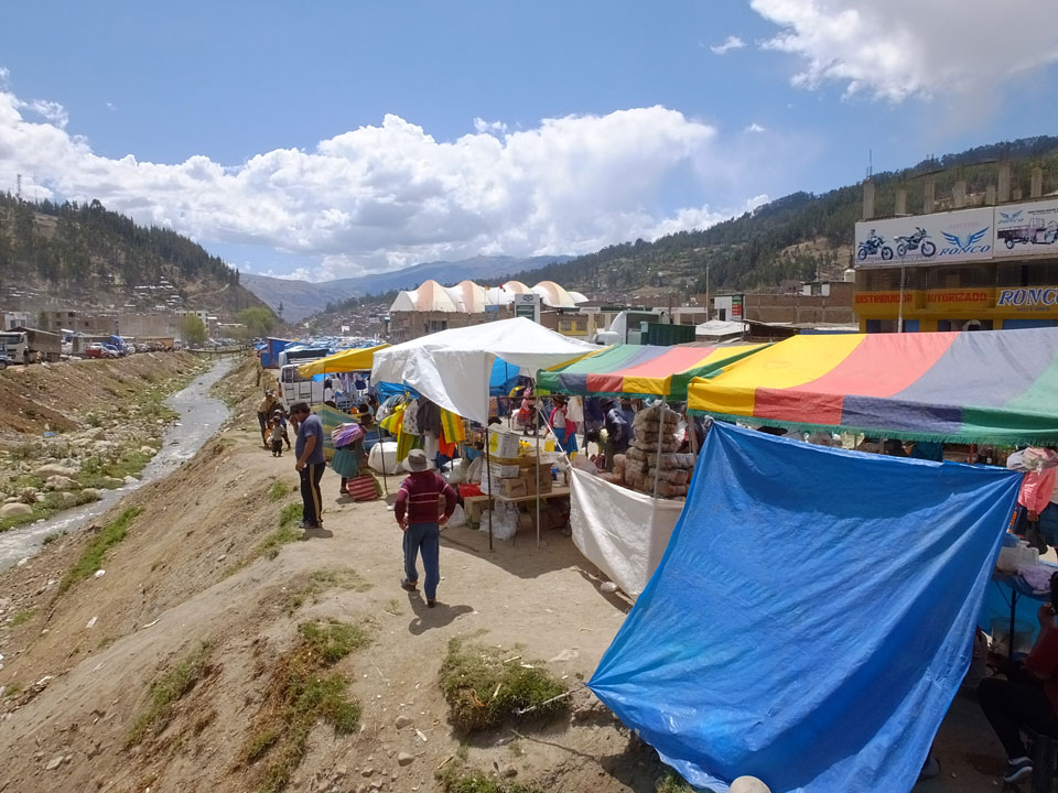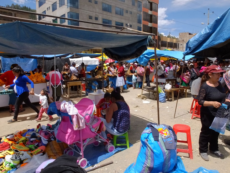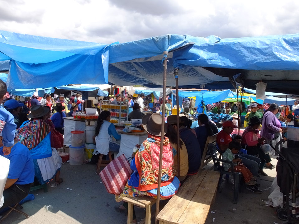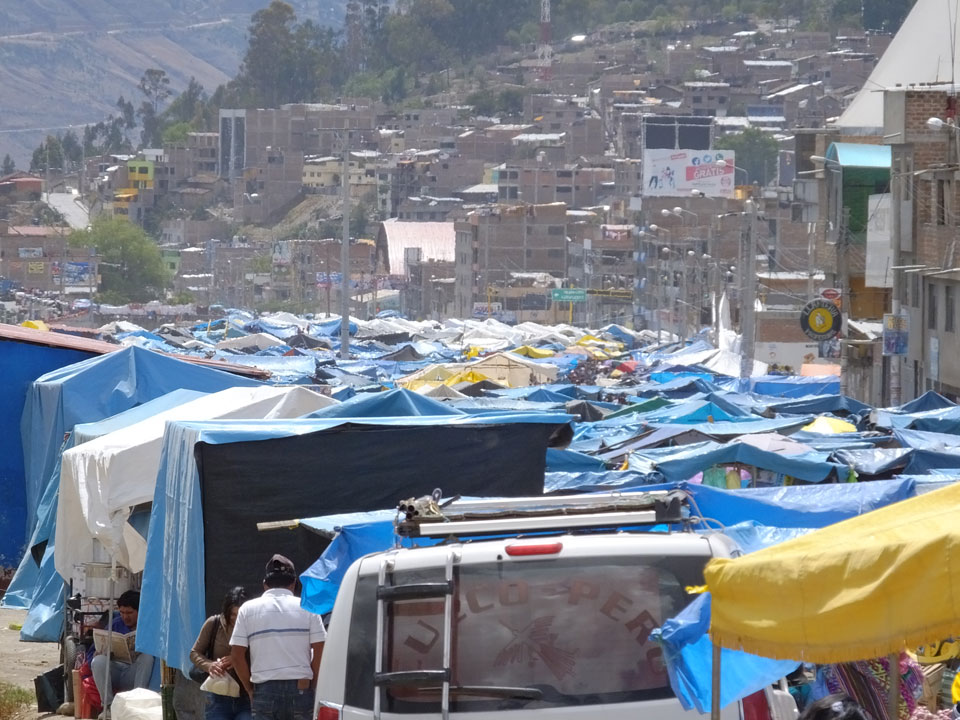 Ich kaufte als das Molina-Ticket und machte erst mal Mittag. Für gerade mal 4 Soles bekam ich Suppe, Fisch mit Reise und was zu trinken. Den Markt fand ich dann weiter östlich. Eine Menge Quechua machten sich schon auf die Heimreise. Irgendwie sind mir die Leute unsympatsich, weiß nicht warum. Es kann an der Tracht liegen – die komischen Hüte und Socken. Ich war jedenfalls viel zu warm angezogen und schwitze dann auch schnell.