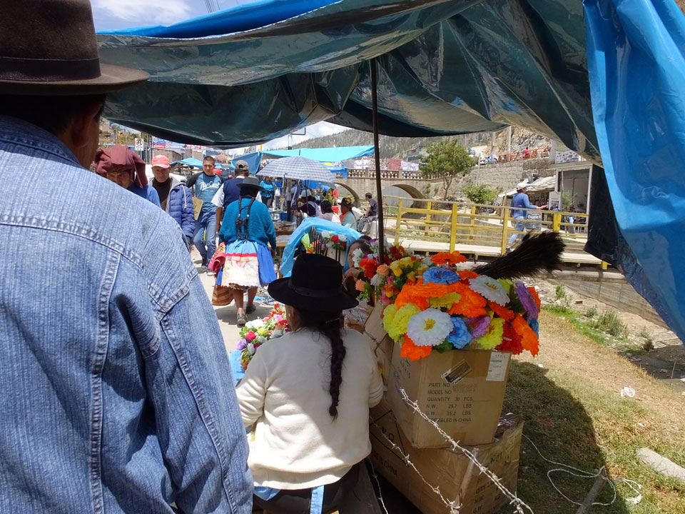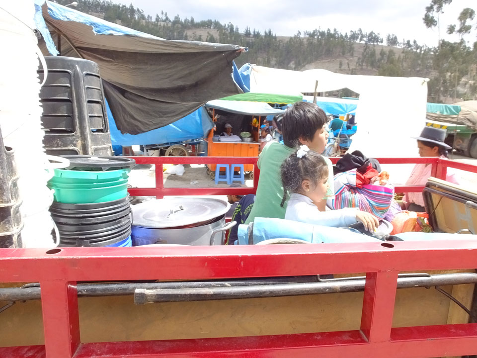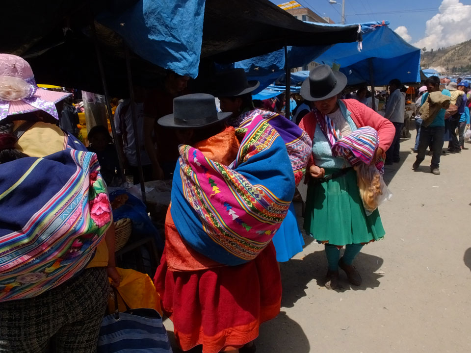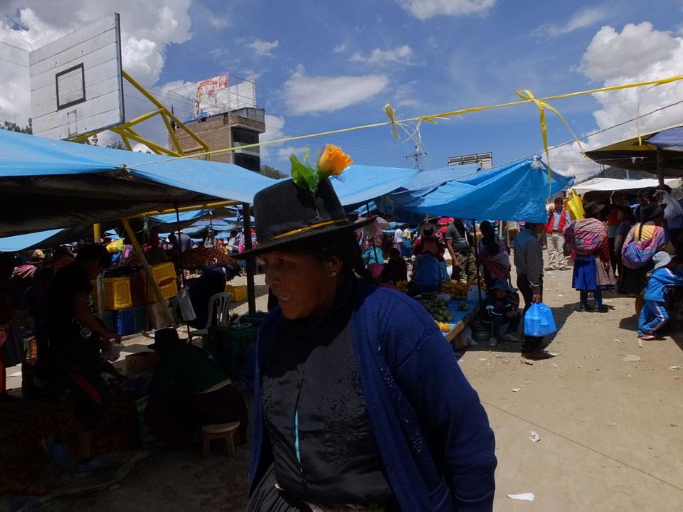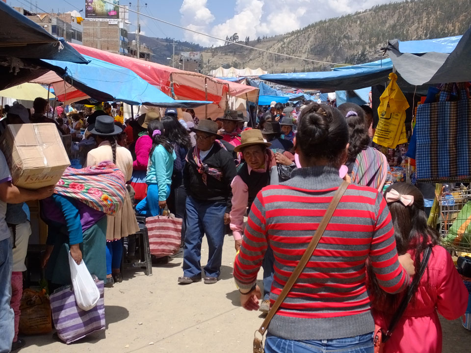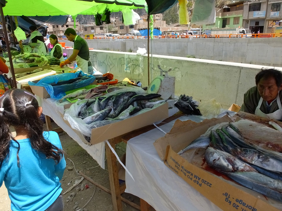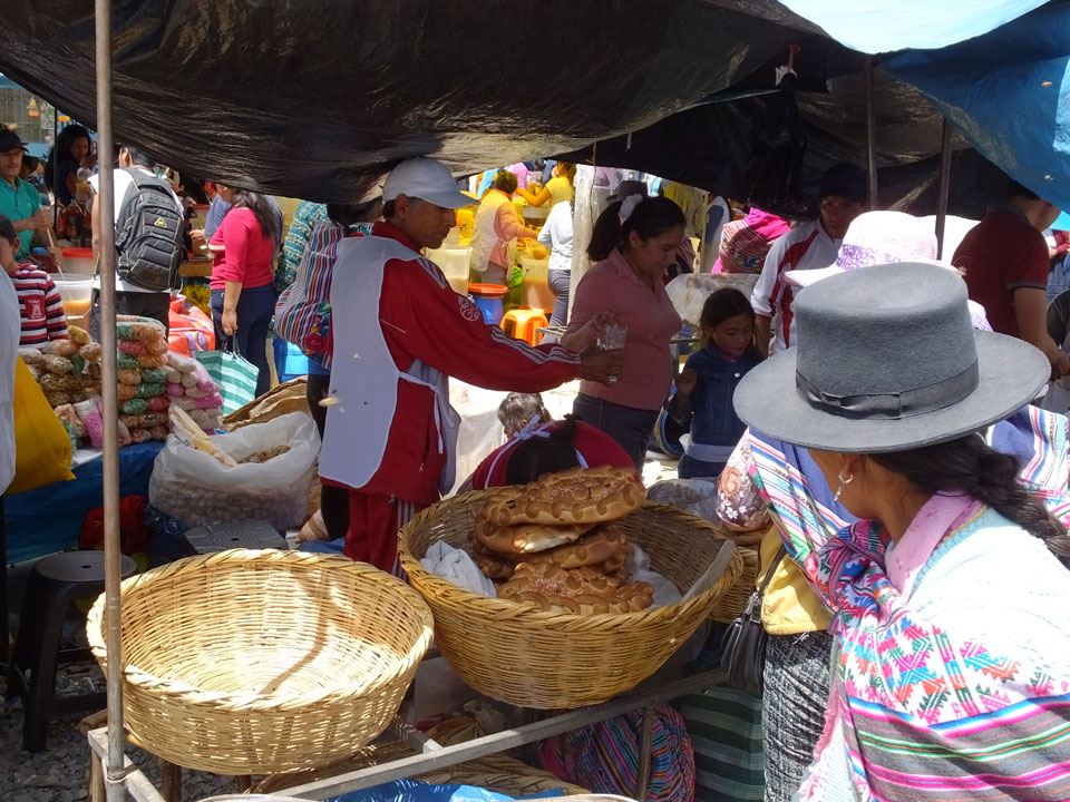 Ich kaufte als das Molina-Ticket und machte erst mal Mittag. Für gerade mal 4 Soles bekam ich Suppe, Fisch mit Reise und was zu trinken. Den Markt fand ich dann weiter östlich. Eine Menge Quechua machten sich schon auf die Heimreise. Irgendwie sind mir die Leute unsympatsich, weiß nicht warum. Es kann an der Tracht liegen – die komischen Hüte und Socken. Ich war jedenfalls viel zu warm angezogen und schwitze dann auch schnell.