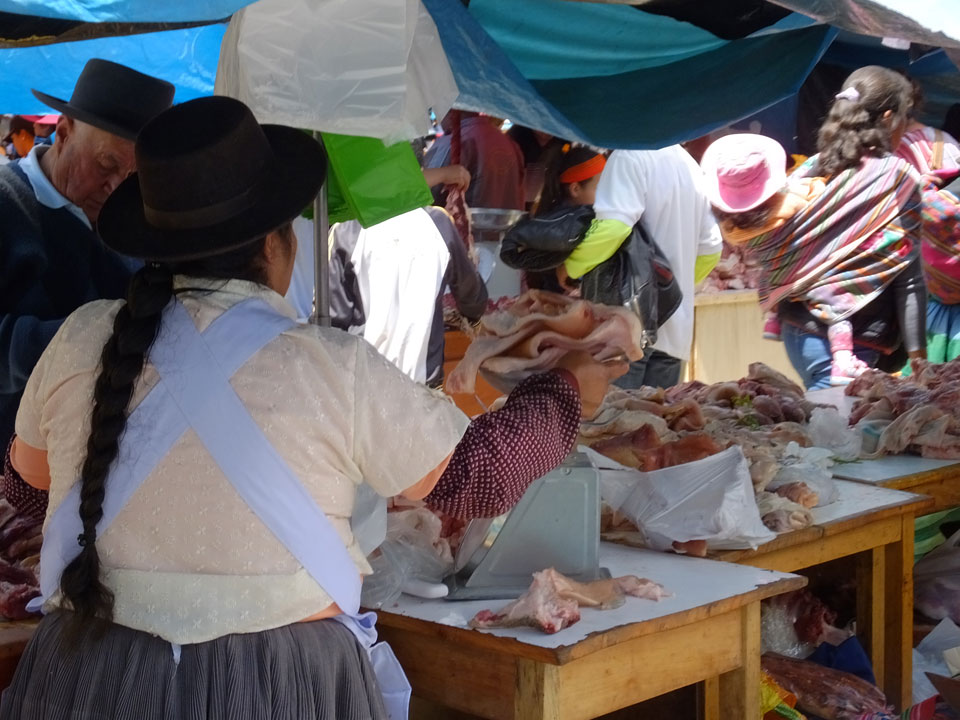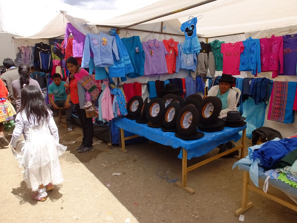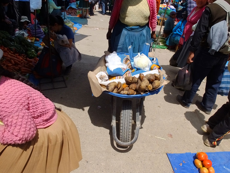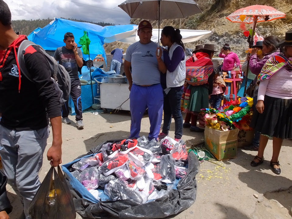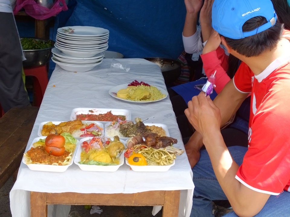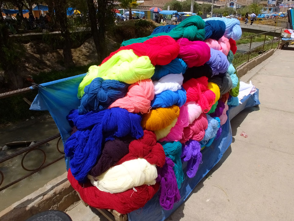 Ich kaufte als das Molina-Ticket und machte erst mal Mittag. Für gerade mal 4 Soles bekam ich Suppe, Fisch mit Reise und was zu trinken. Den Markt fand ich dann weiter östlich. Eine Menge Quechua machten sich schon auf die Heimreise. Irgendwie sind mir die Leute unsympatsich, weiß nicht warum. Es kann an der Tracht liegen – die komischen Hüte und Socken. Ich war jedenfalls viel zu warm angezogen und schwitze dann auch schnell.