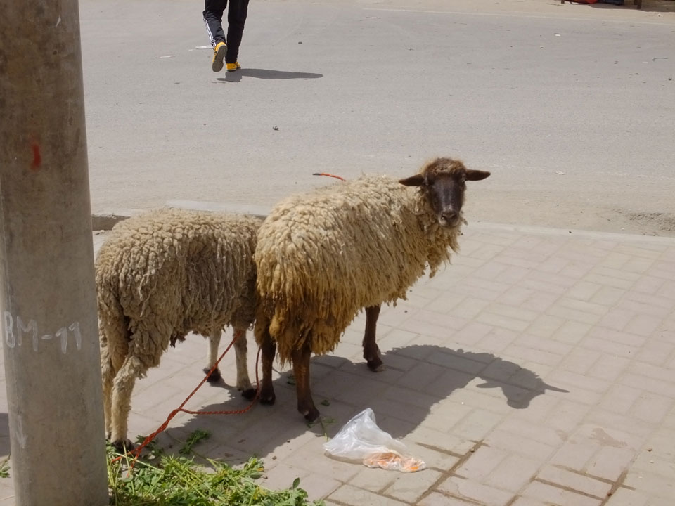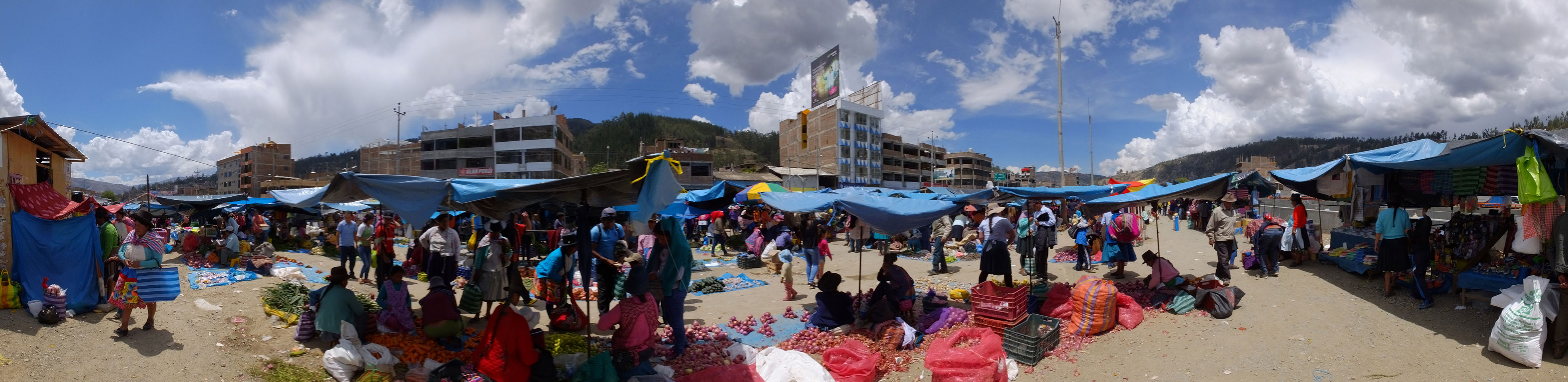 Der Markt war eine recht wilde Ansammlung von Ständen. Oft auch nicht mal mit Stand, die Zwiebeln und Kartoffel und was es sonst so gab, lag einfach auf dem Boden. Was alles vereinte, waren die blauen Plastik-Planen, die als Sonnenschutz aufgespannt waren.