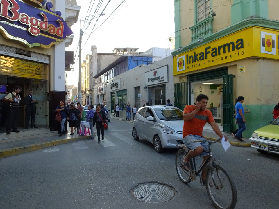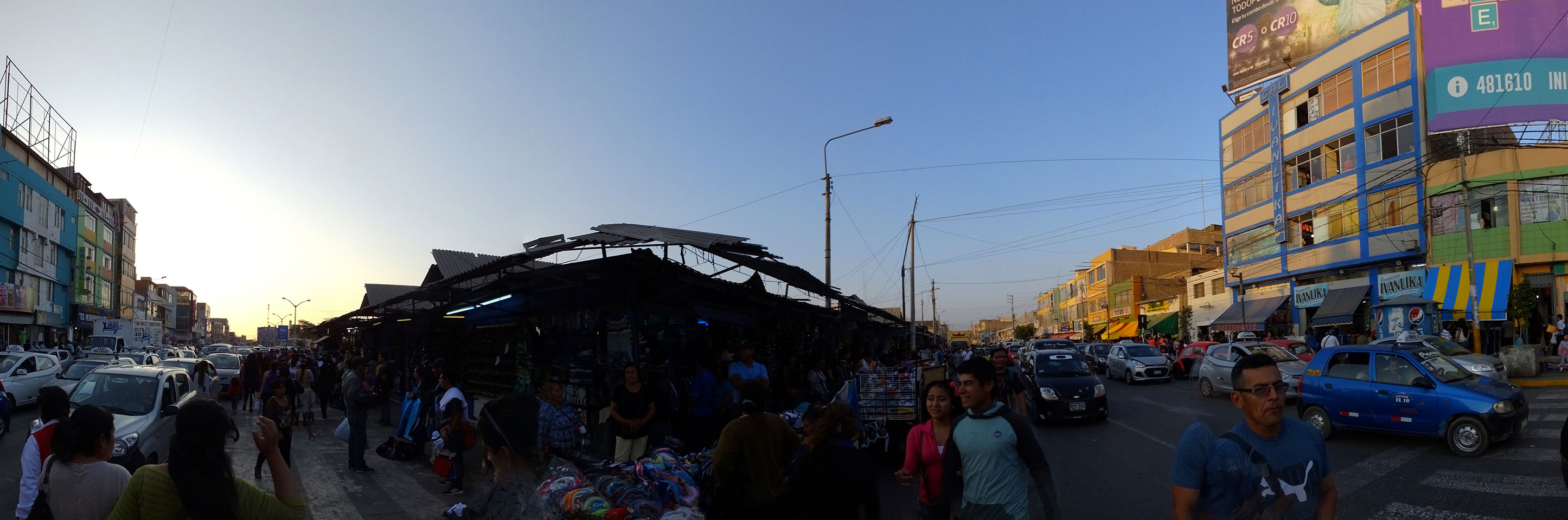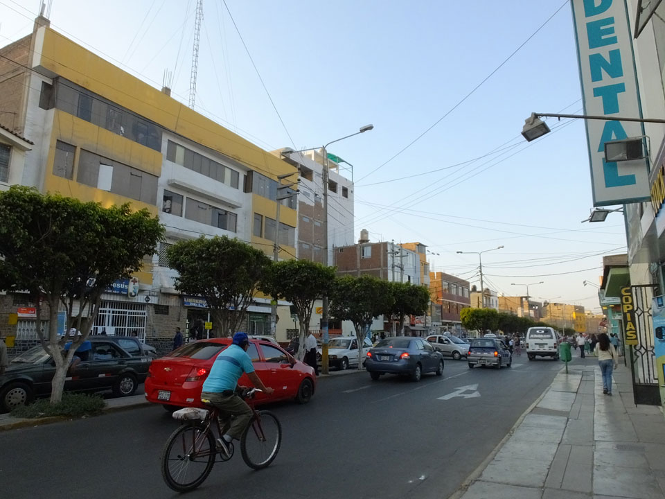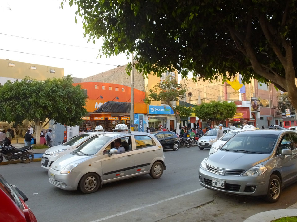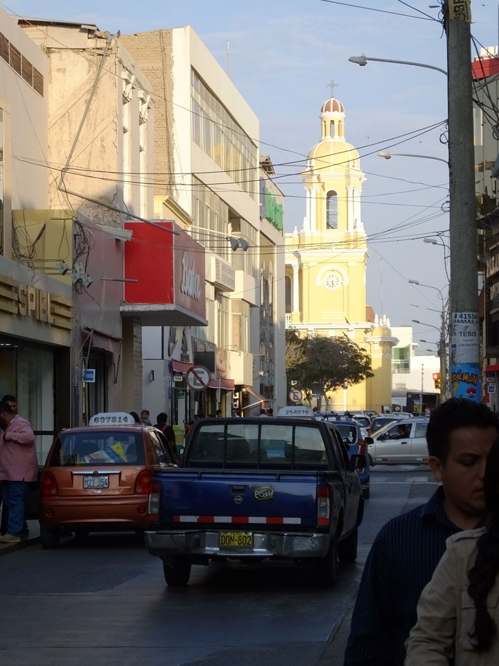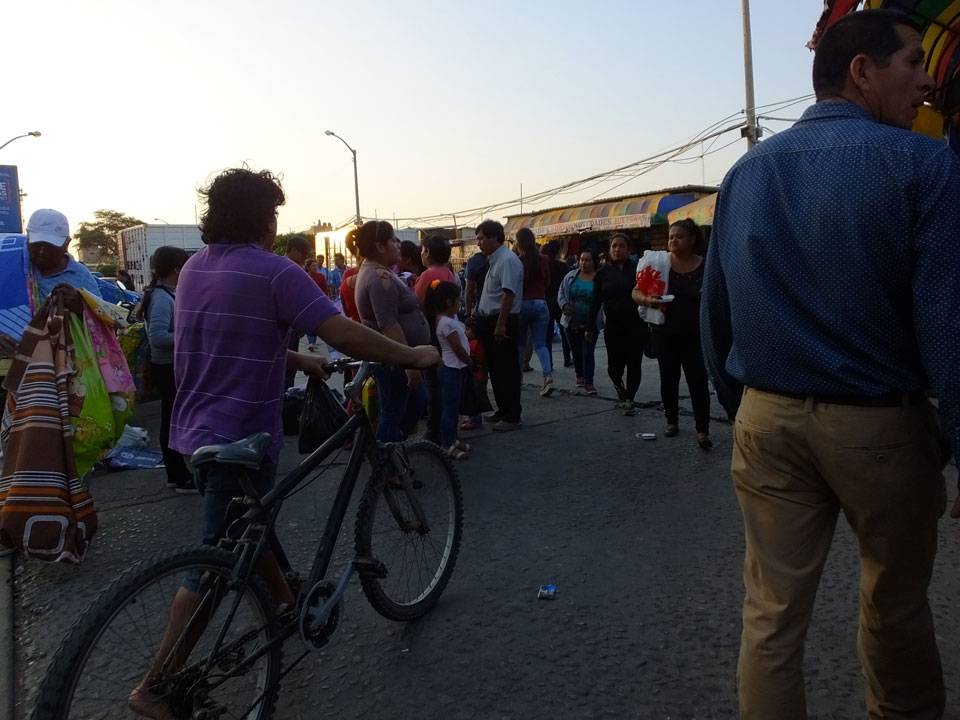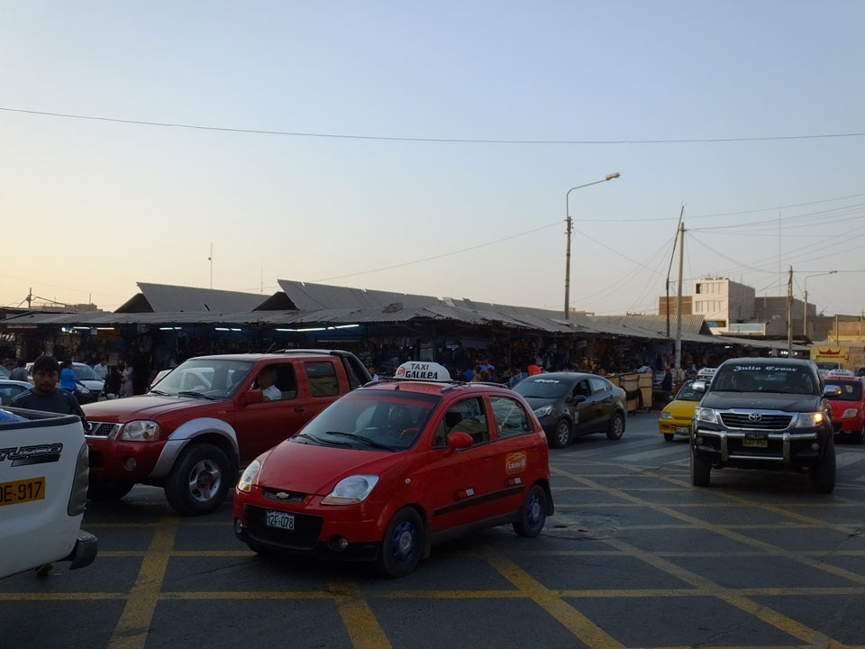 Um 17:00 dann ließ ich meine Sachen im Amigos zurück und drehte eine Runde durch Chiclayo. Die Stadt ist lebendig. Überall laufen Leute herum, werden Sachen verkauft, Autos hupen. Ich sah weit und breit keinen Ausländer. Mit meiner Fuji wurde ich etwas beäugt. Ganz so angenehm war mir die Sache nicht, da mein Ziel der Markt war. Ein paar Blöcke nördlich vom Plaza sammelten sich dort auch viele Stände mit allerlei. Wenn ich nur Platz hätte und die Sachen nicht schleppen müsste, würde ich schon ein paar Sachen finden. So aber blieb es bei hastigem Schritt durch die Gegend und einem langen Abendessen.