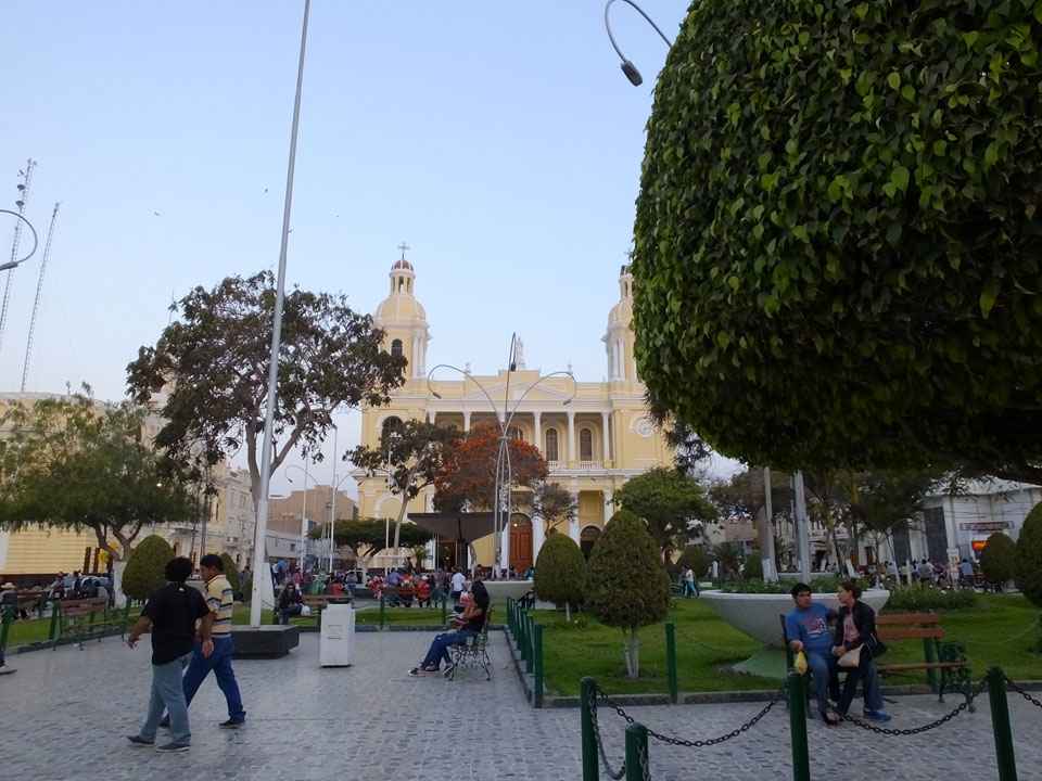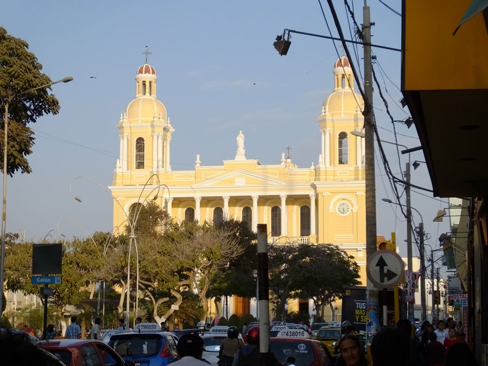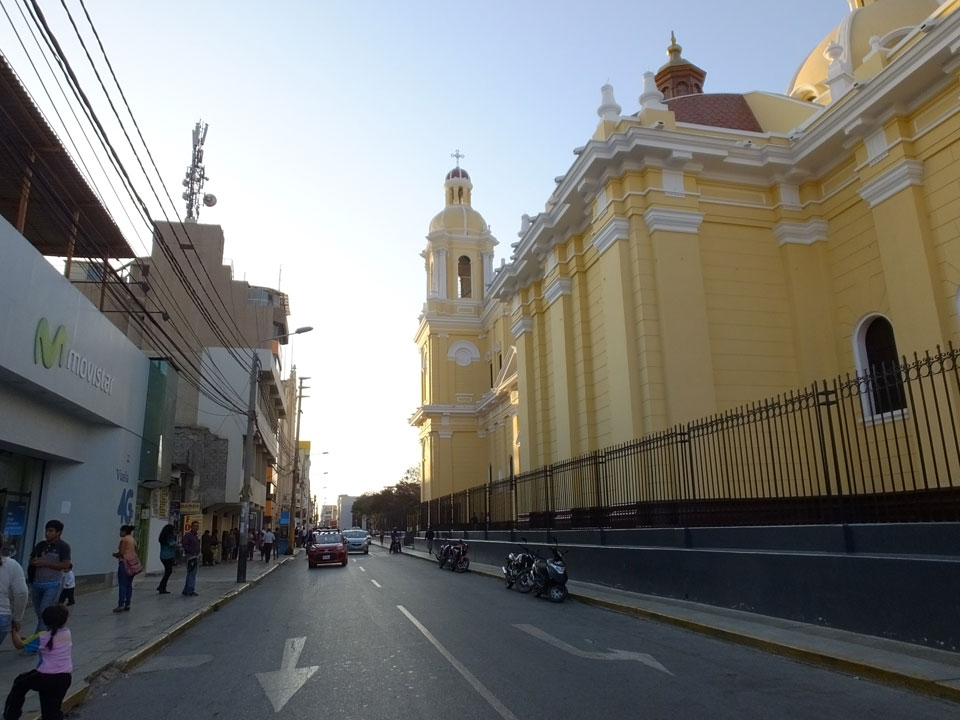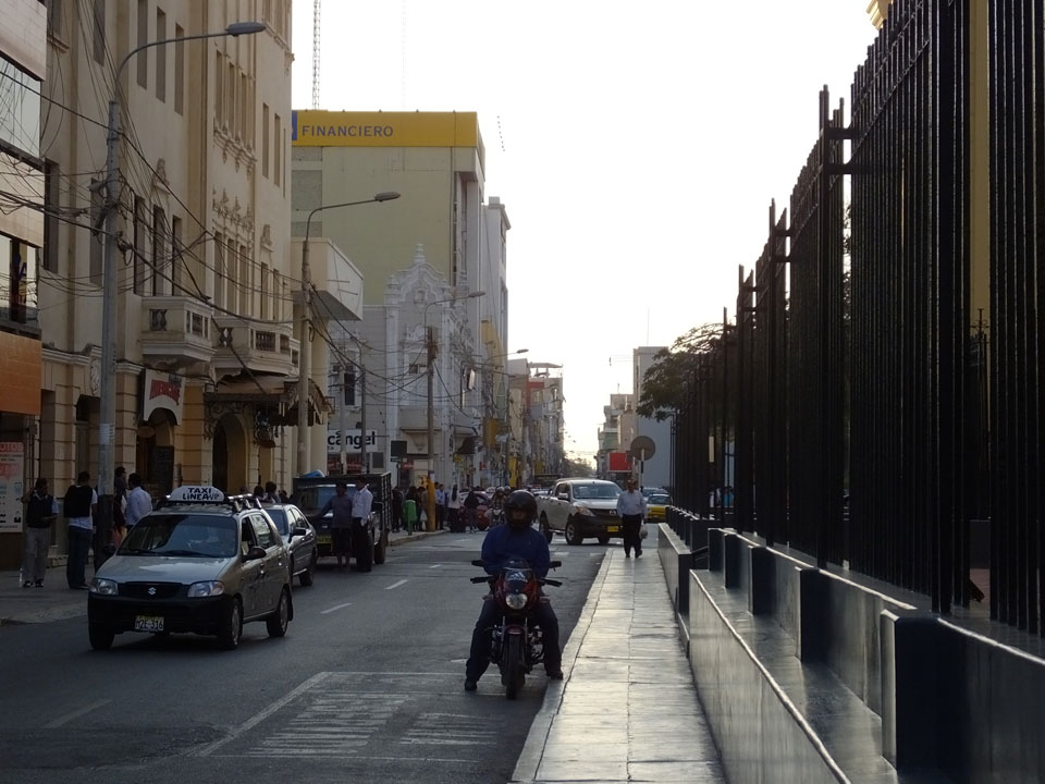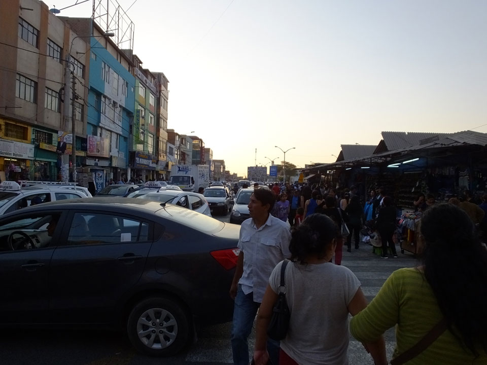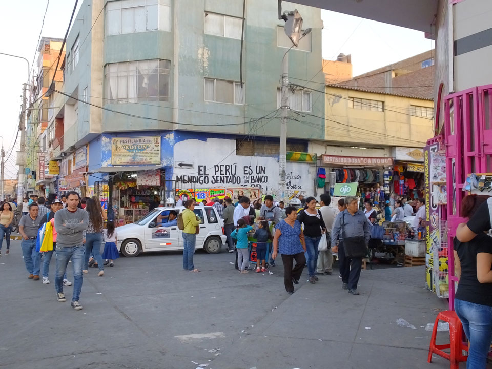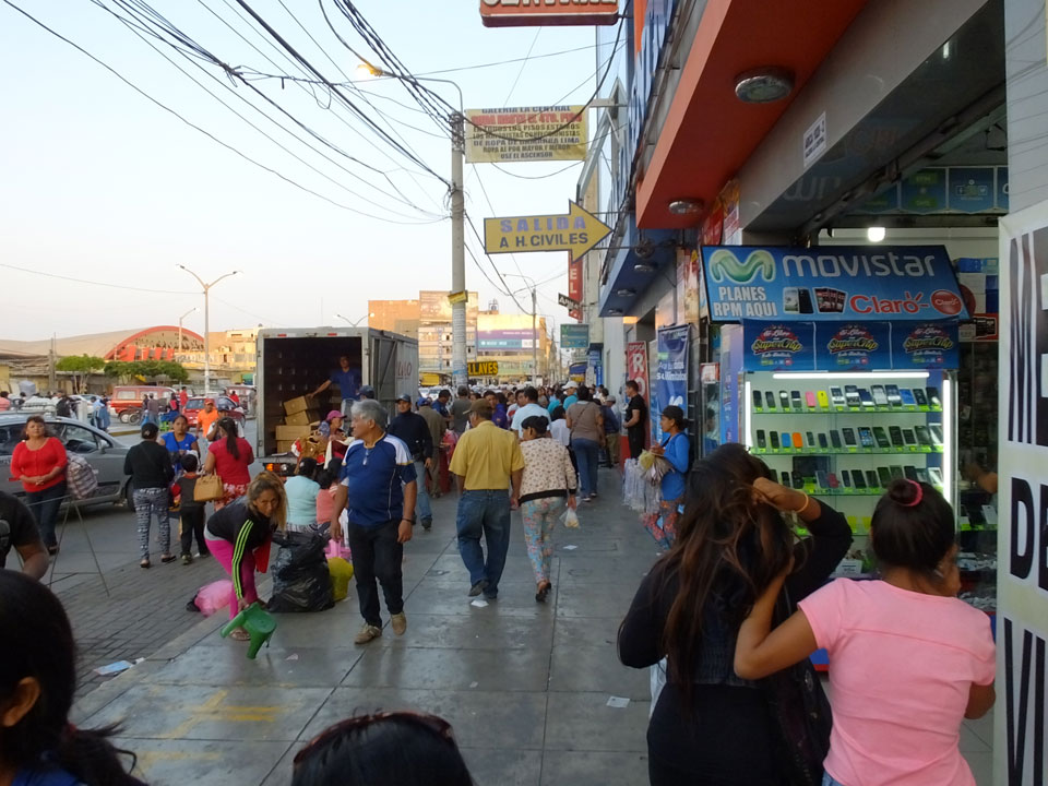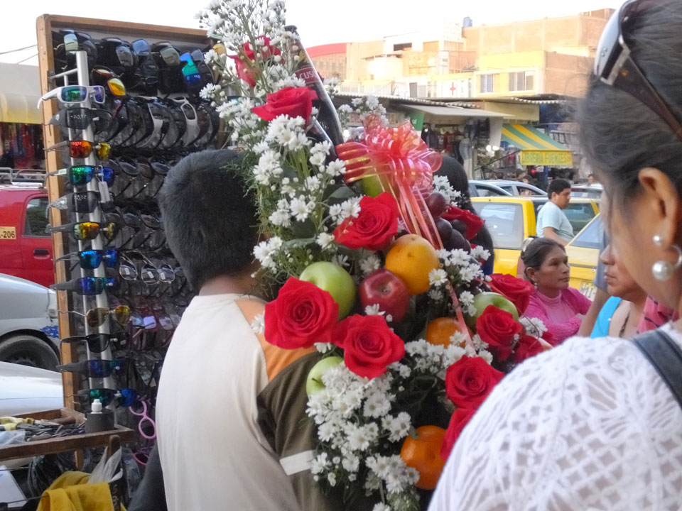 Um 17:00 dann ließ ich meine Sachen im Amigos zurück und drehte eine Runde durch Chiclayo. Die Stadt ist lebendig. Überall laufen Leute herum, werden Sachen verkauft, Autos hupen. Ich sah weit und breit keinen Ausländer. Mit meiner Fuji wurde ich etwas beäugt. Ganz so angenehm war mir die Sache nicht, da mein Ziel der Markt war. Ein paar Blöcke nördlich vom Plaza sammelten sich dort auch viele Stände mit allerlei. Wenn ich nur Platz hätte und die Sachen nicht schleppen müsste, würde ich schon ein paar Sachen finden. So aber blieb es bei hastigem Schritt durch die Gegend und einem langen Abendessen.