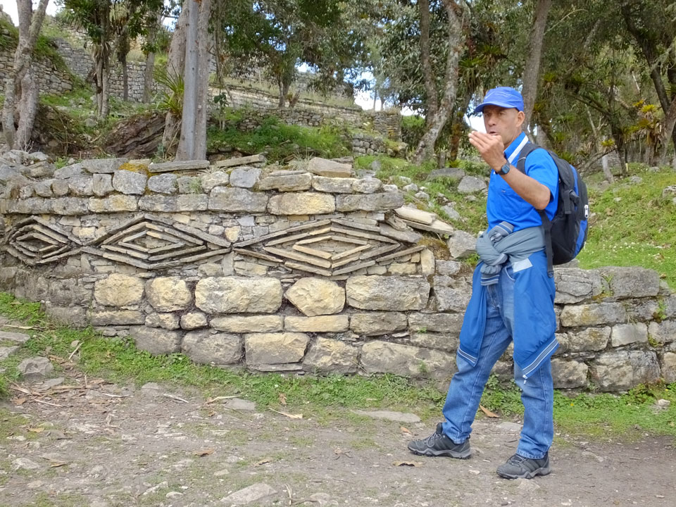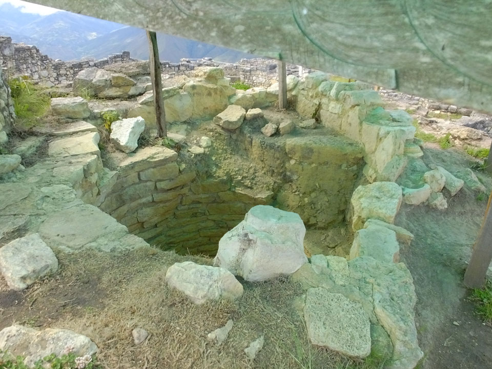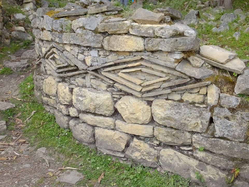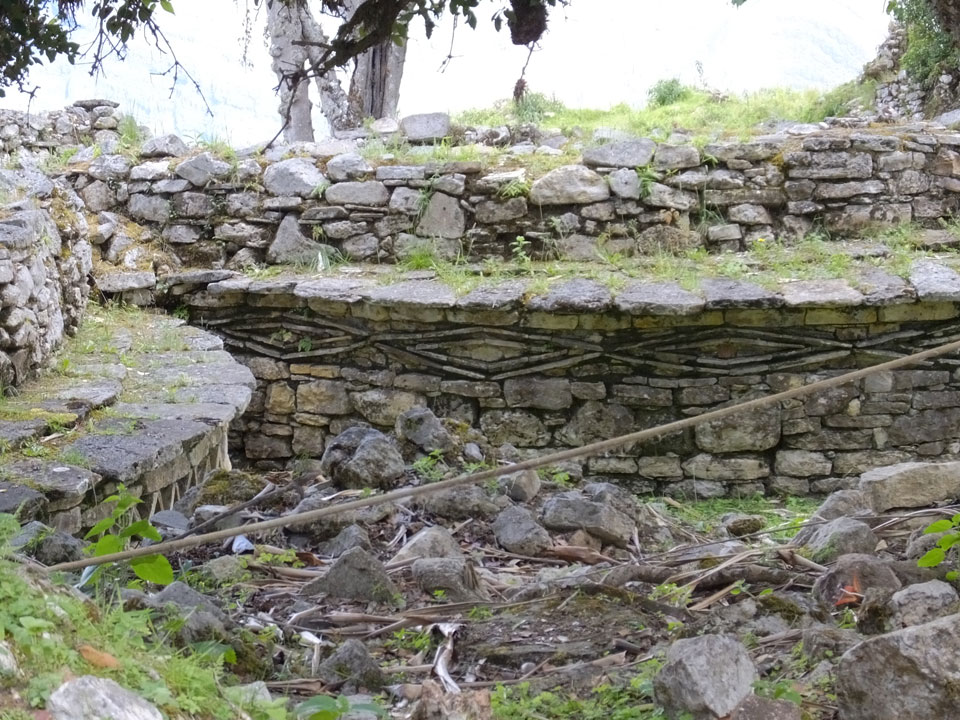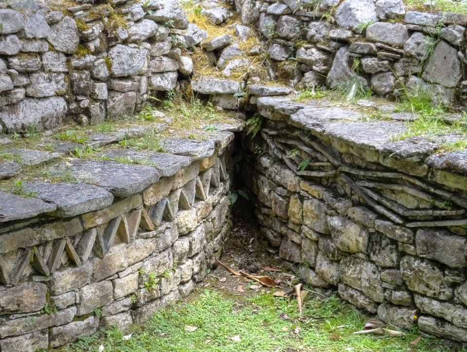 Kuelap war touristisch weit besser entwickelt, als ich das im Internet gelesen hatte. Wir wanderten zwischen den Ruinen herum. Ab und zu gab’s mal ein paar Hinweise, dass wohl Meerschweinchen im Haus gezüchtet oder Essen im Boden vergraben wurden. Ein Muster mit den 3 Trapezen war hier zu sehen, was auch immer noch populär in Chachapoyas ist. Irgendwas mit Erde Himmel und Geist oder was das symbolisiert. Habe ich vergessen.