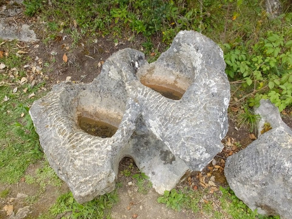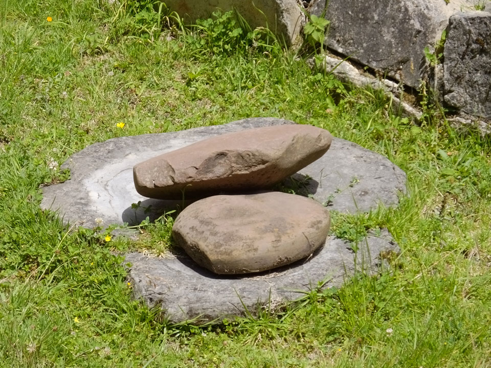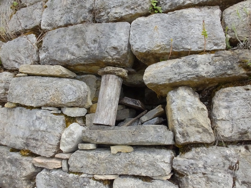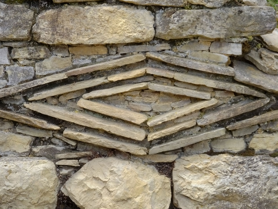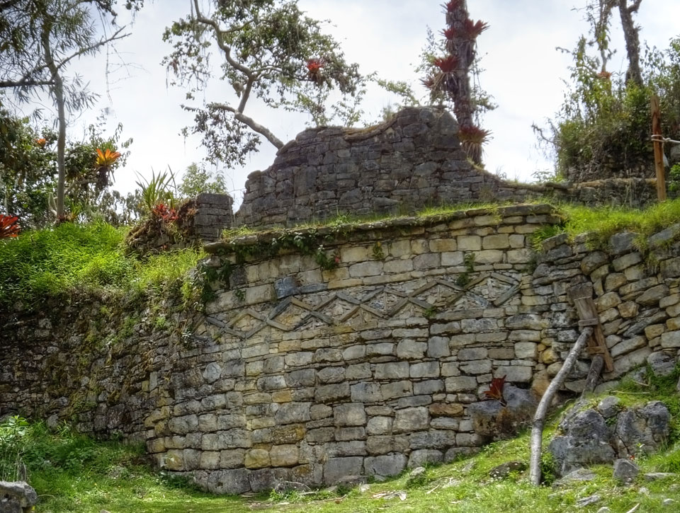 Kuelap war touristisch weit besser entwickelt, als ich das im Internet gelesen hatte. Wir wanderten zwischen den Ruinen herum. Ab und zu gab’s mal ein paar Hinweise, dass wohl Meerschweinchen im Haus gezüchtet oder Essen im Boden vergraben wurden. Ein Muster mit den 3 Trapezen war hier zu sehen, was auch immer noch populär in Chachapoyas ist. Irgendwas mit Erde Himmel und Geist oder was das symbolisiert. Habe ich vergessen.
