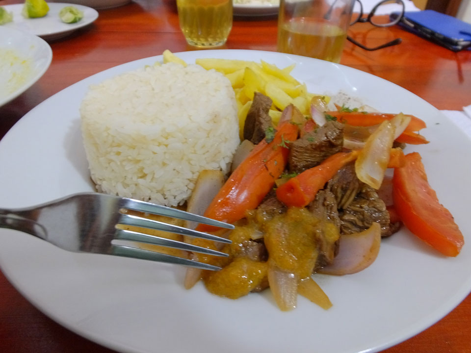 Warmes Wetter und aufkommender Hunger. Wir fuhren zum Restaurant, wo jeder schon seine Wünsche registriert hatte. Ich hatte das Lomo Saltado, wa sehr gut war. Am Tisch mit älteren Herrschaften. Ein paar, über 60, war mit dem Motorrad unterwegs. Na hoy! Ja, von Alaska aus starteten die Australier und brauchten ca. 6 Monate. Ich fand das natürlich super, weil ich bei weitem weniger abenteuerlich reise. Sie waren auch schon in ganz Westafrika, Mozambique usw. auch mit dem Motorrad. Die Vehikel fliegen einfach mit und der Mann war gut im reparieren. Was es nicht alles gibt!