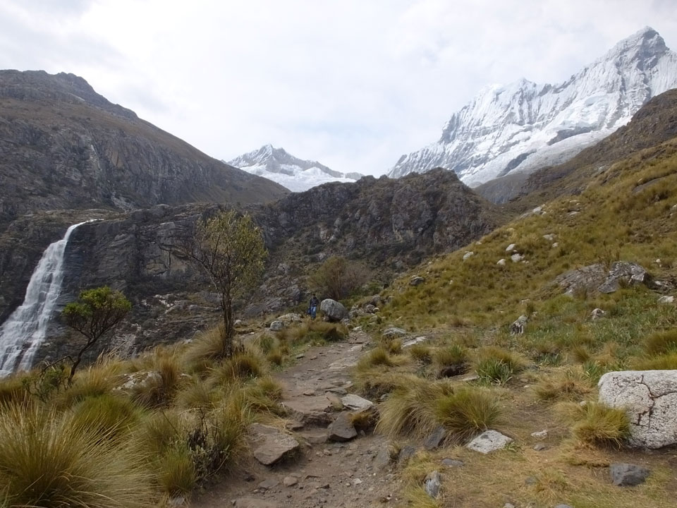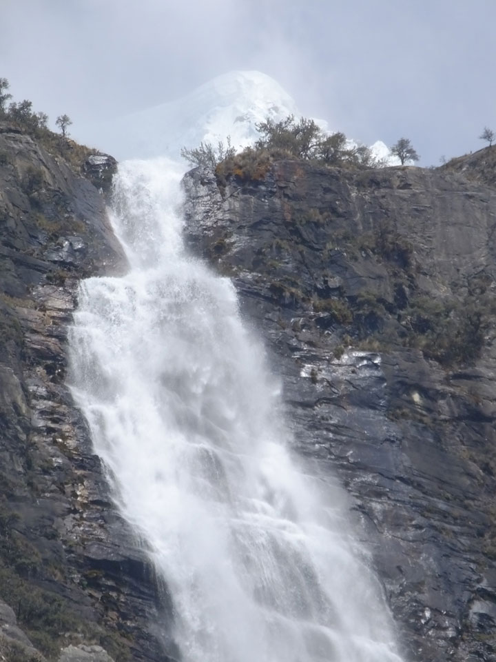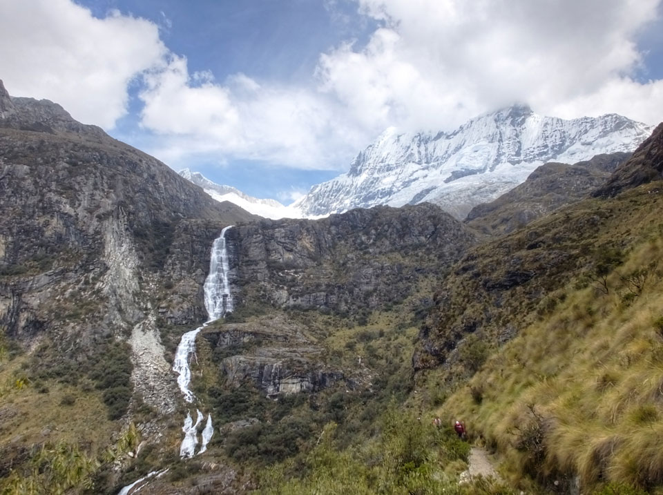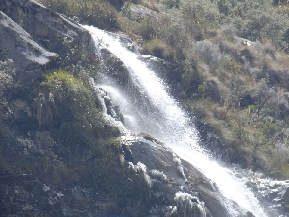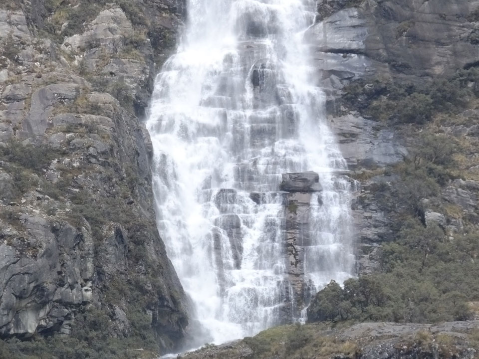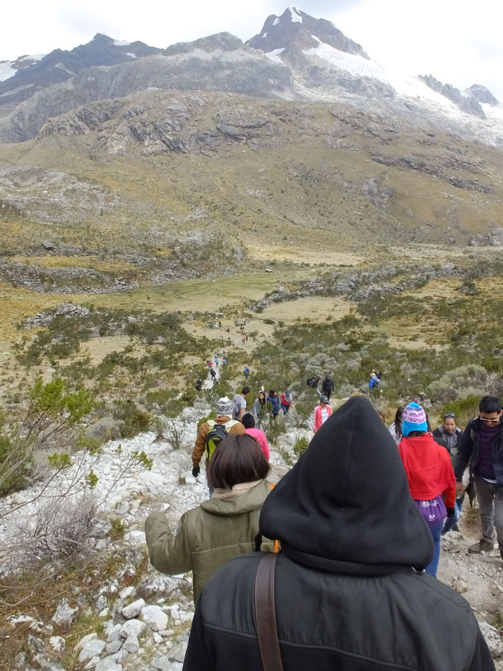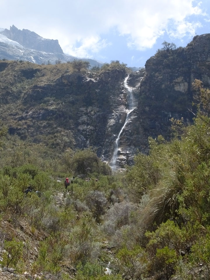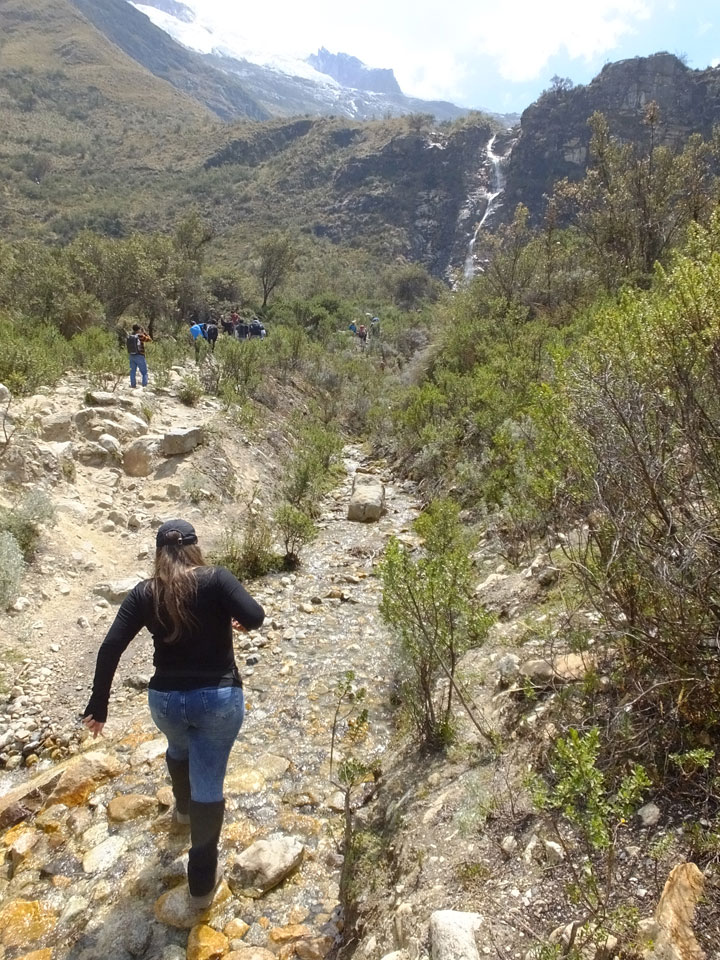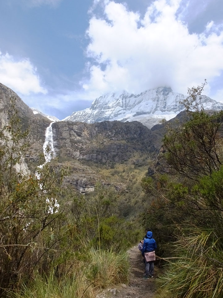 Der Huascan, mit über 6000m der höchste Berg Perus, thronte hinter uns. Ich drehte mich deswegen oft um, weil die Gegend einfach fantastisch aussah. Ringsum Berge, perfektes Wetter und ein gut ausgetretener Weg. Nach einer guten Stunde flachen Pfades, ging es dann bergauf. Vorbei an Wasserfällen ging es immer weiter in die Höhe, was ich doch mit der Puste merkte. Ich ging öfters mal schneller an Leuten vorbei und schloss dabei meinen Mund, versuchte nur über die Nase zu atmen. Ha! Die Rechnung folgte auf dem Fuß, weil ich dann schnell atemlos war. Der Egotrip, Höhenfitness zu faken, gab gute Schwindelanfälle.