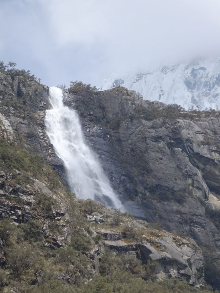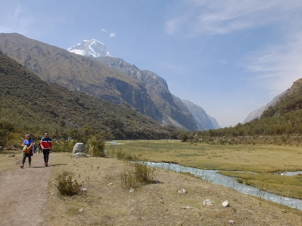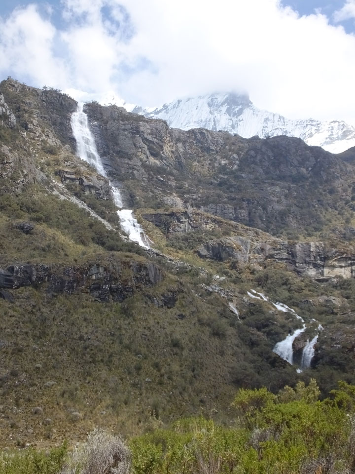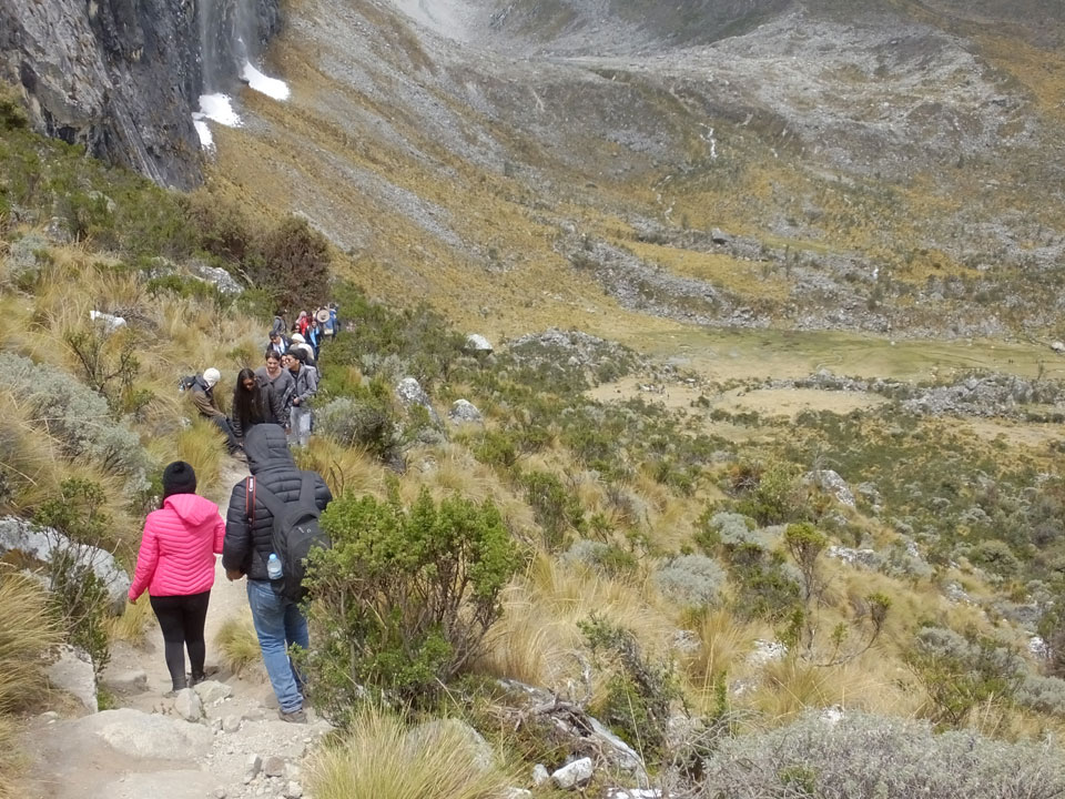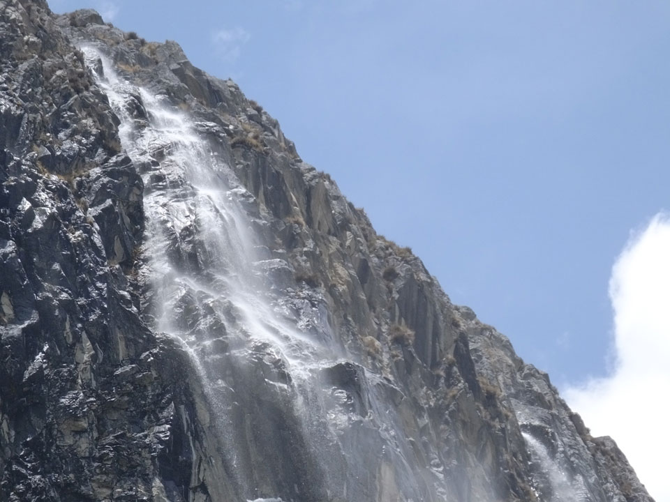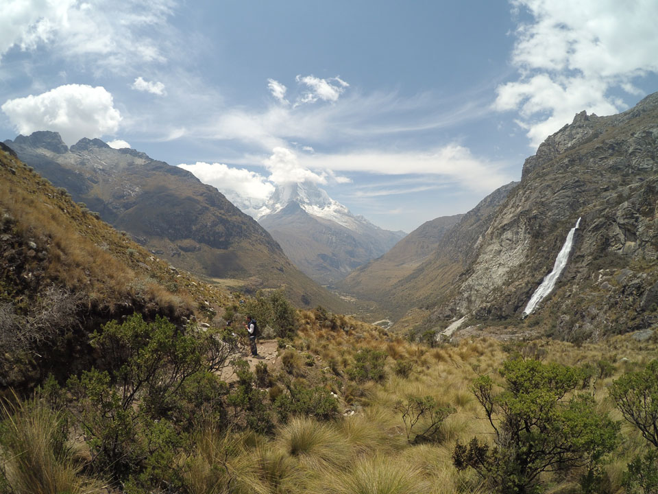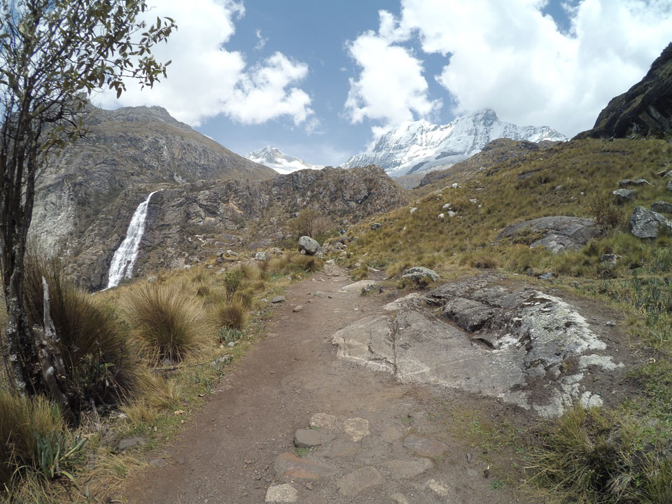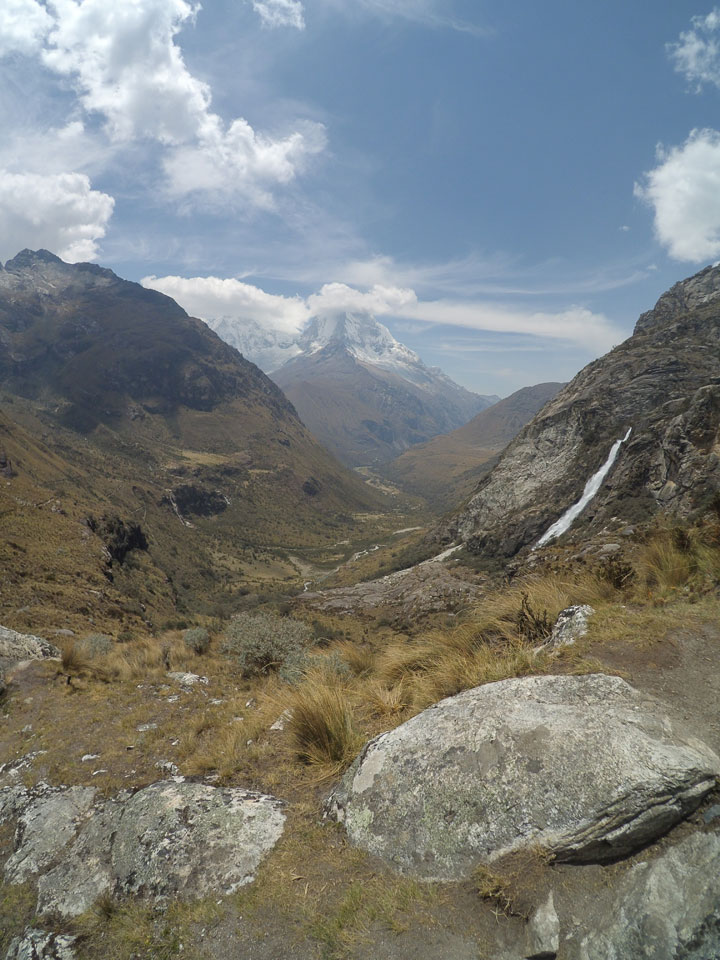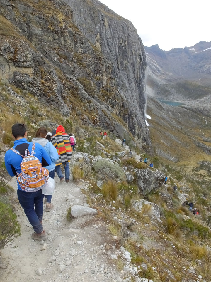 Der Huascan, mit über 6000m der höchste Berg Perus, thronte hinter uns. Ich drehte mich deswegen oft um, weil die Gegend einfach fantastisch aussah. Ringsum Berge, perfektes Wetter und ein gut ausgetretener Weg. Nach einer guten Stunde flachen Pfades, ging es dann bergauf. Vorbei an Wasserfällen ging es immer weiter in die Höhe, was ich doch mit der Puste merkte. Ich ging öfters mal schneller an Leuten vorbei und schloss dabei meinen Mund, versuchte nur über die Nase zu atmen. Ha! Die Rechnung folgte auf dem Fuß, weil ich dann schnell atemlos war. Der Egotrip, Höhenfitness zu faken, gab gute Schwindelanfälle.