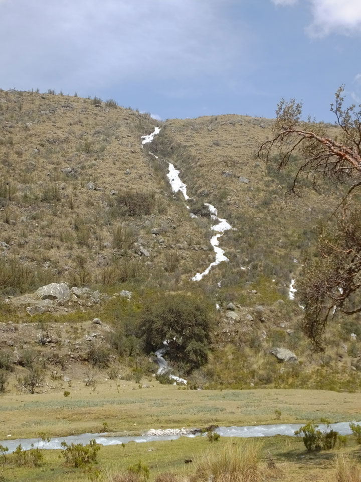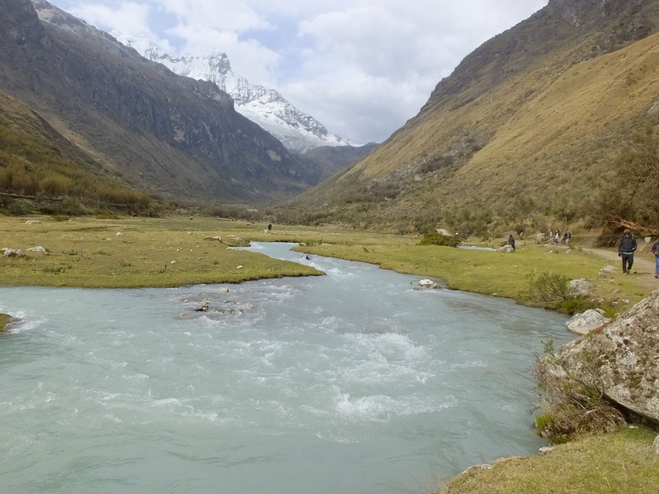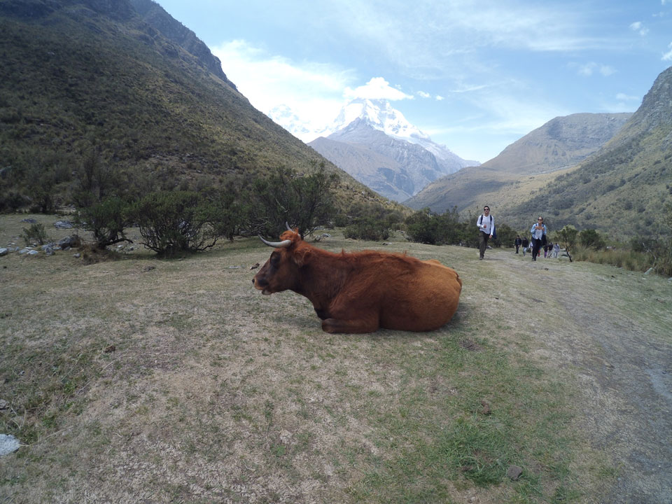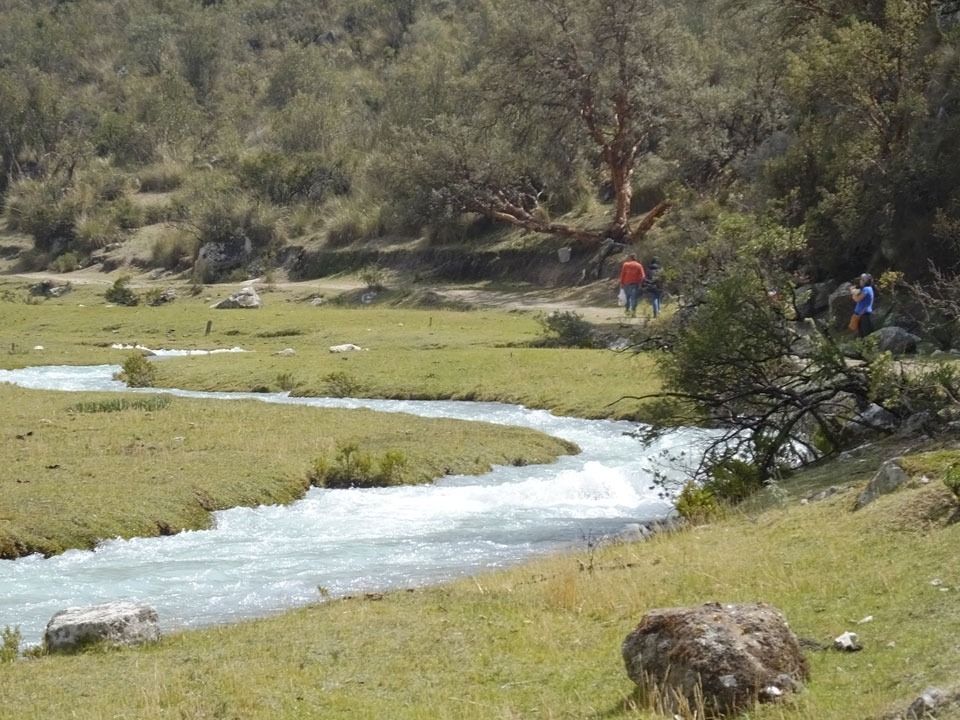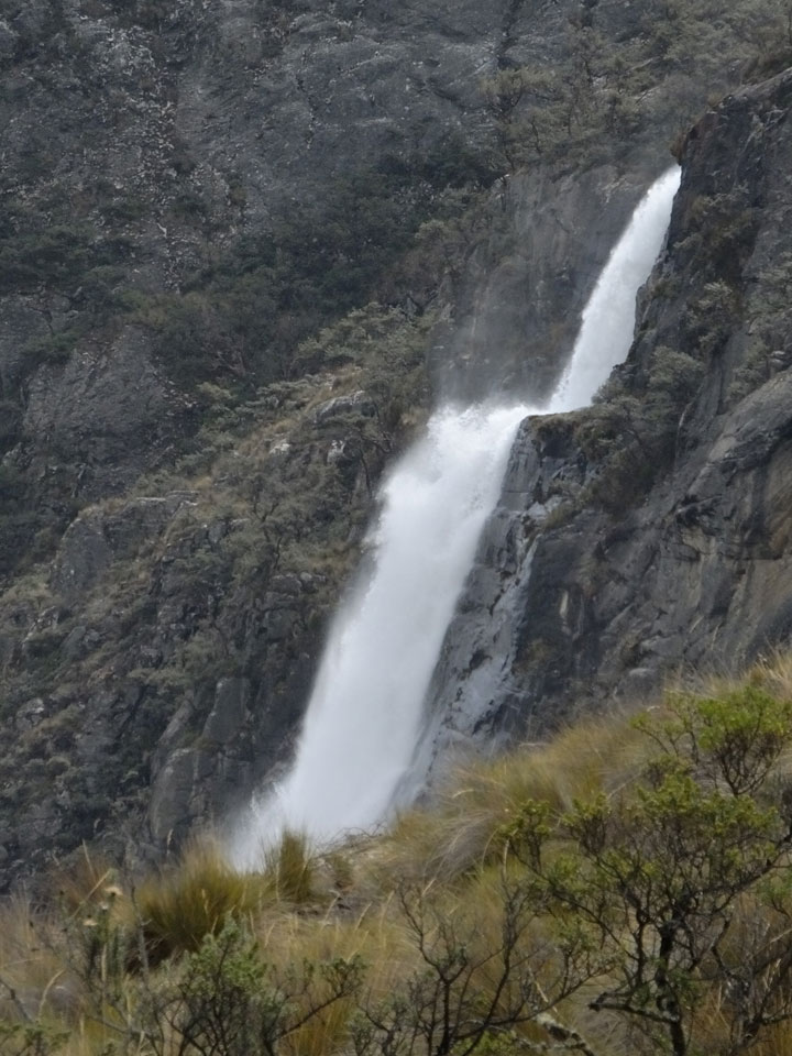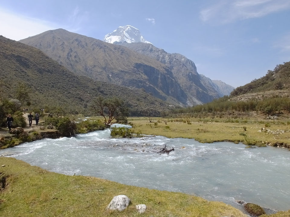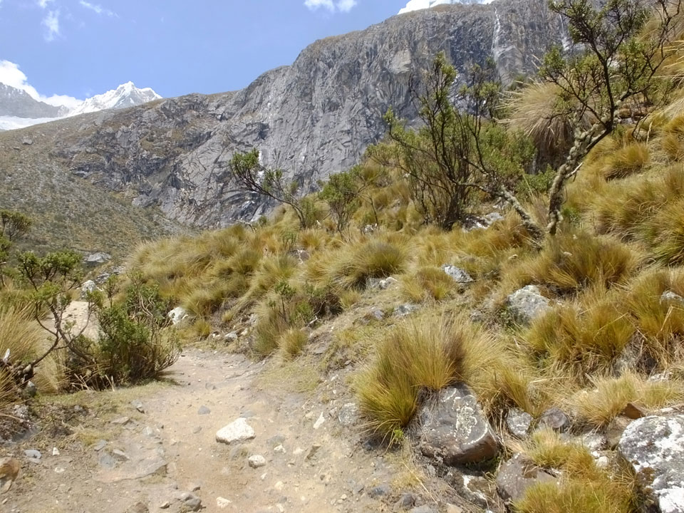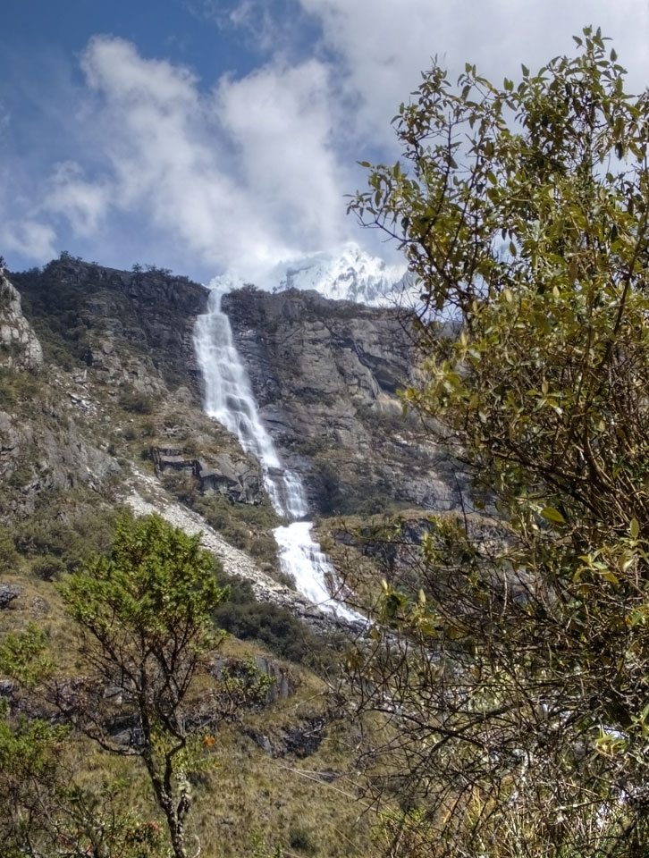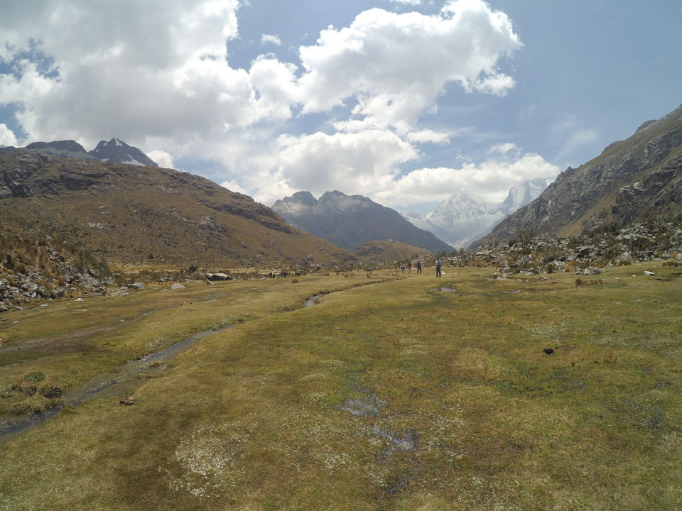 Der Huascan, mit über 6000m der höchste Berg Perus, thronte hinter uns. Ich drehte mich deswegen oft um, weil die Gegend einfach fantastisch aussah. Ringsum Berge, perfektes Wetter und ein gut ausgetretener Weg. Nach einer guten Stunde flachen Pfades, ging es dann bergauf. Vorbei an Wasserfällen ging es immer weiter in die Höhe, was ich doch mit der Puste merkte. Ich ging öfters mal schneller an Leuten vorbei und schloss dabei meinen Mund, versuchte nur über die Nase zu atmen. Ha! Die Rechnung folgte auf dem Fuß, weil ich dann schnell atemlos war. Der Egotrip, Höhenfitness zu faken, gab gute Schwindelanfälle.