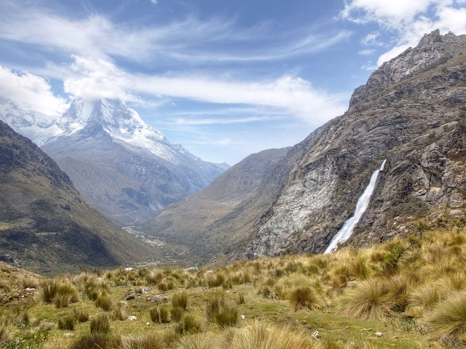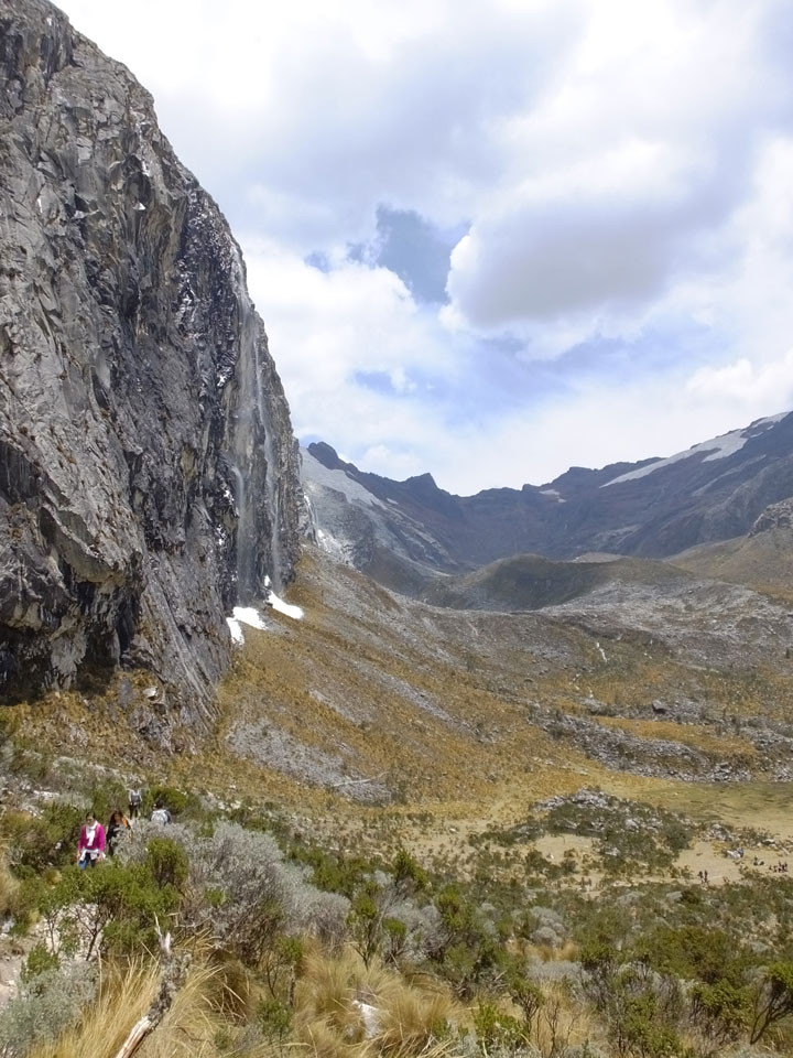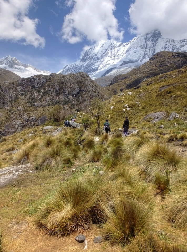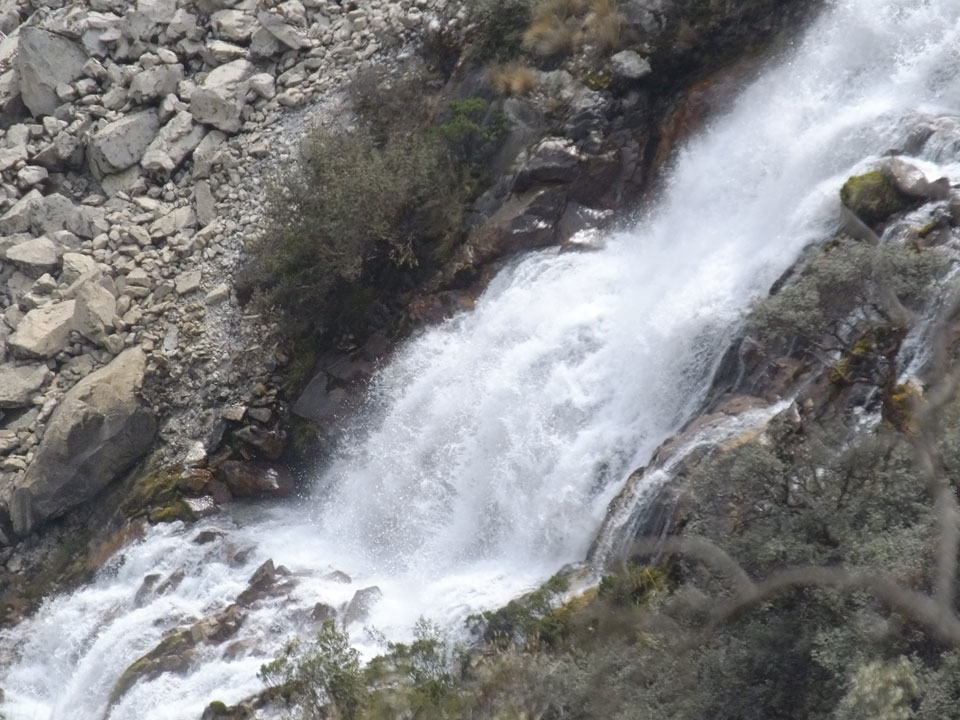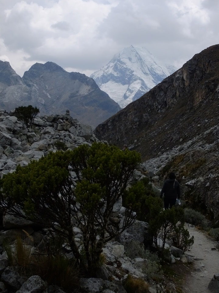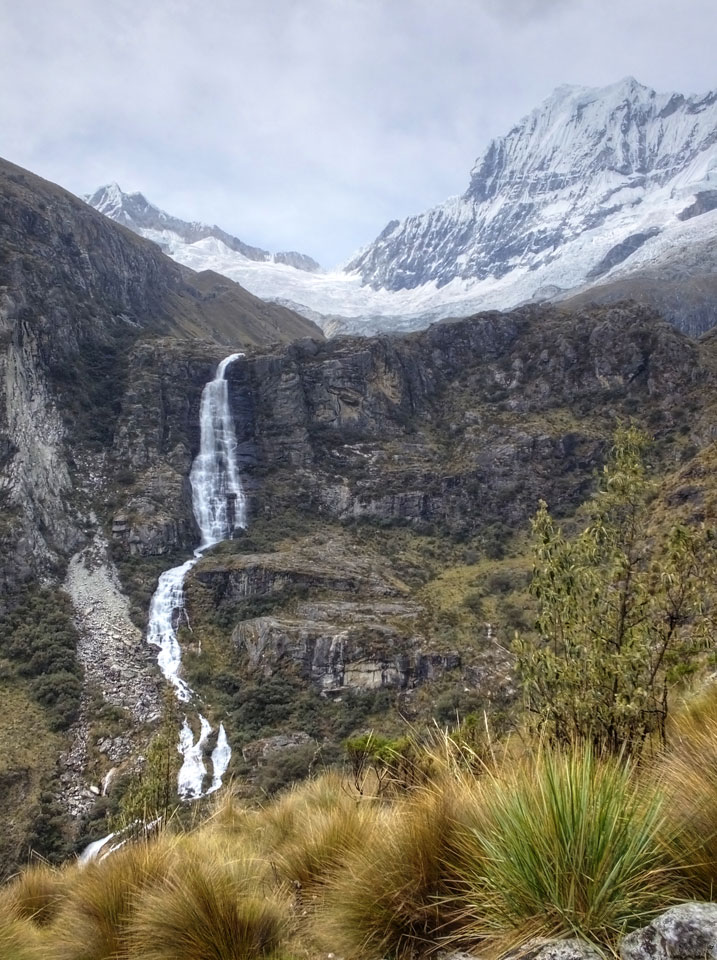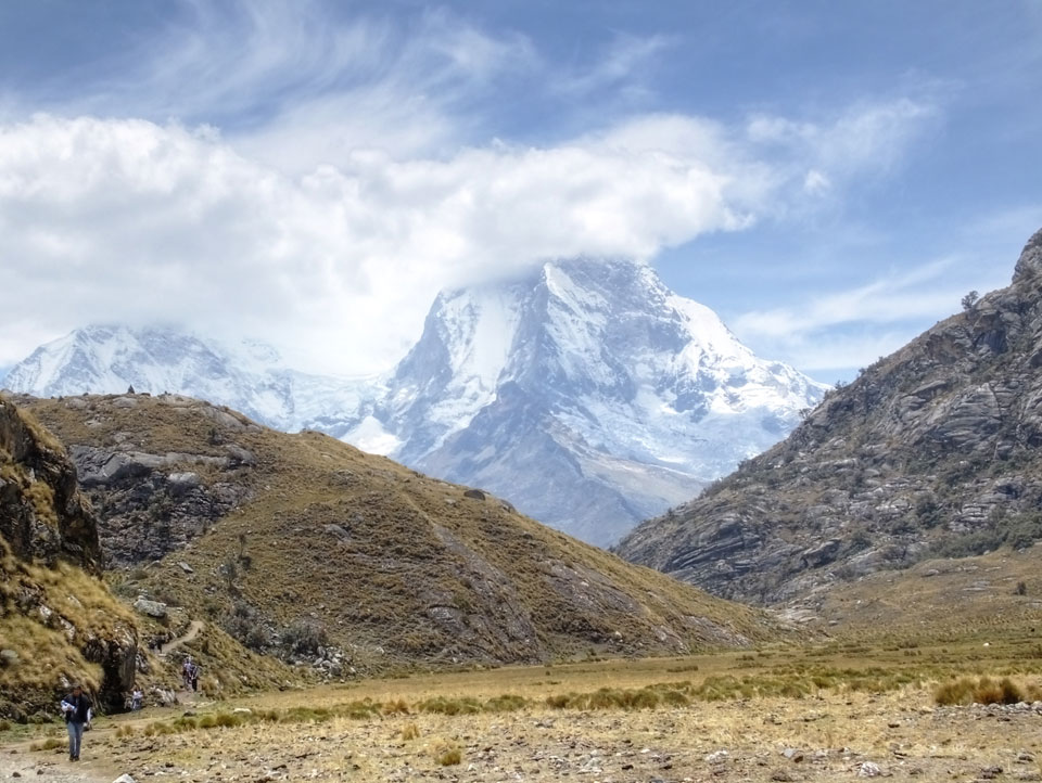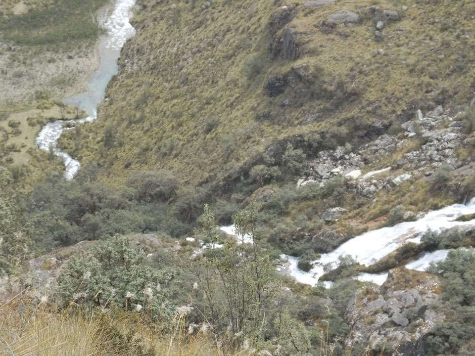 Der Huascan, mit über 6000m der höchste Berg Perus, thronte hinter uns. Ich drehte mich deswegen oft um, weil die Gegend einfach fantastisch aussah. Ringsum Berge, perfektes Wetter und ein gut ausgetretener Weg. Nach einer guten Stunde flachen Pfades, ging es dann bergauf. Vorbei an Wasserfällen ging es immer weiter in die Höhe, was ich doch mit der Puste merkte. Ich ging öfters mal schneller an Leuten vorbei und schloss dabei meinen Mund, versuchte nur über die Nase zu atmen. Ha! Die Rechnung folgte auf dem Fuß, weil ich dann schnell atemlos war. Der Egotrip, Höhenfitness zu faken, gab gute Schwindelanfälle.