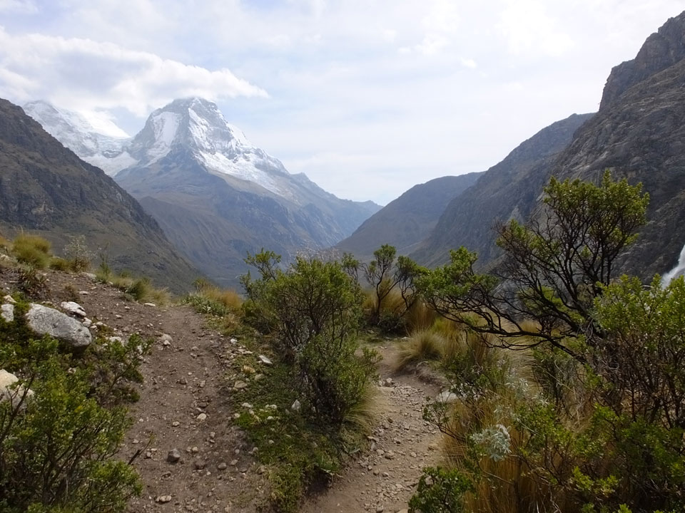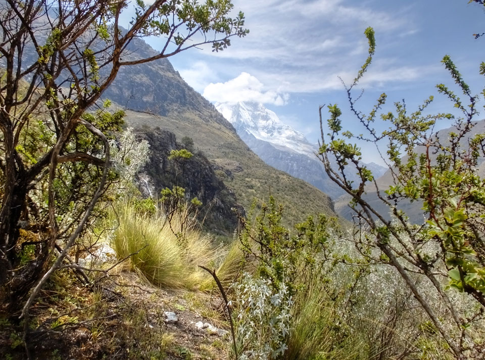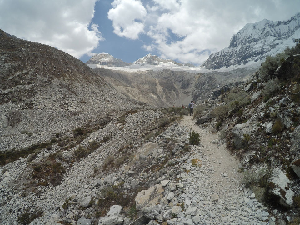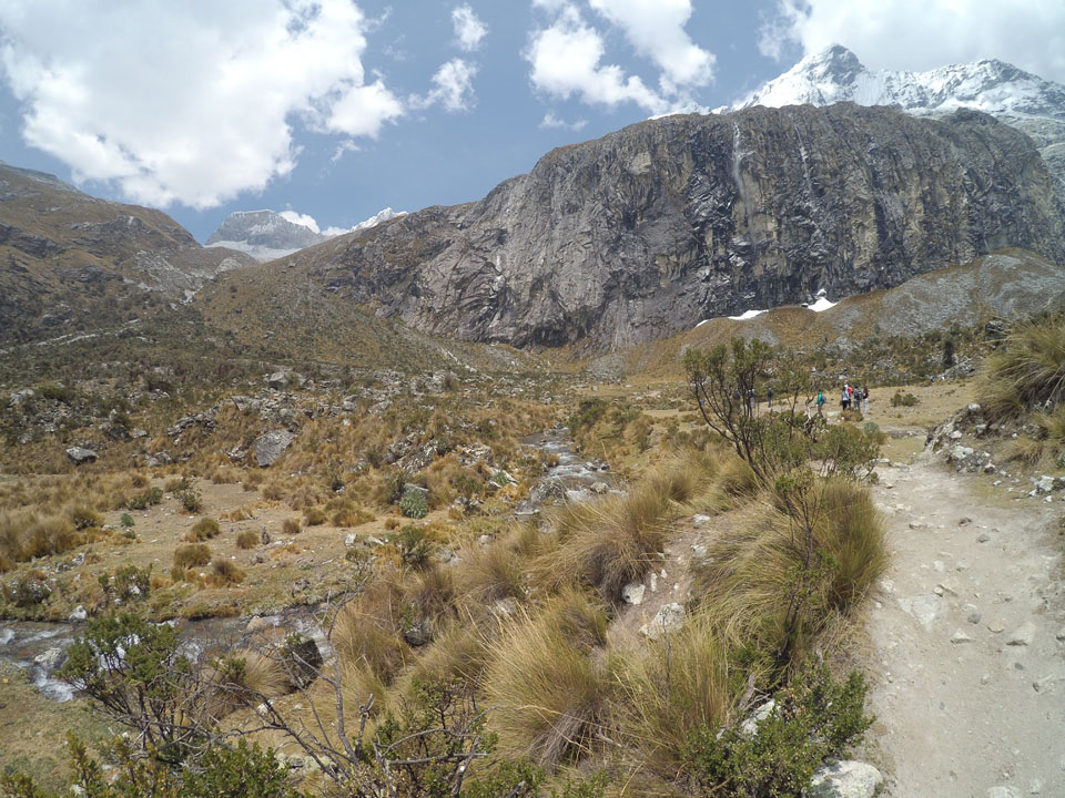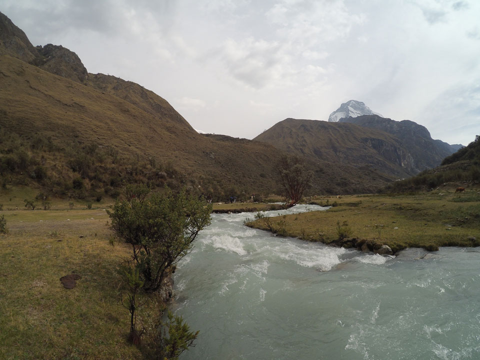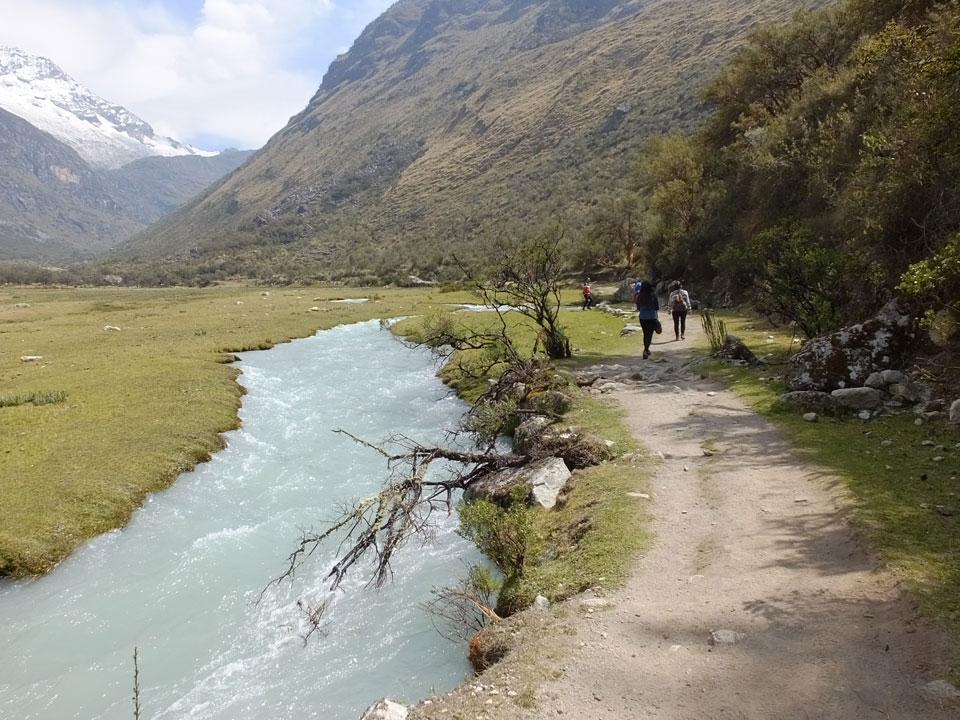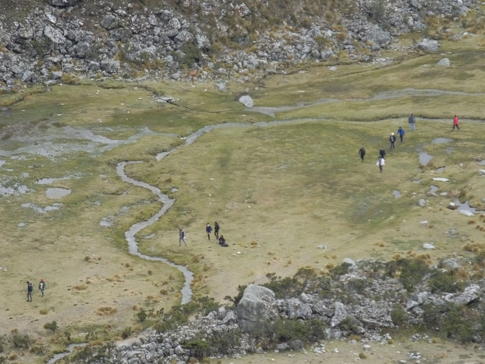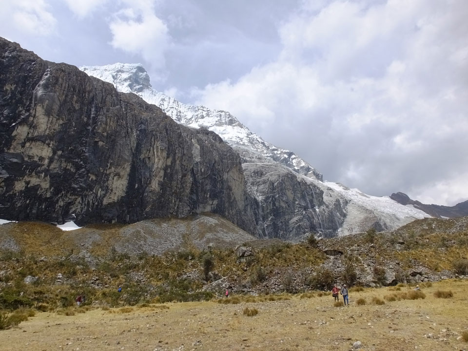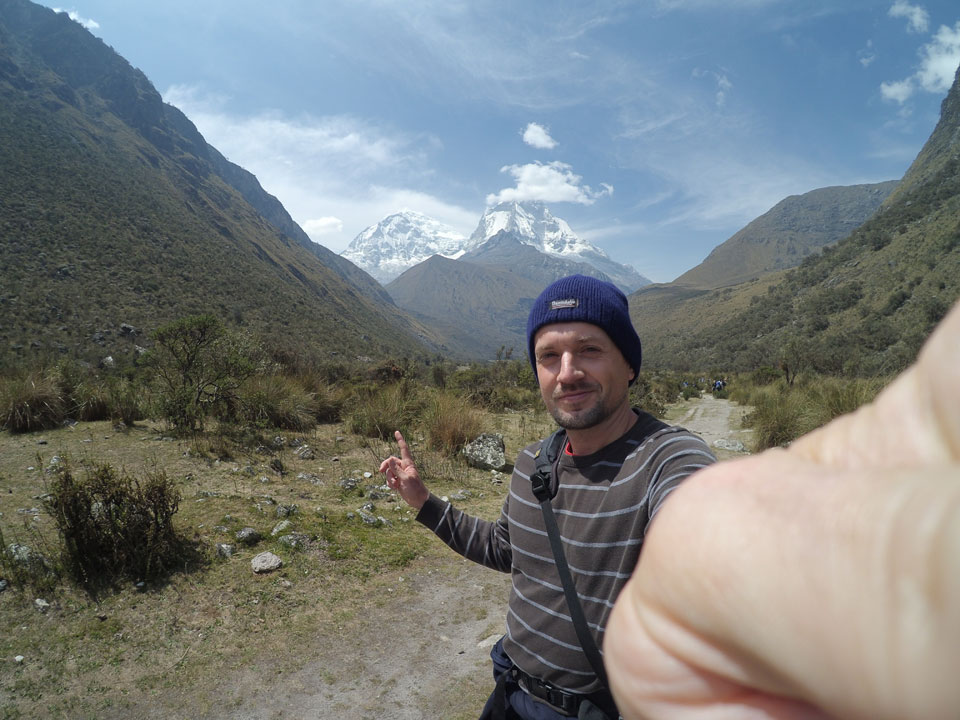Der Huascan, mit über 6000m der höchste Berg Perus, thronte hinter uns. Ich drehte mich deswegen oft um, weil die Gegend einfach fantastisch aussah. Ringsum Berge, perfektes Wetter und ein gut ausgetretener Weg. Nach einer guten Stunde flachen Pfades, ging es dann bergauf. Vorbei an Wasserfällen ging es immer weiter in die Höhe, was ich doch mit der Puste merkte. Ich ging öfters mal schneller an Leuten vorbei und schloss dabei meinen Mund, versuchte nur über die Nase zu atmen. Ha! Die Rechnung folgte auf dem Fuß, weil ich dann schnell atemlos war. Der Egotrip, Höhenfitness zu faken, gab gute Schwindelanfälle.