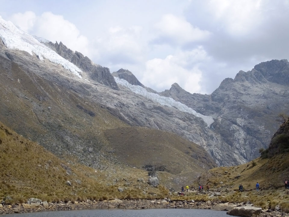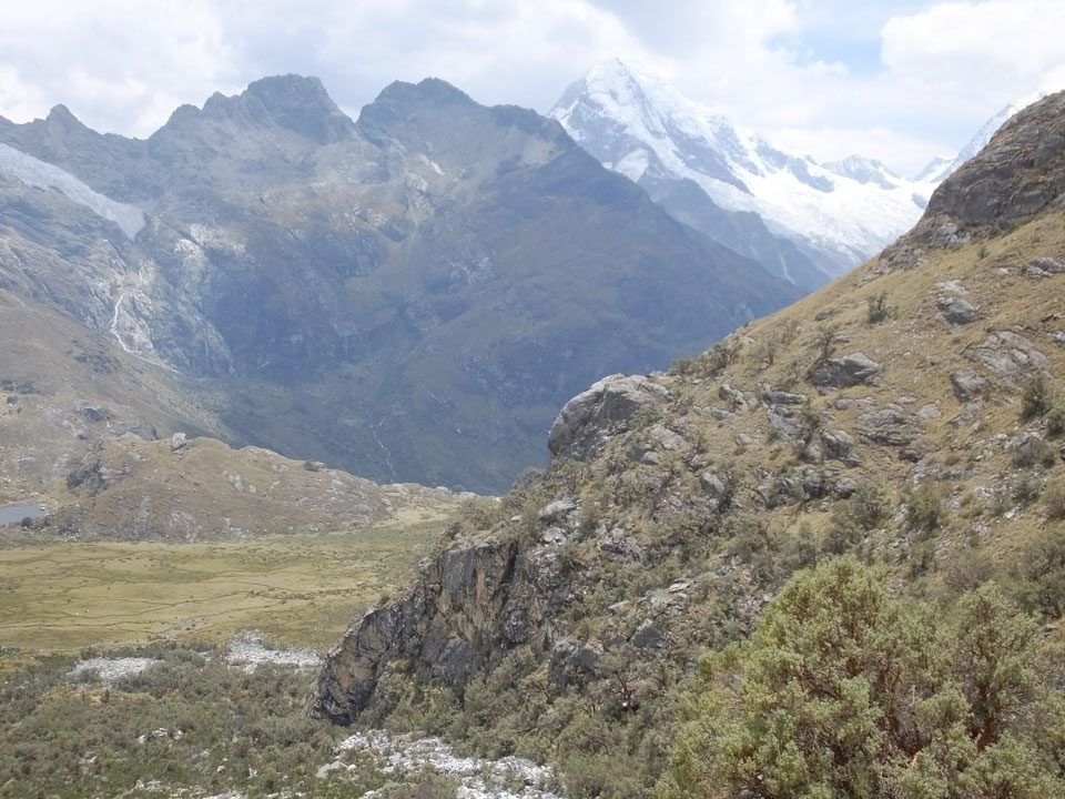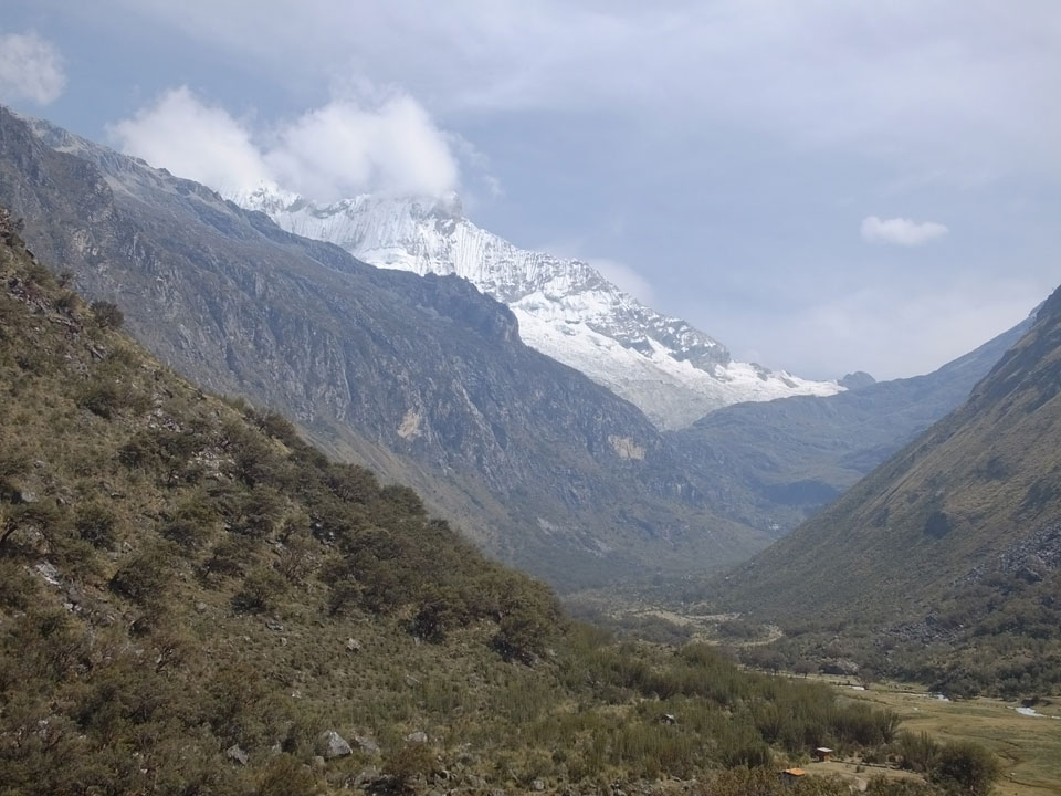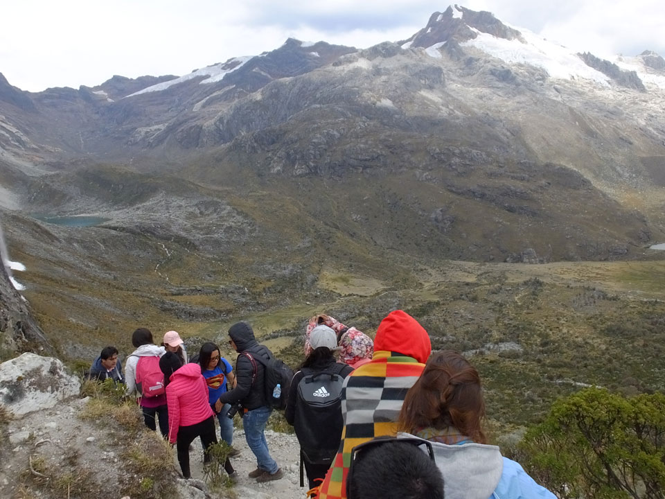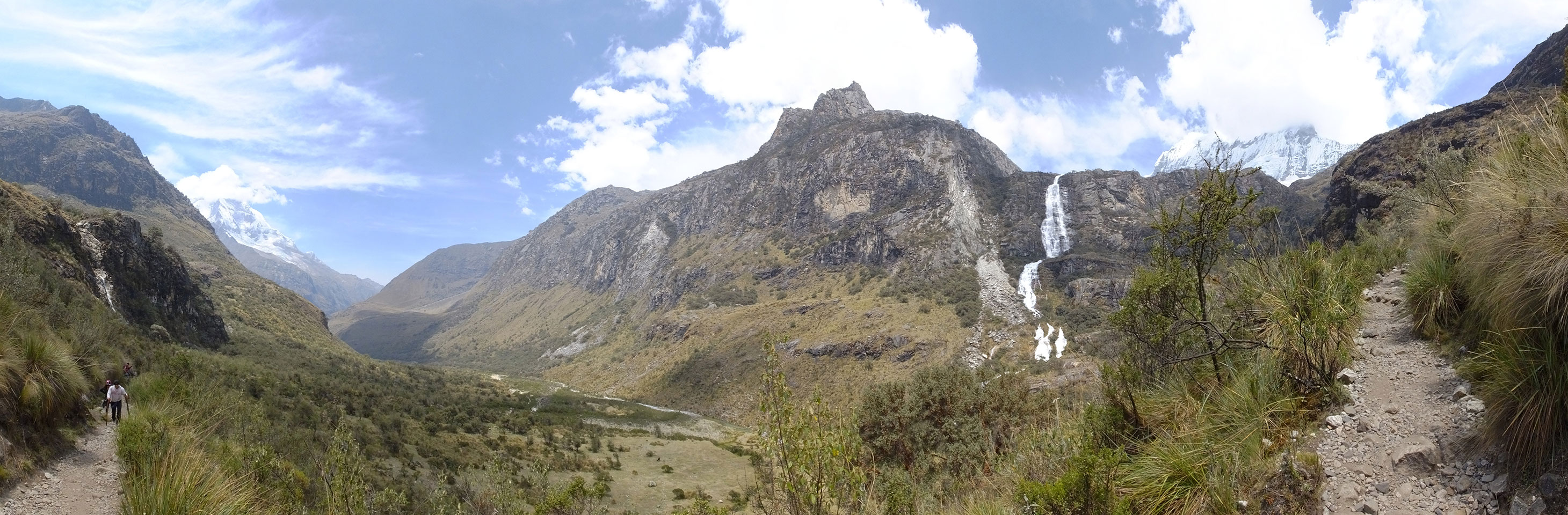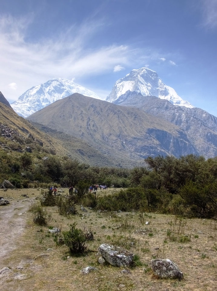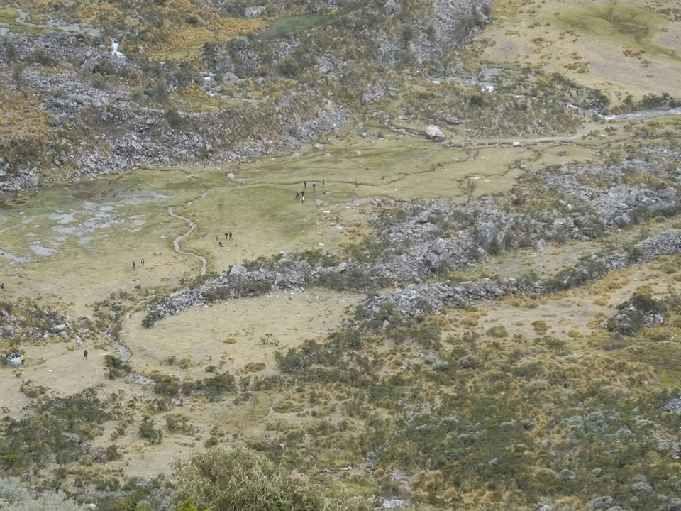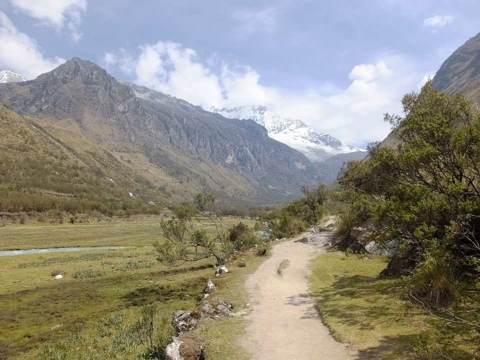 Der Huascan, mit über 6000m der höchste Berg Perus, thronte hinter uns. Ich drehte mich deswegen oft um, weil die Gegend einfach fantastisch aussah. Ringsum Berge, perfektes Wetter und ein gut ausgetretener Weg. Nach einer guten Stunde flachen Pfades, ging es dann bergauf. Vorbei an Wasserfällen ging es immer weiter in die Höhe, was ich doch mit der Puste merkte. Ich ging öfters mal schneller an Leuten vorbei und schloss dabei meinen Mund, versuchte nur über die Nase zu atmen. Ha! Die Rechnung folgte auf dem Fuß, weil ich dann schnell atemlos war. Der Egotrip, Höhenfitness zu faken, gab gute Schwindelanfälle.