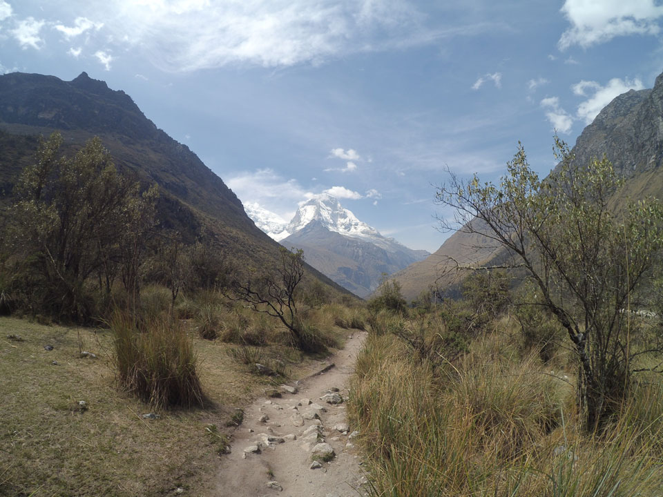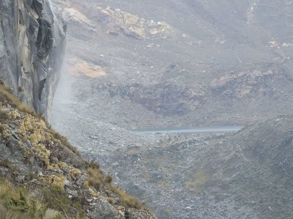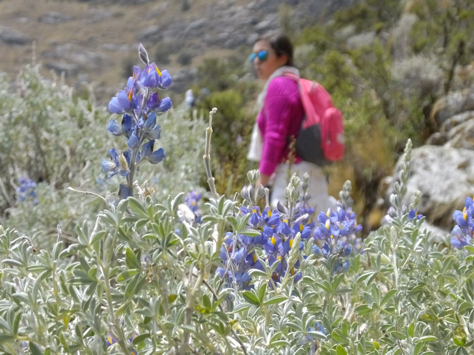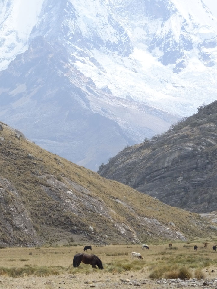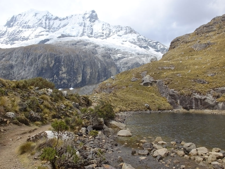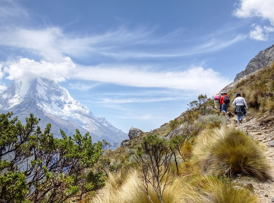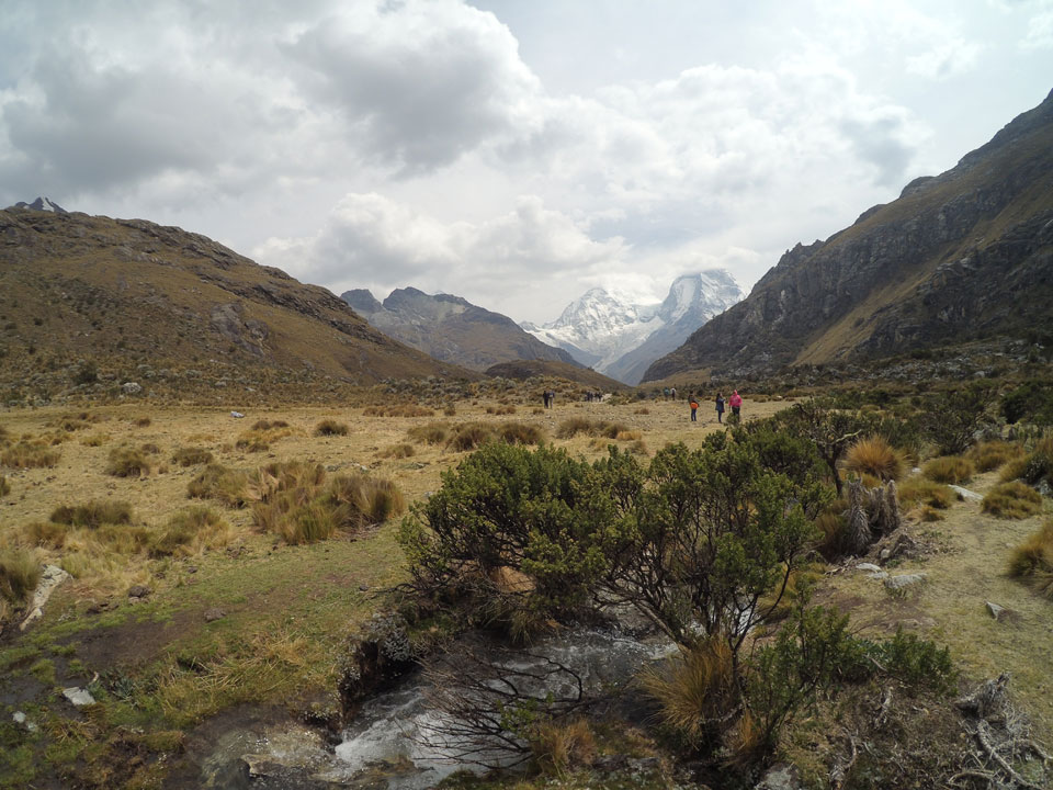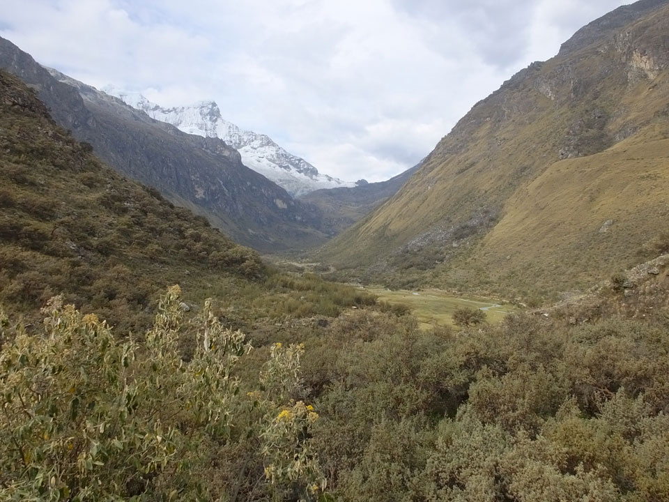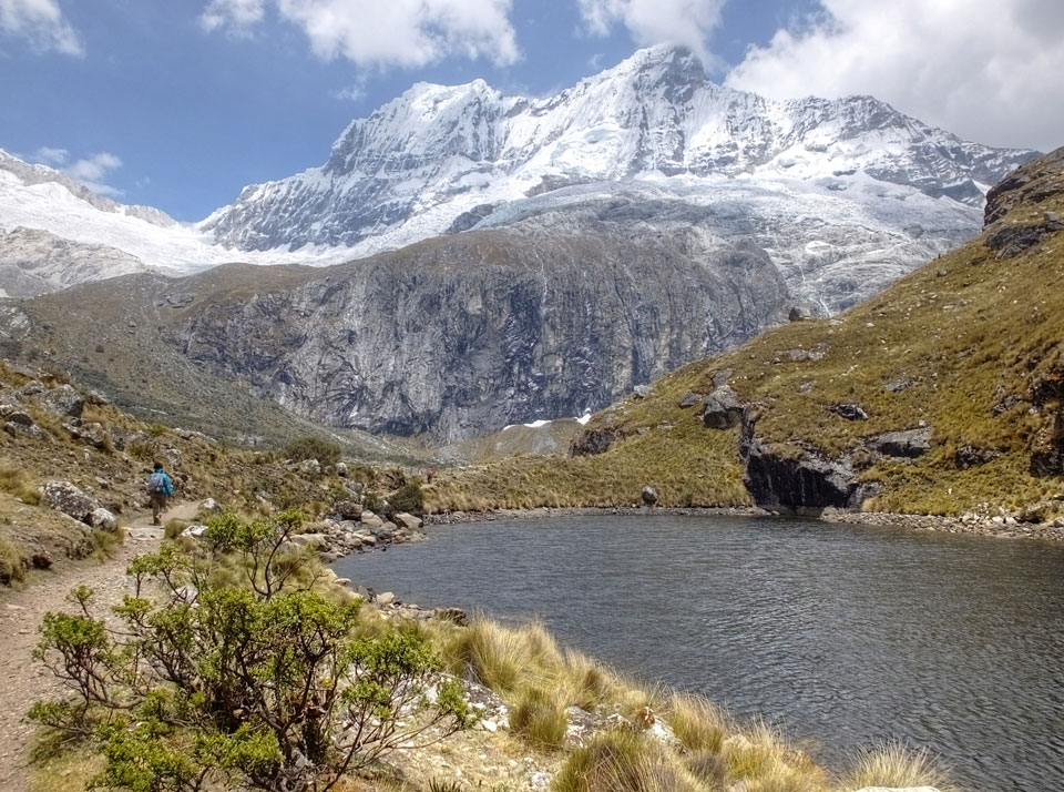 Der Huascan, mit über 6000m der höchste Berg Perus, thronte hinter uns. Ich drehte mich deswegen oft um, weil die Gegend einfach fantastisch aussah. Ringsum Berge, perfektes Wetter und ein gut ausgetretener Weg. Nach einer guten Stunde flachen Pfades, ging es dann bergauf. Vorbei an Wasserfällen ging es immer weiter in die Höhe, was ich doch mit der Puste merkte. Ich ging öfters mal schneller an Leuten vorbei und schloss dabei meinen Mund, versuchte nur über die Nase zu atmen. Ha! Die Rechnung folgte auf dem Fuß, weil ich dann schnell atemlos war. Der Egotrip, Höhenfitness zu faken, gab gute Schwindelanfälle.